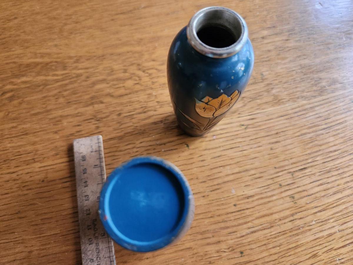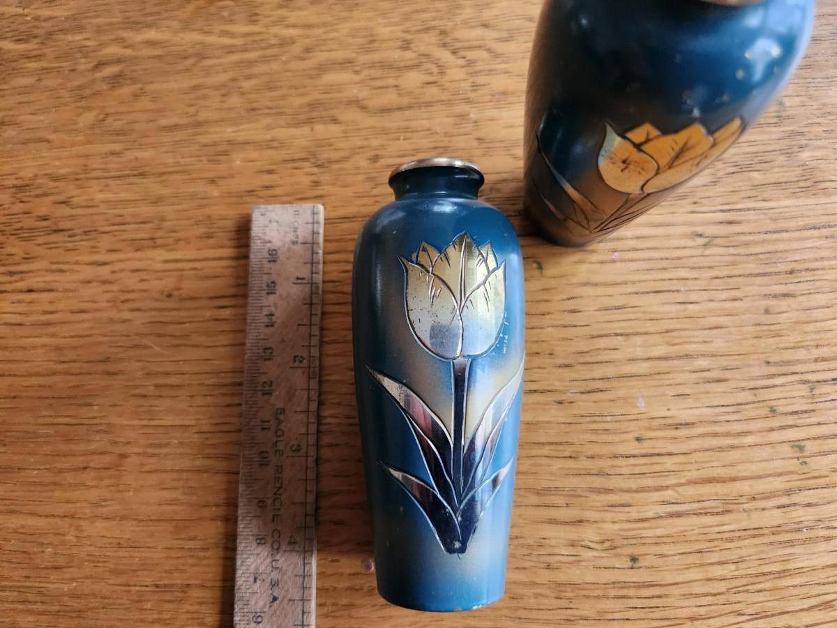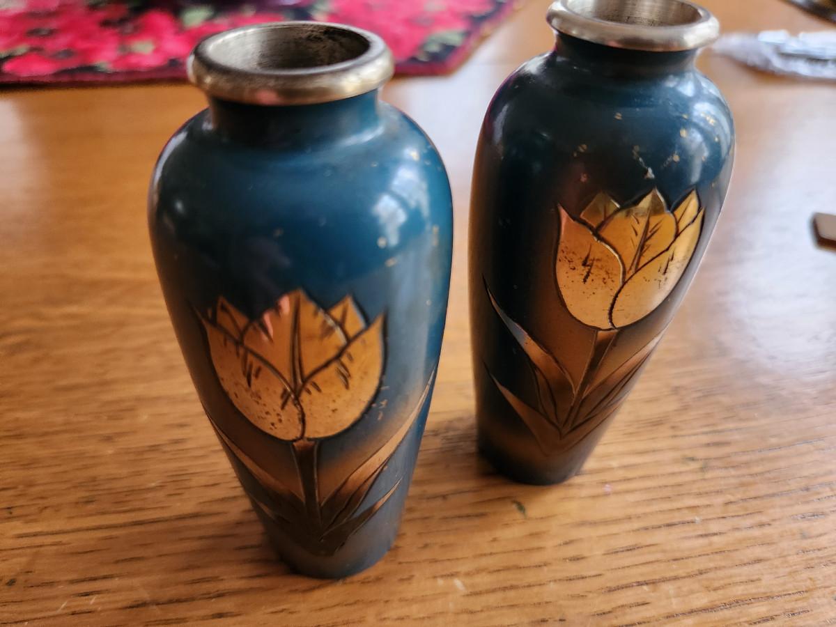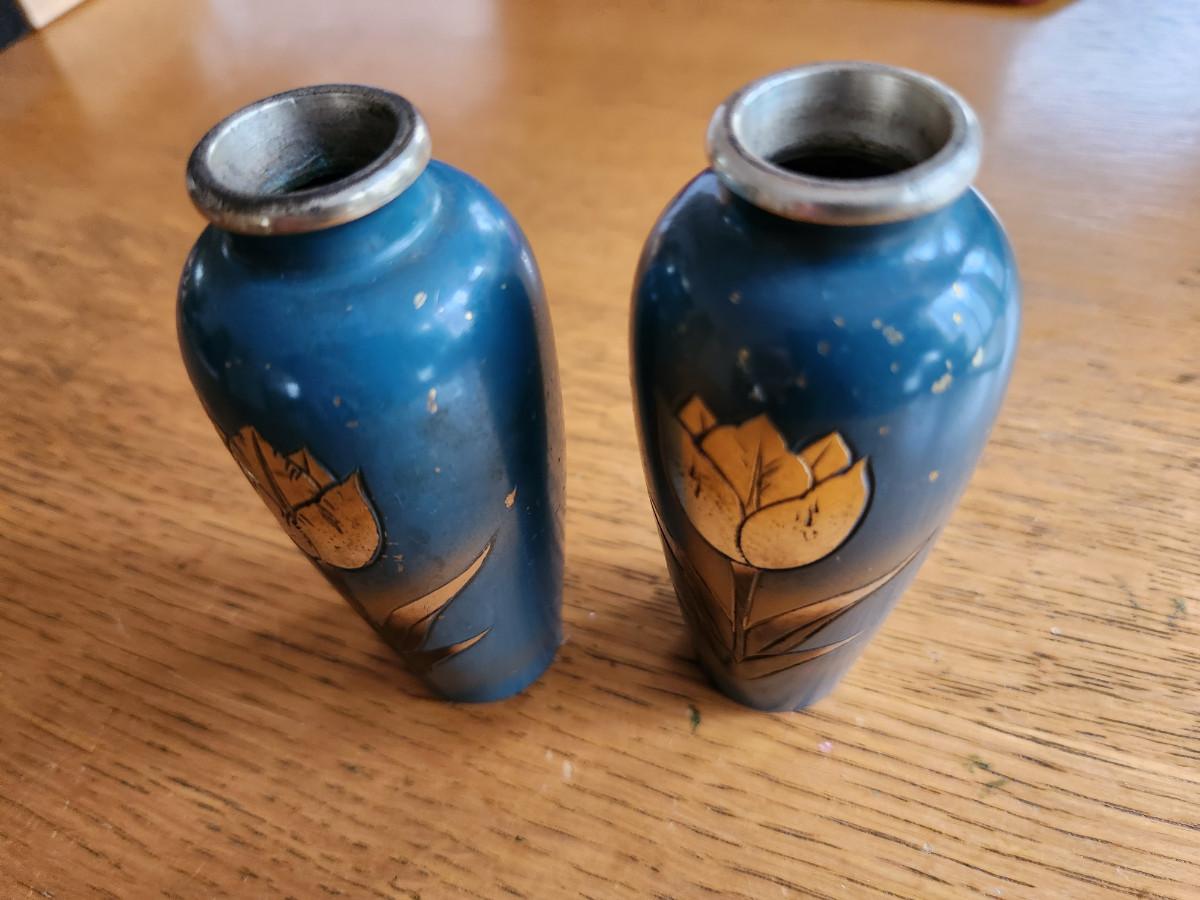 This auction lot is for a Pair of Metal Turned and Decorated Vases. These handsome small vases would show perfectly on a shelf or sitting proudly in a nice cabinet cabinet. Heavy for their size.