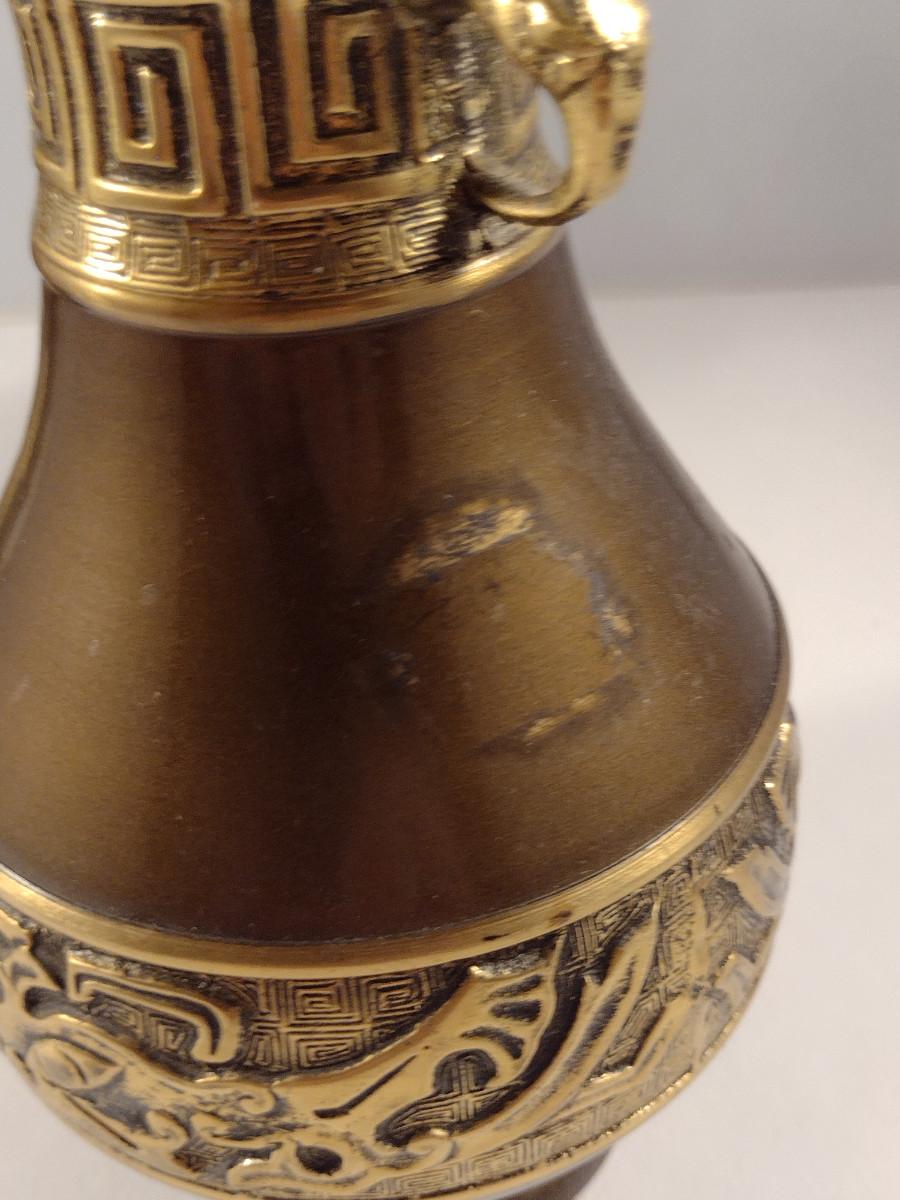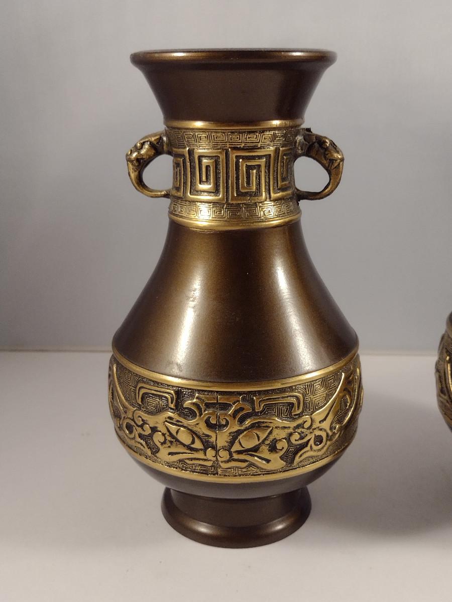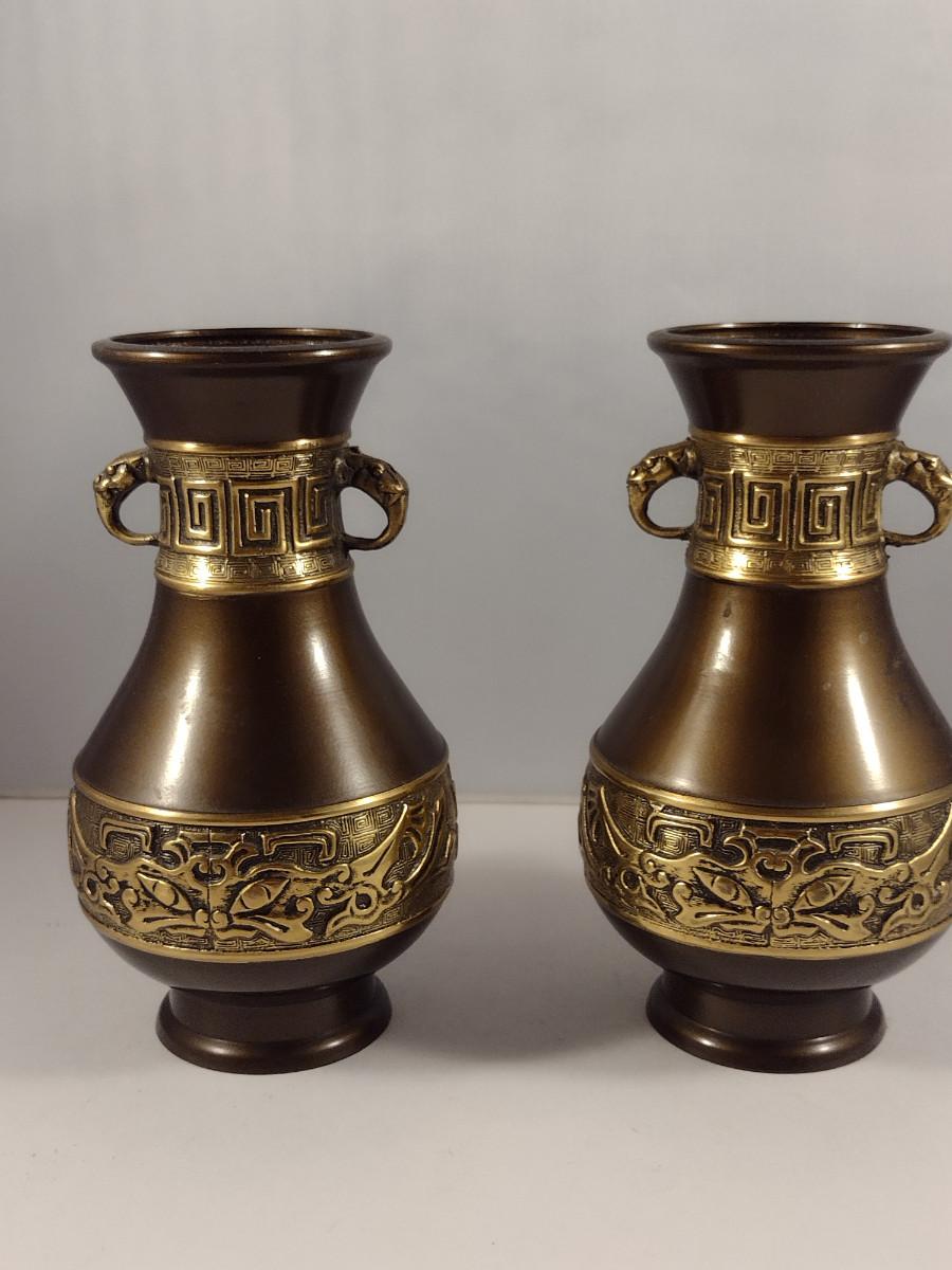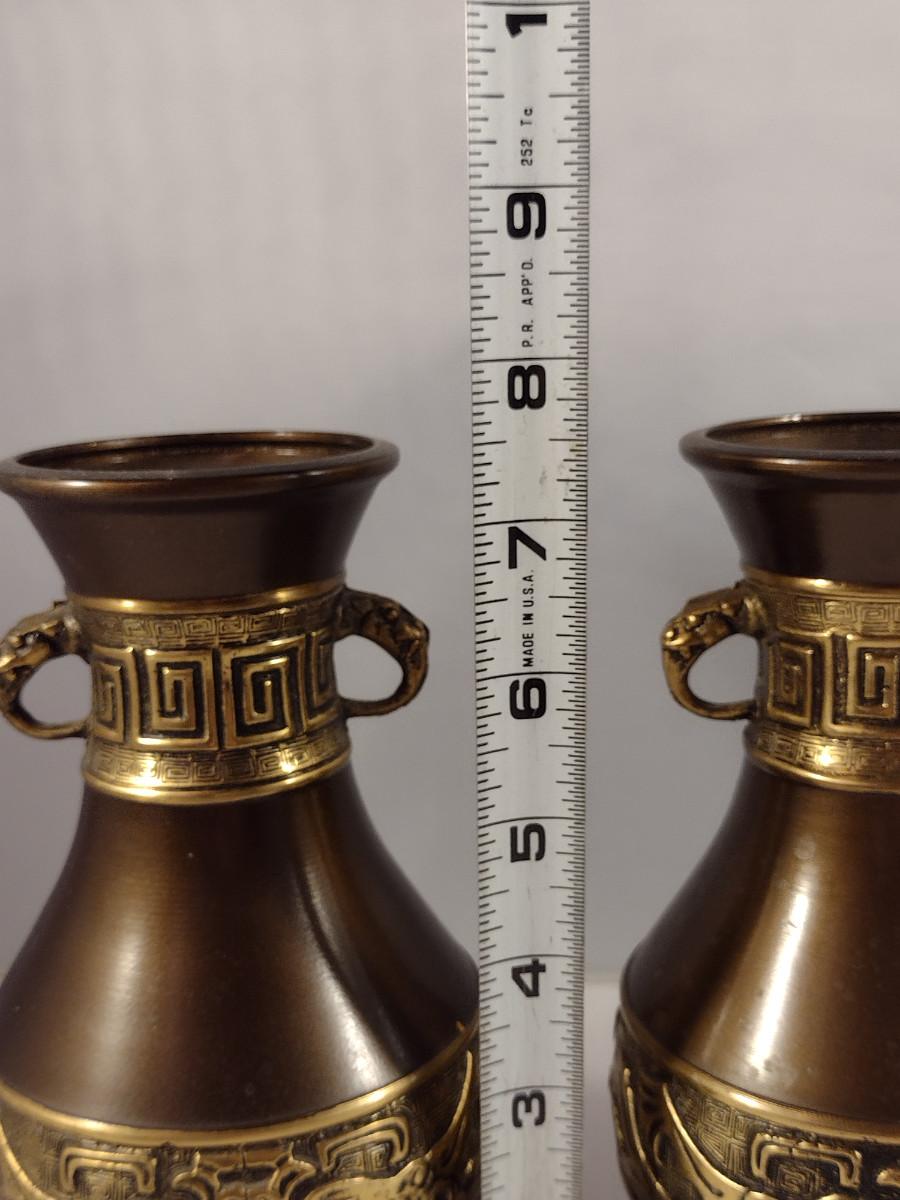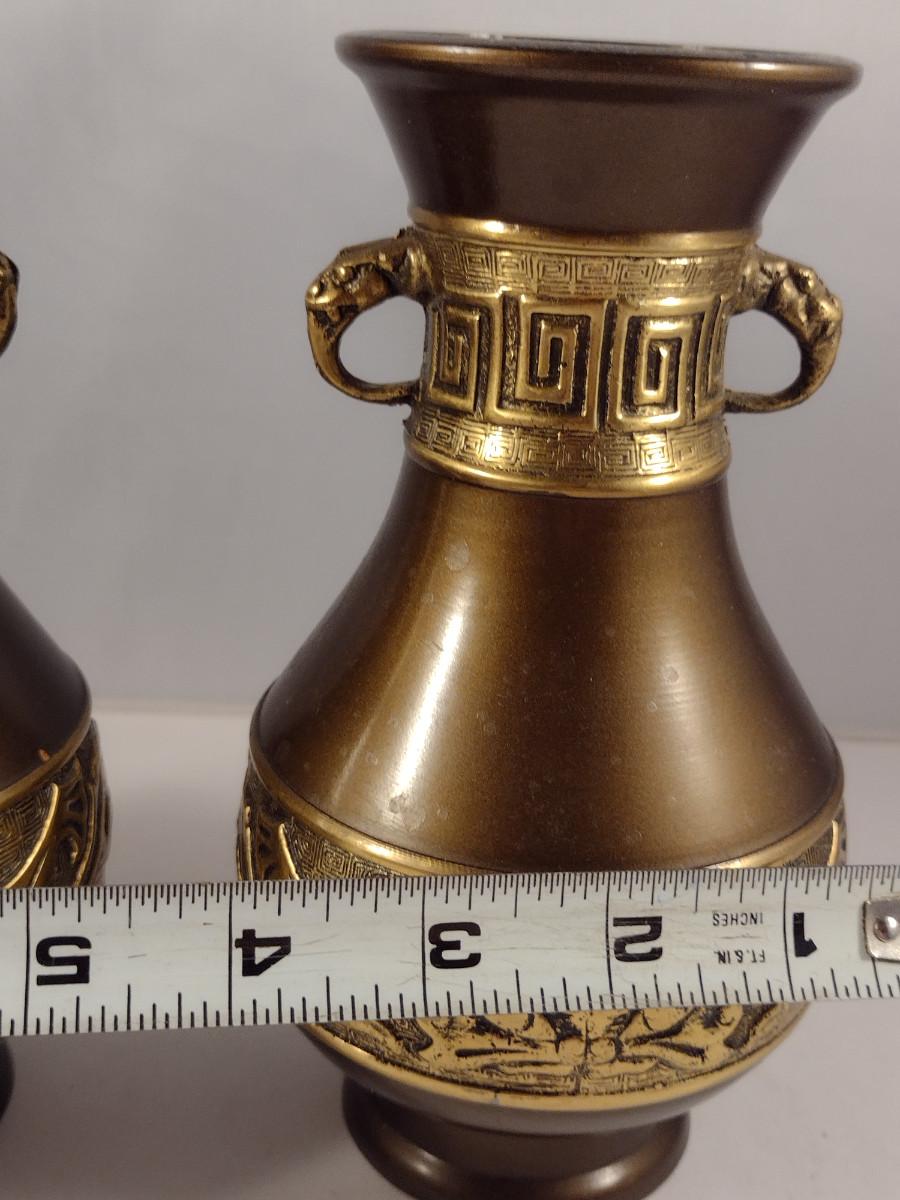 Pair of Metal Urn Vases with Greek Key Accent. Small discolored area on one piece. Items measure approx 7 1/2" tall.