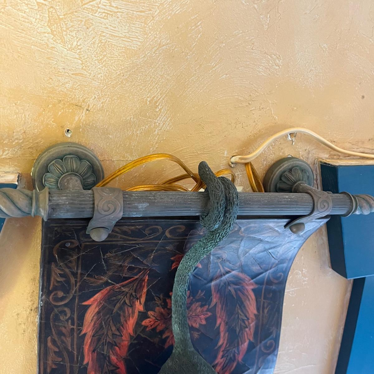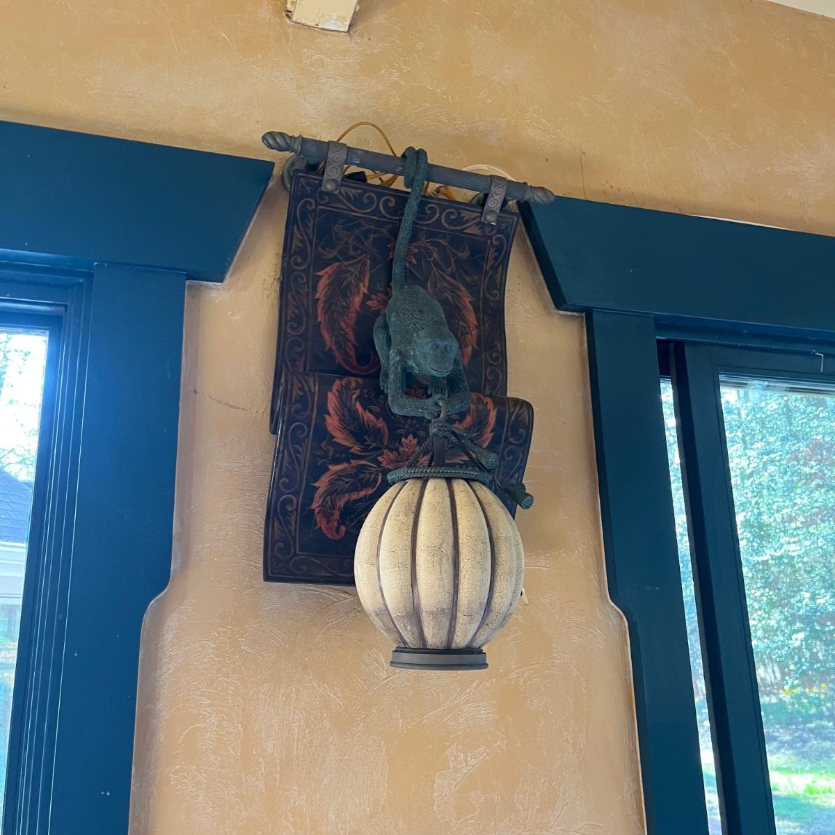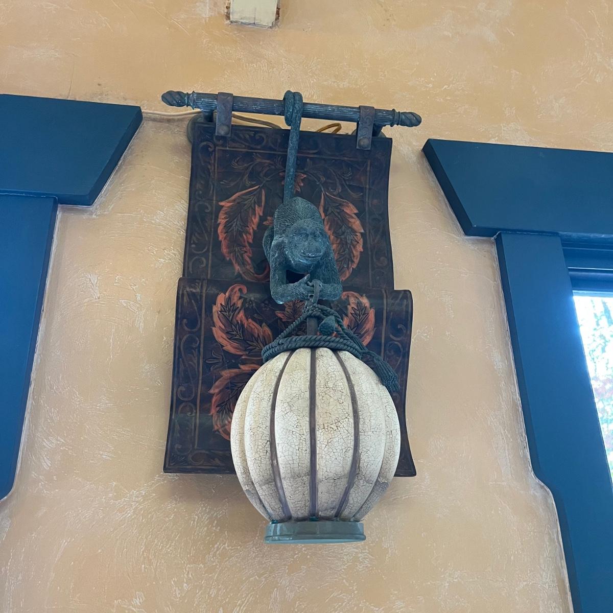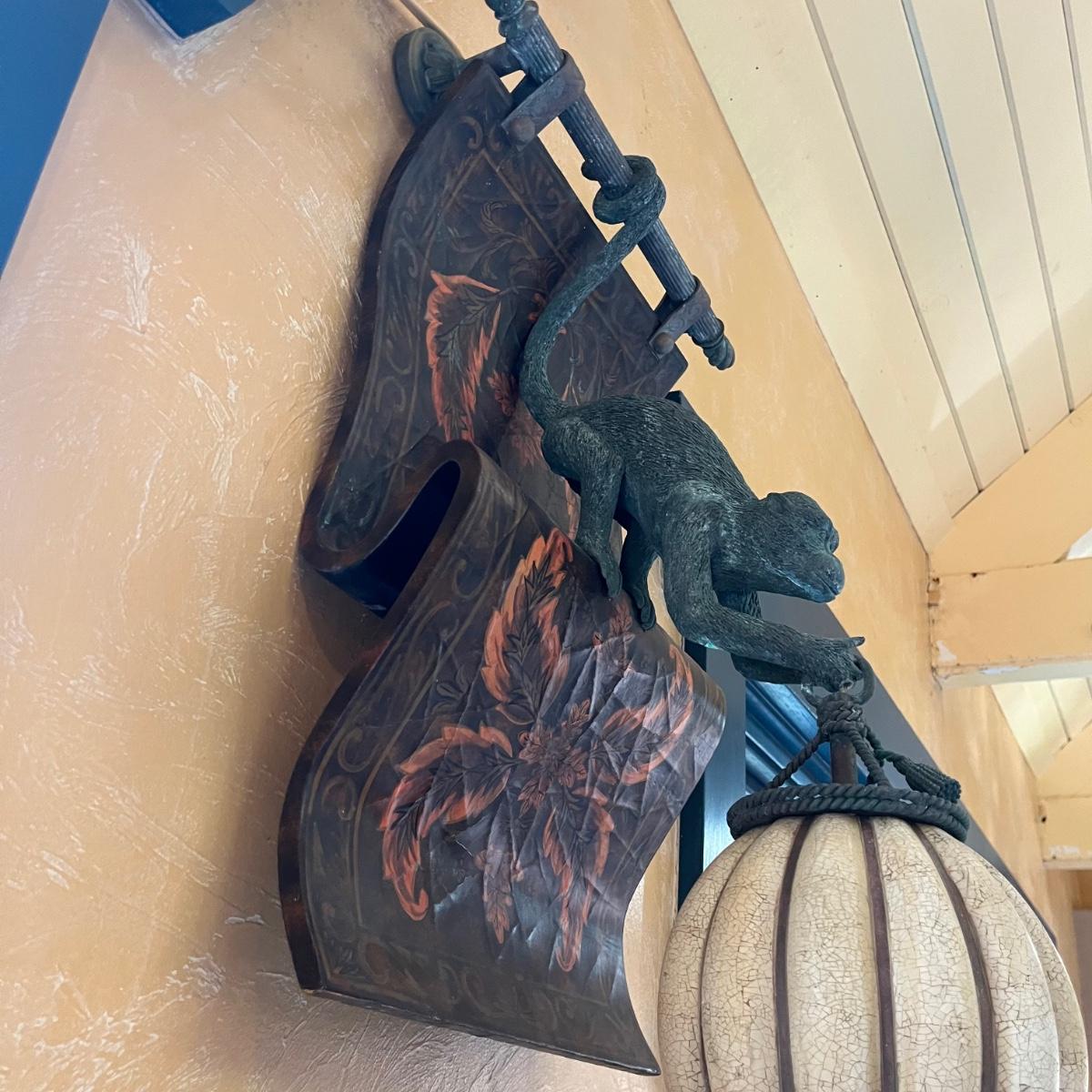 Lot includes a pair of metal and wooden wall sconces with monkey design. Lights plug in and have inline switch. Lights did not work when tested, they may just need bulbs. Sconces measure 16” x 14” x 30”H. Wood has moisture damage, see pictures.
