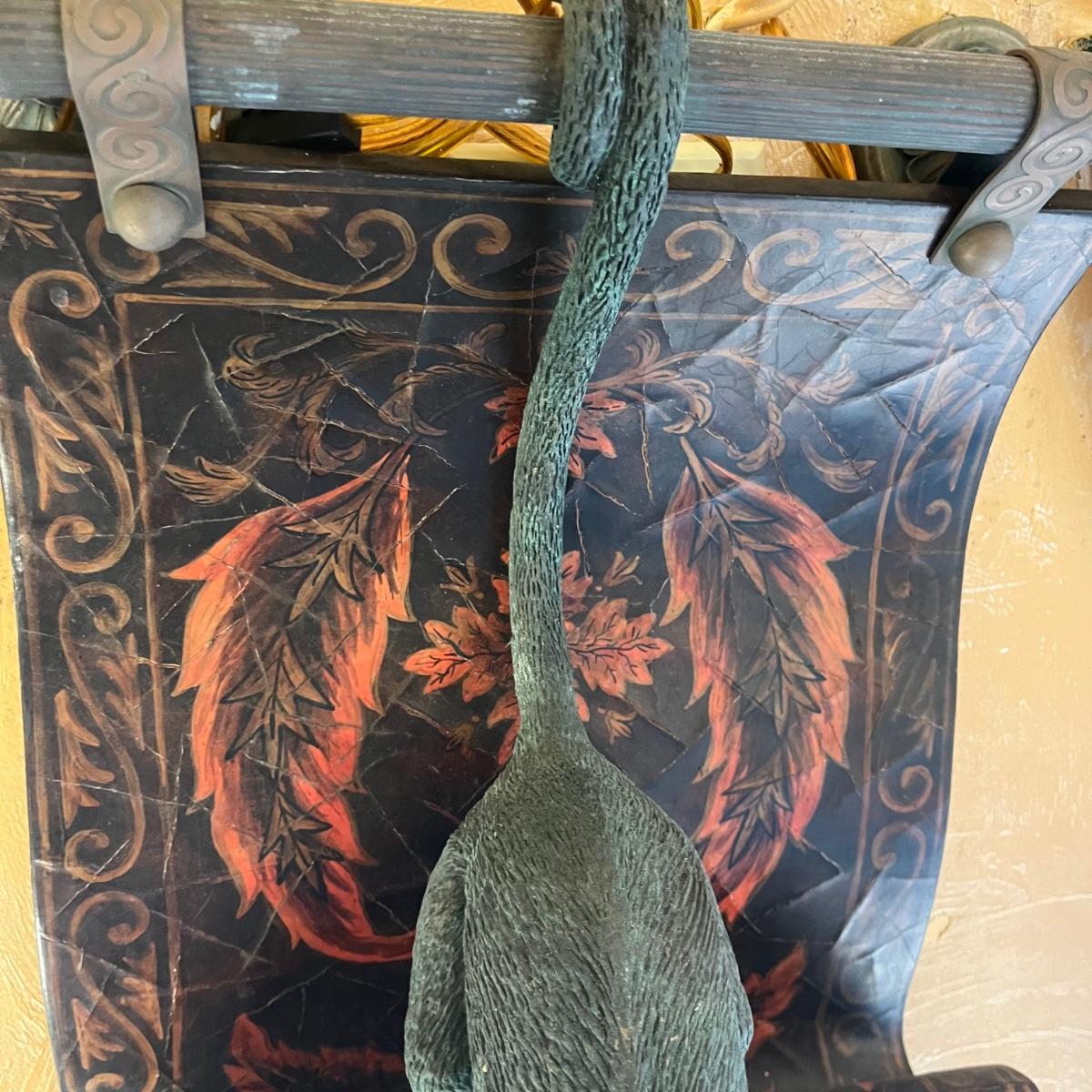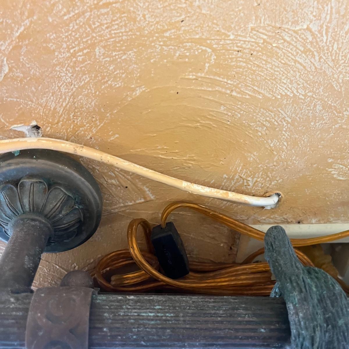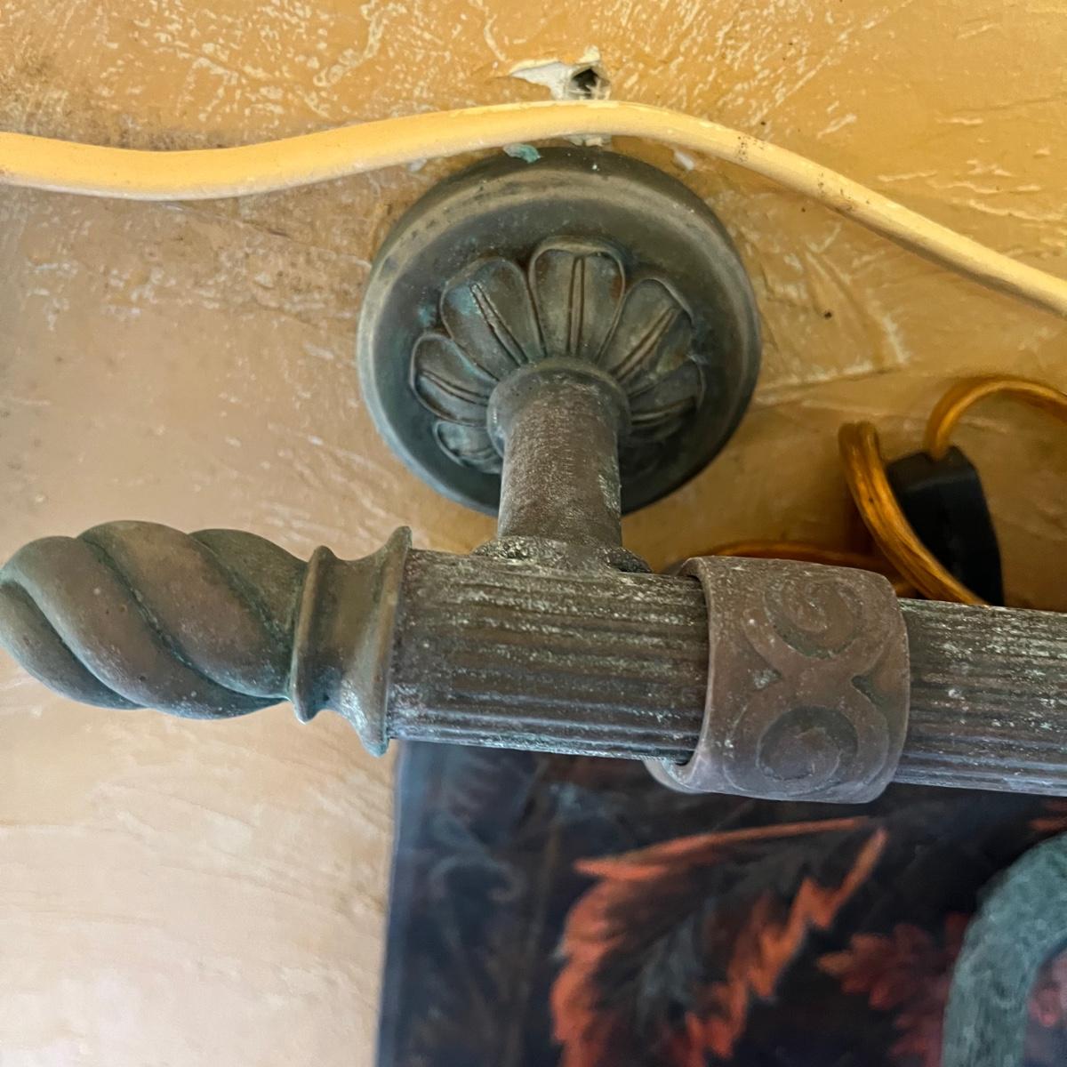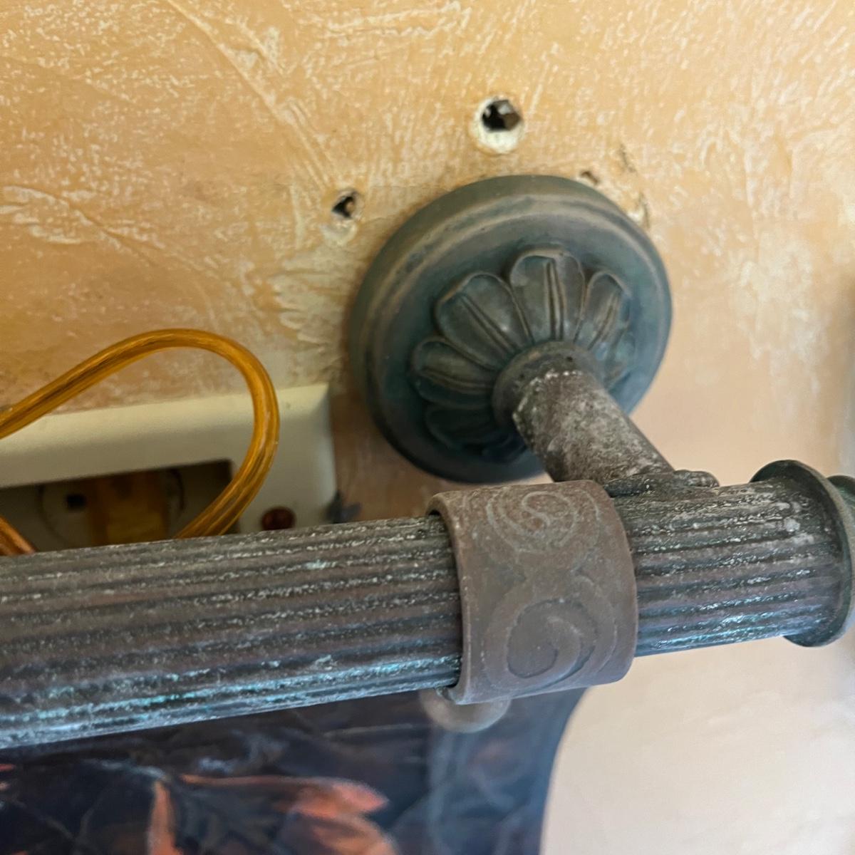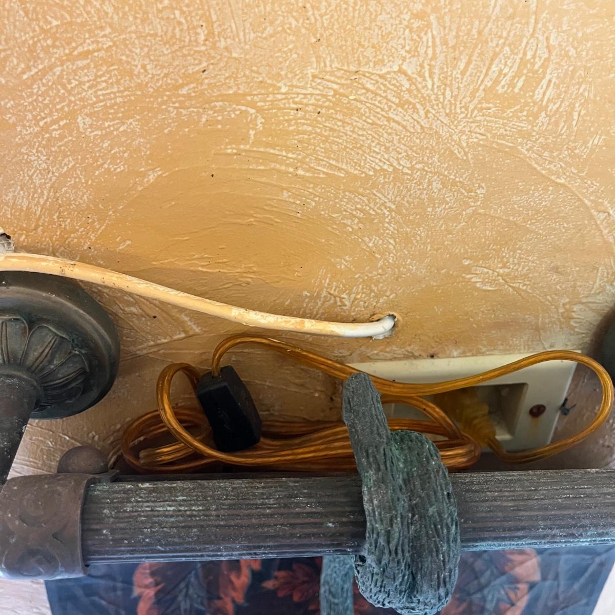 Lot includes a pair of metal and wooden wall sconces with monkey design. Lights plug in and have inline switch. Lights did not work when tested, they may just need bulbs. Sconces measure 16” x 14” x 30”H. Wood has moisture damage, see pictures.