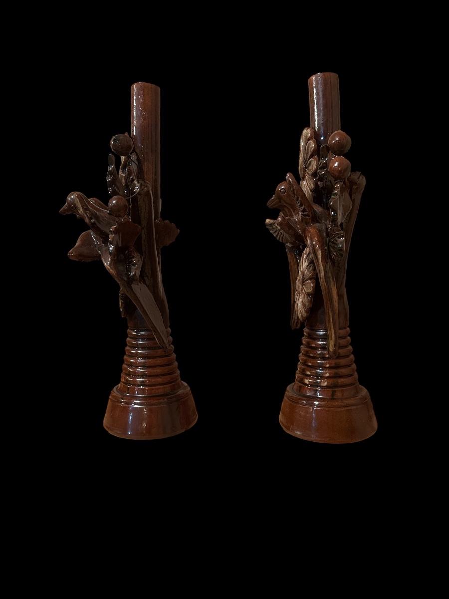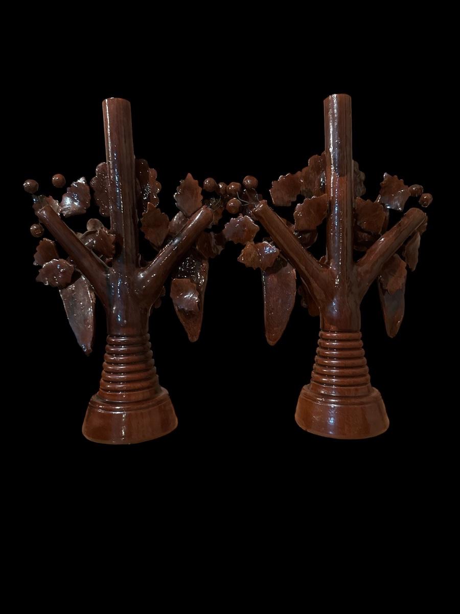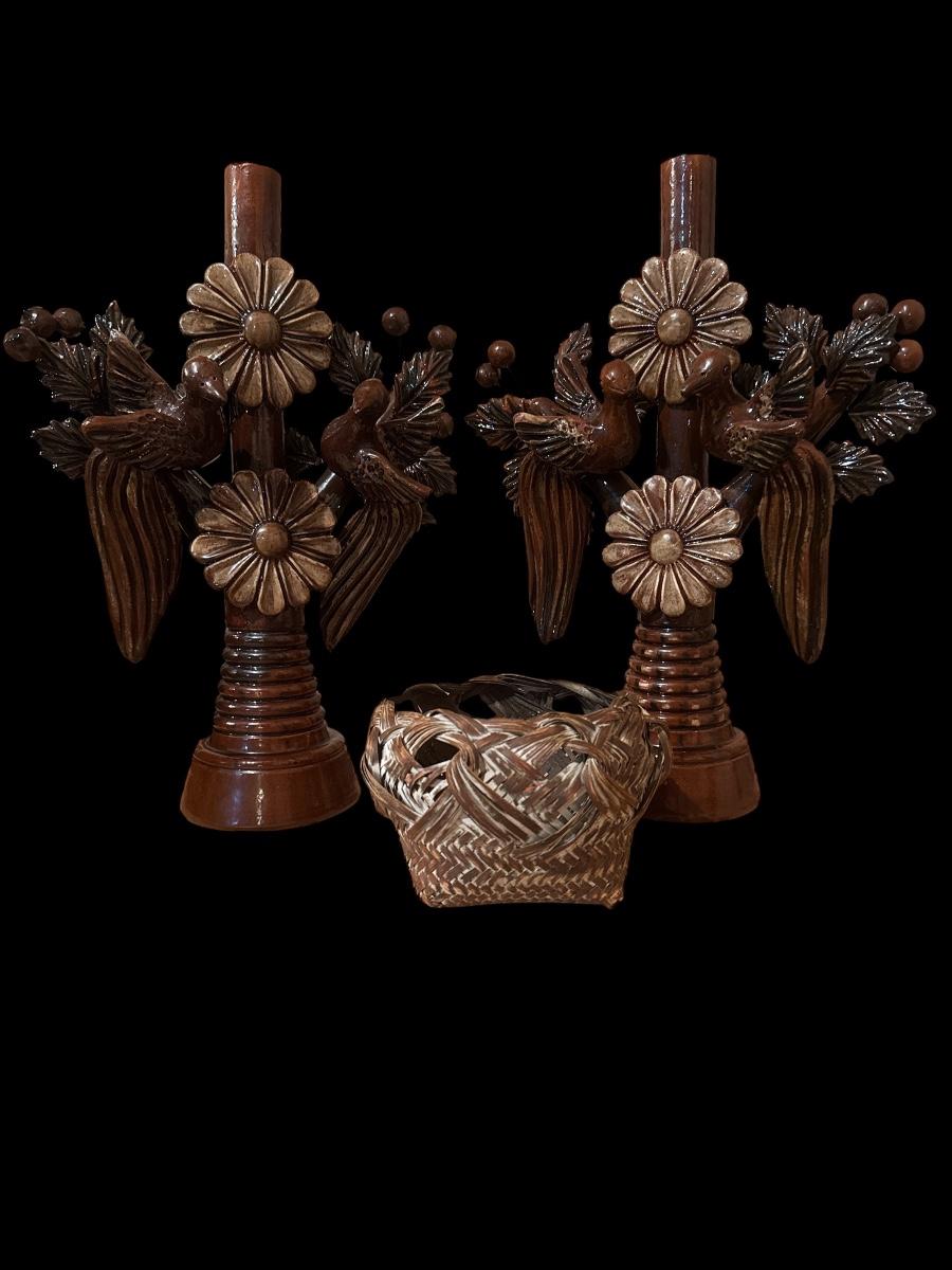 Glazed pottery Mexican candlesticks and basket