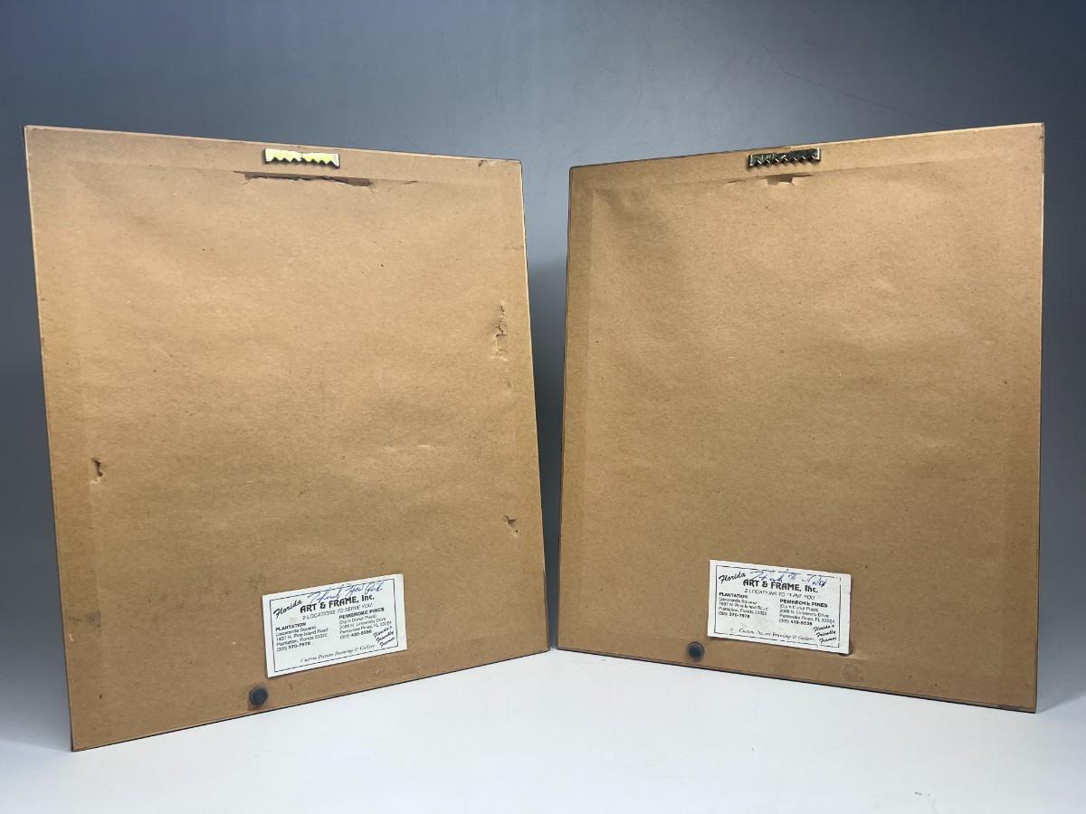 There is some light wear on both of the frames, but there is no significant damage to the protective glass or the art prints and is in good displayable or collectible condition. Check pictures for more details and for sizing.