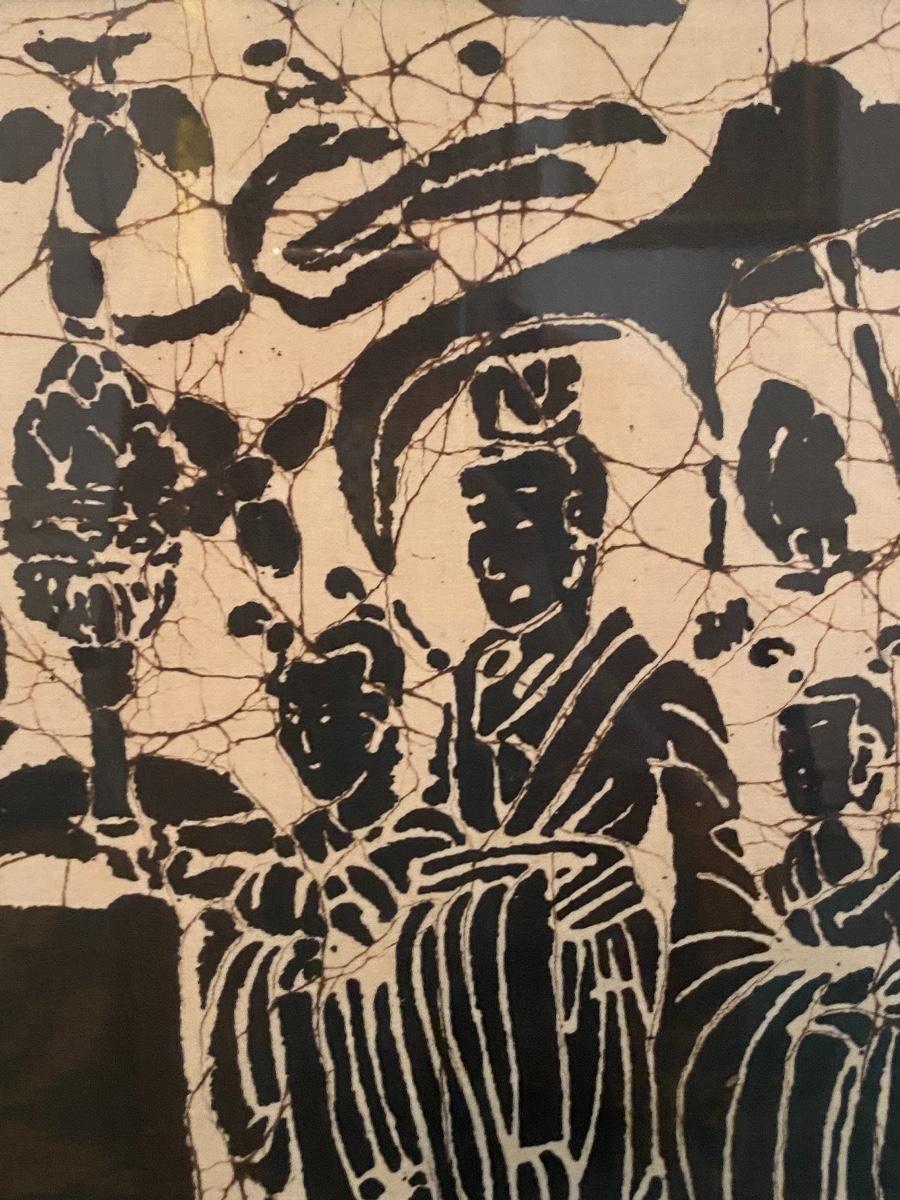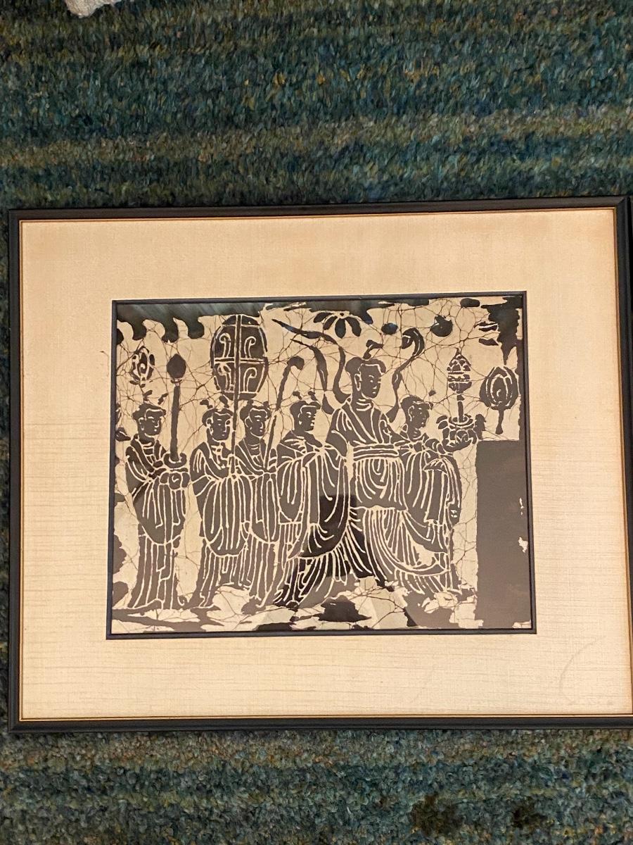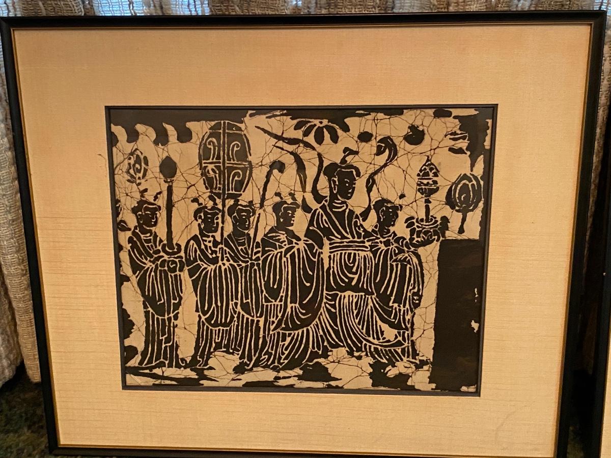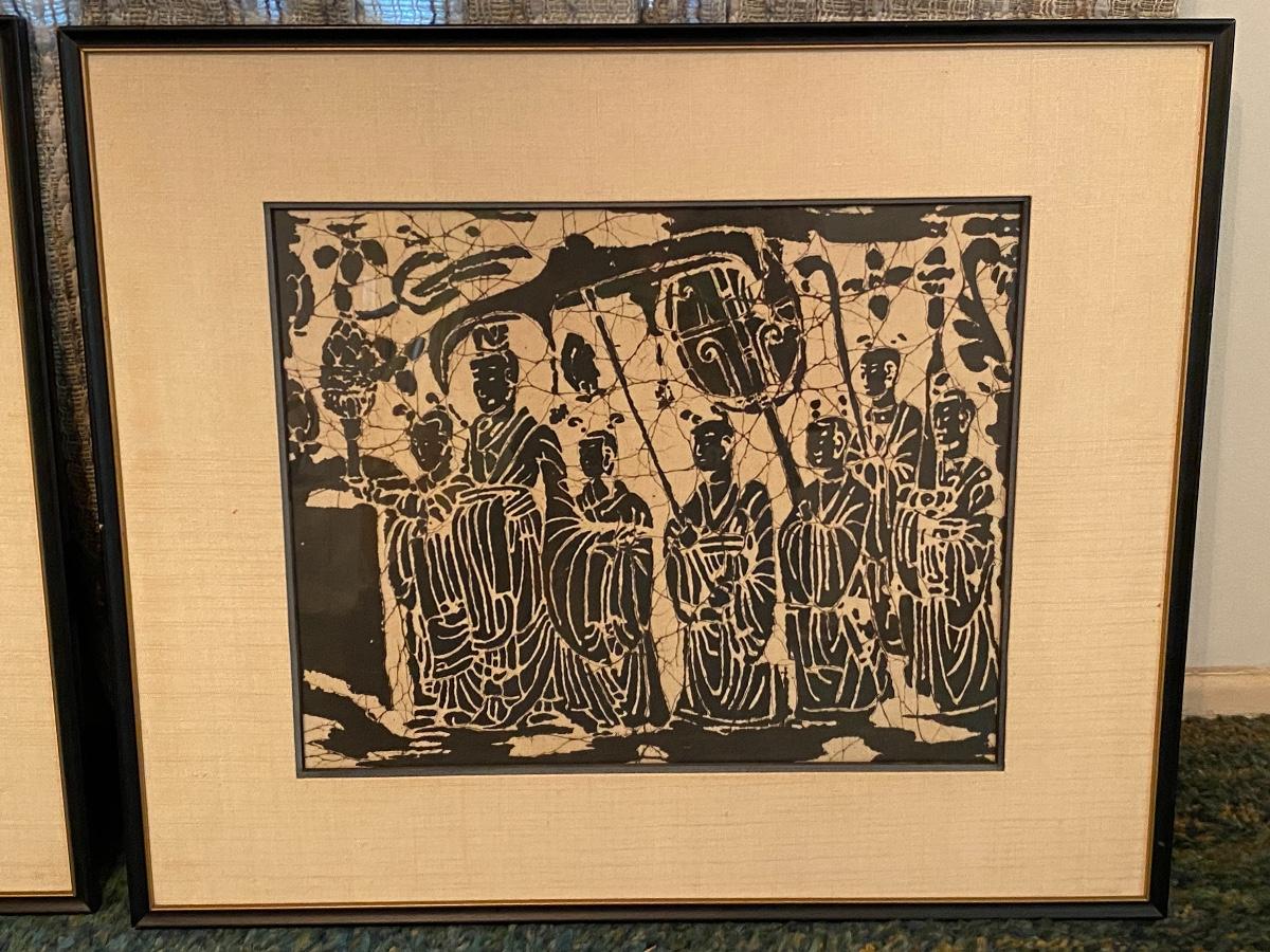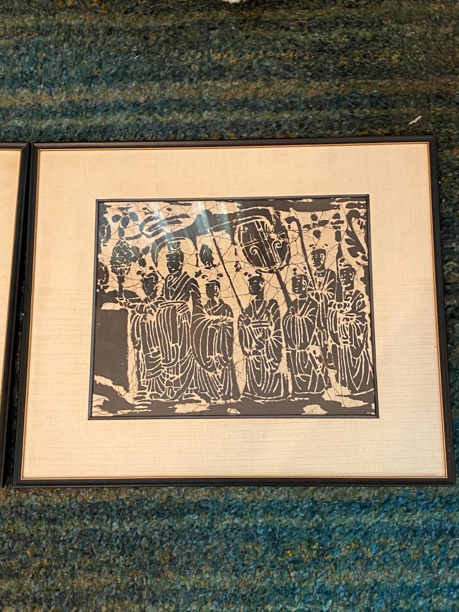 Pair of Mid Century Orient Asian Wood Block Stamped Framed Art