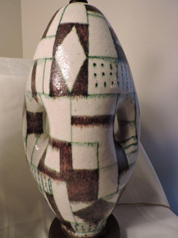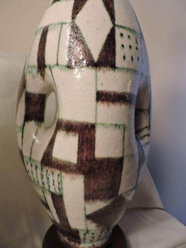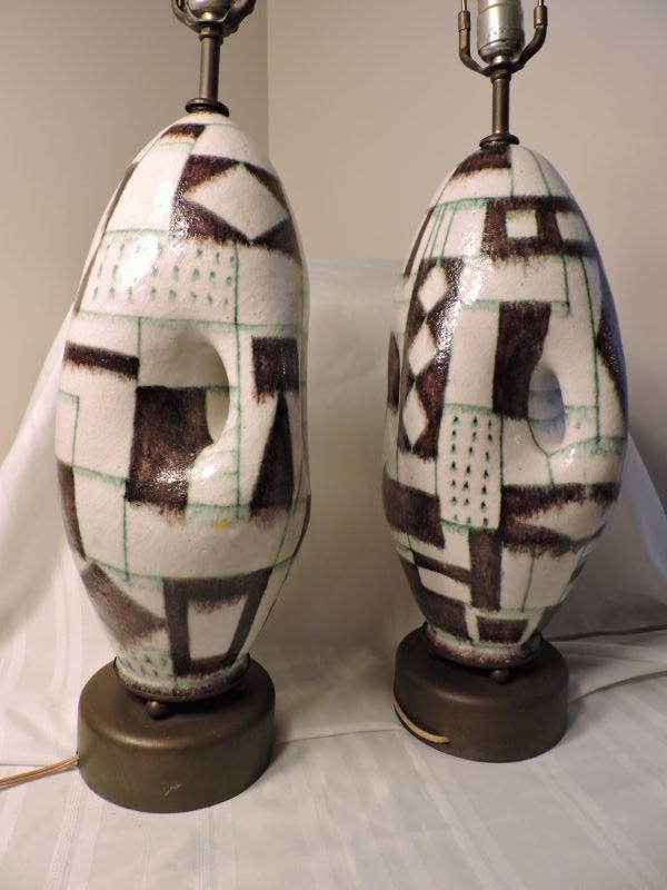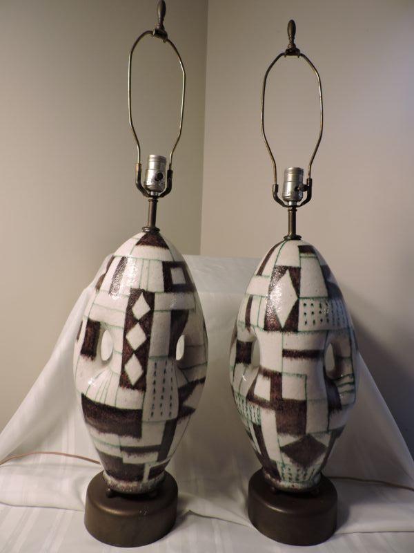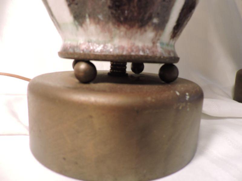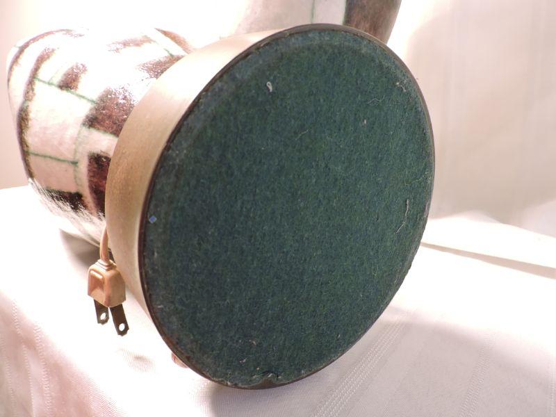 Unique vintage glazed ceramic lamp in jug shape with 2 handles and geometric pattern in brown and green. Brass base. Cost $100 each when purchased new Philadelphia in the 60-70's. **Please read Terms and Conditions before placing a bid. Pick up is Sunday, September 15, 2019 from 11am to 4pm and Tuesday, September 17 from 4pm-7pm in Sicklerville. All sales are final. All sales are as is, where is. Please review all photos. Any props included in photos are not included in listing. All measurements are approximate.