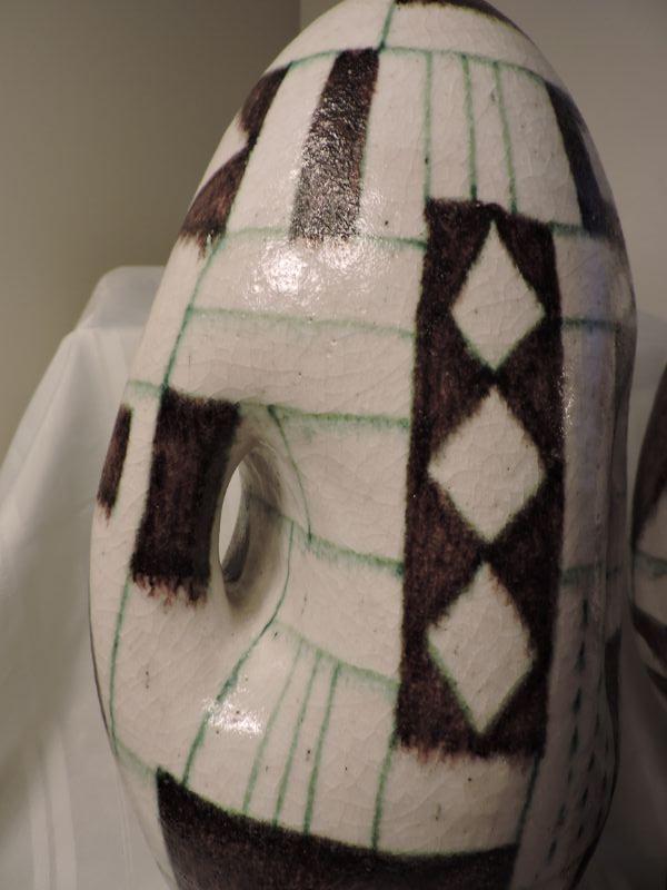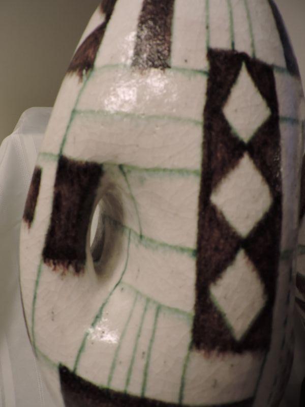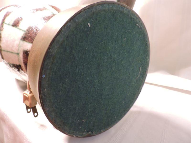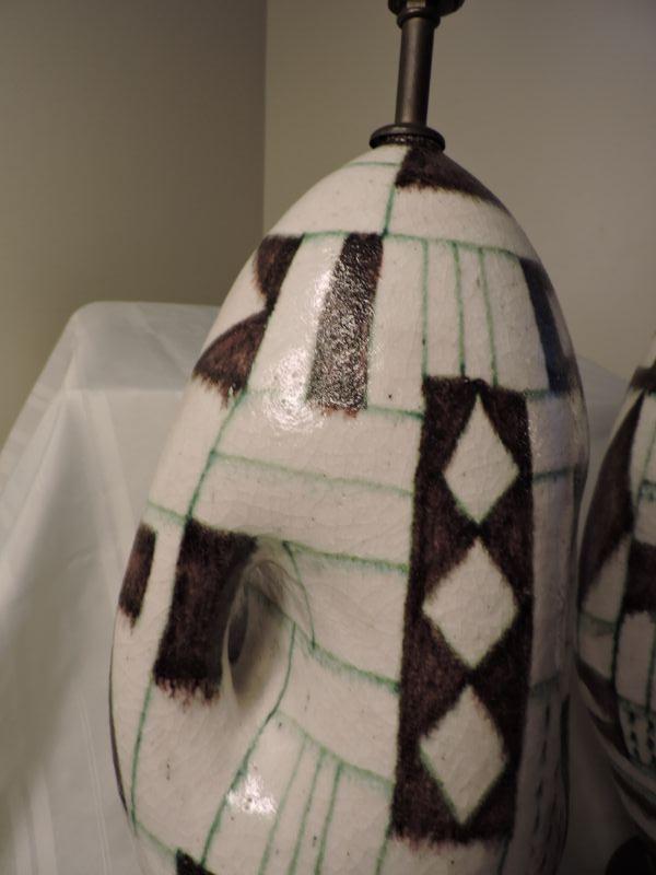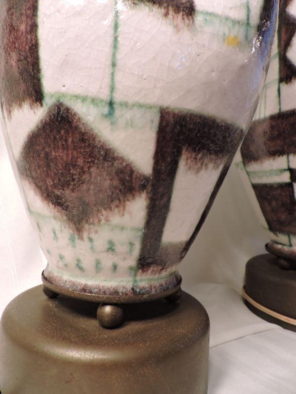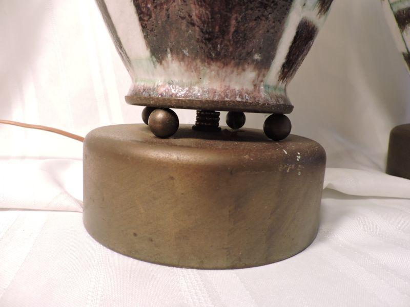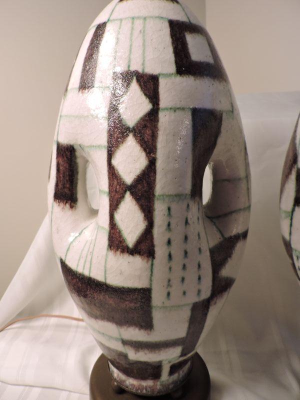 Unique vintage glazed ceramic lamp in jug shape with 2 handles and geometric pattern in brown and green. Brass base. Cost $100 each when purchased new Philadelphia in the 60-70's. **Please read Terms and Conditions before placing a bid. Pick up is Sunday, September 15, 2019 from 11am to 4pm and Tuesday, September 17 from 4pm-7pm in Sicklerville. All sales are final. All sales are as is, where is. Please review all photos. Any props included in photos are not included in listing. All measurements are approximate.