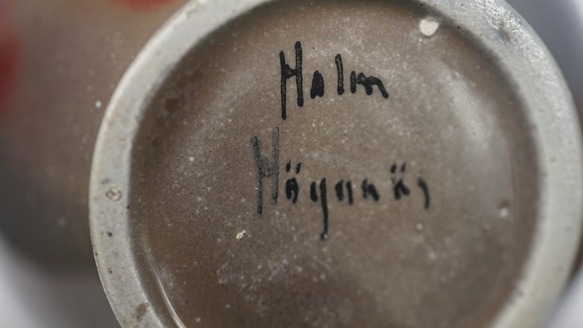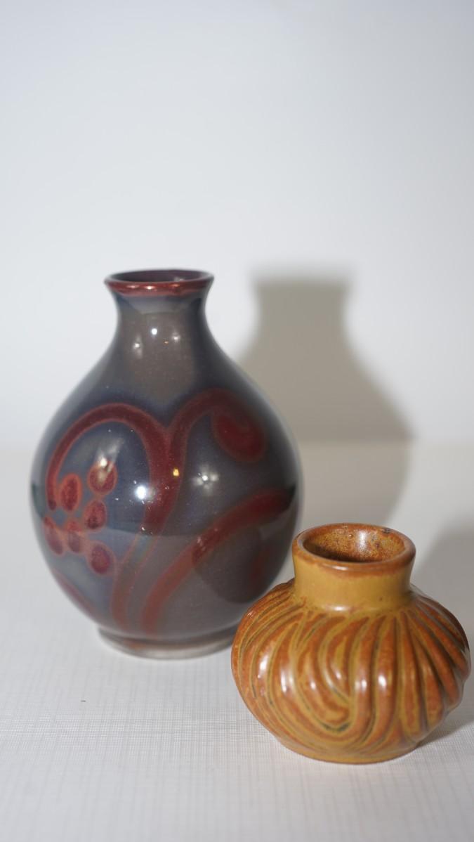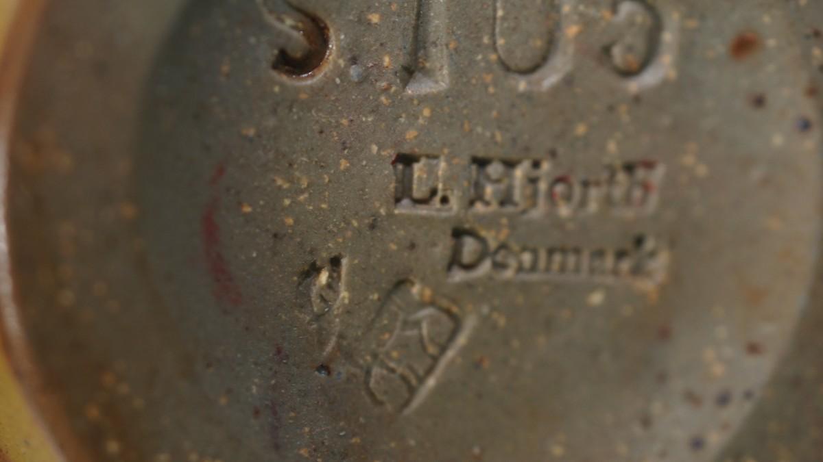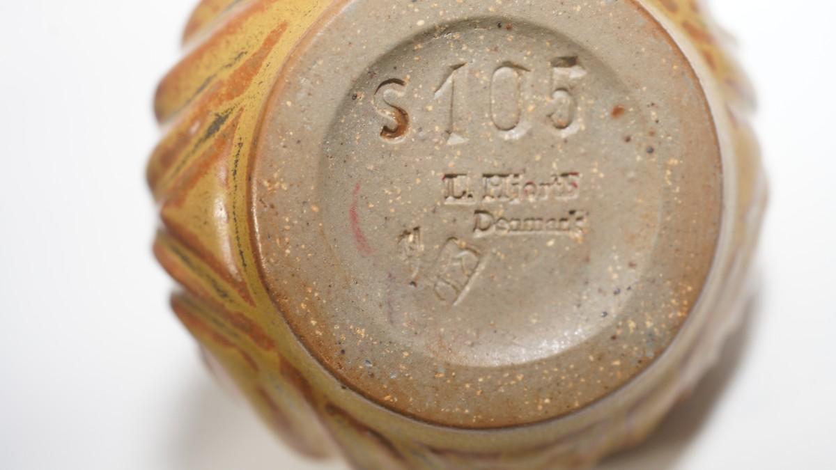 Denmark ceramic vase of 2 1/2" stamped with the number 105 and artist name.
