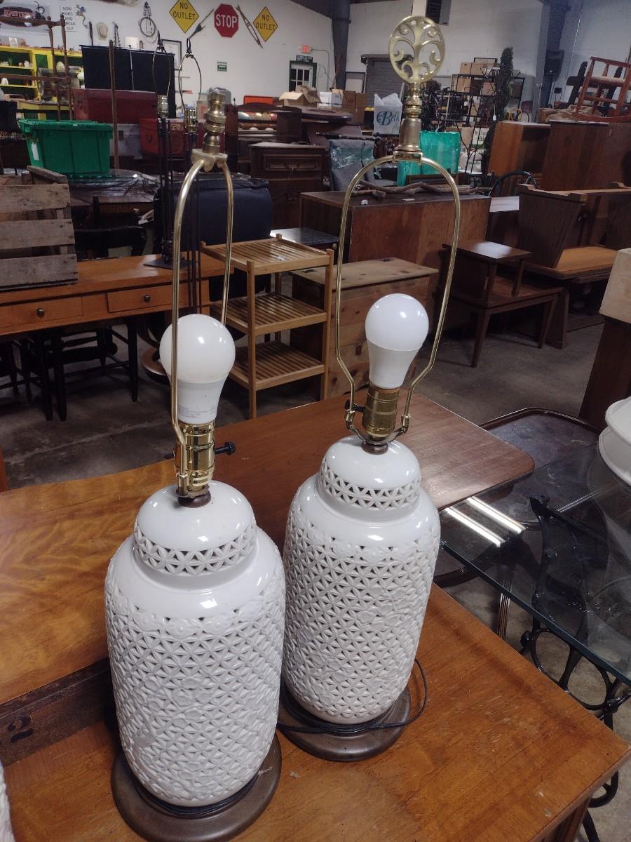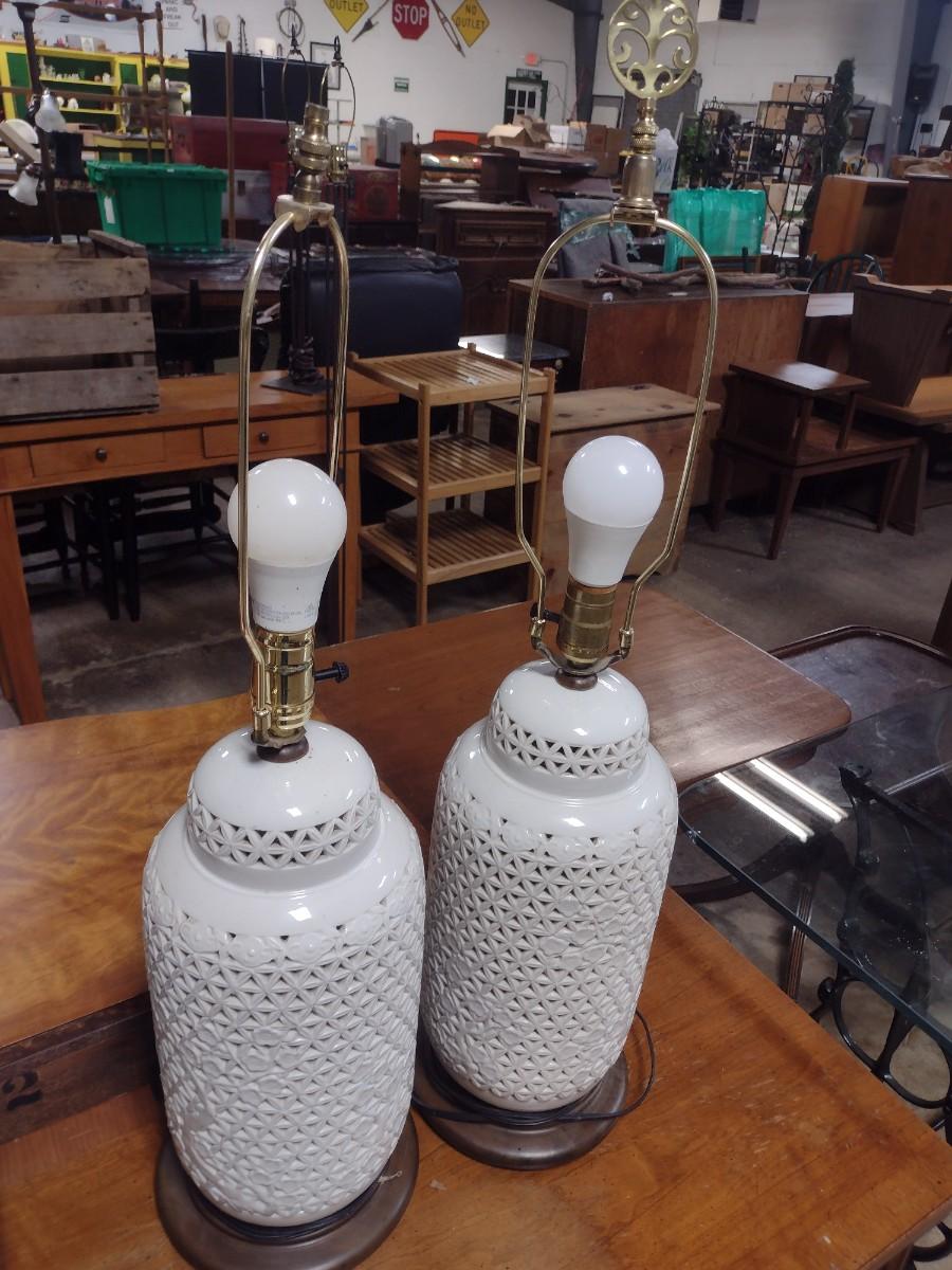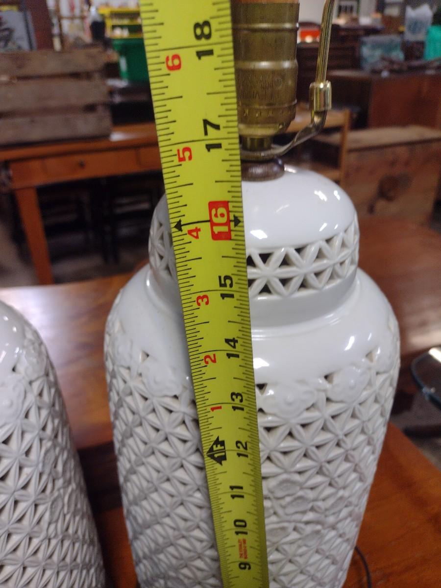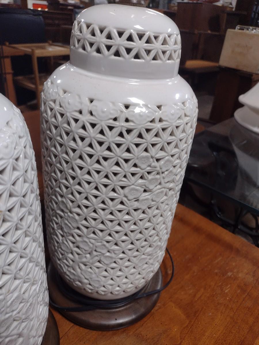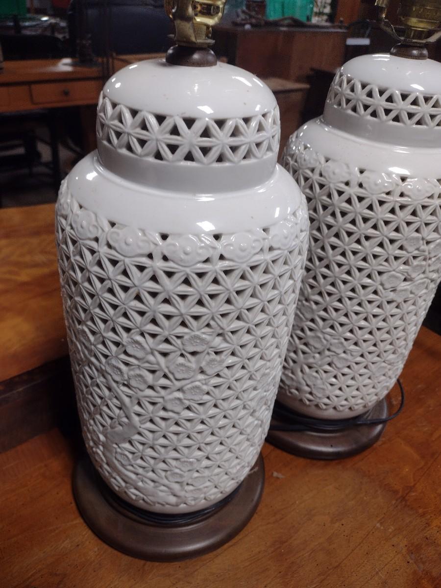 Pair of Mid-Century Reticulated Blanc de Chine Porcelain Table Lamps 16"