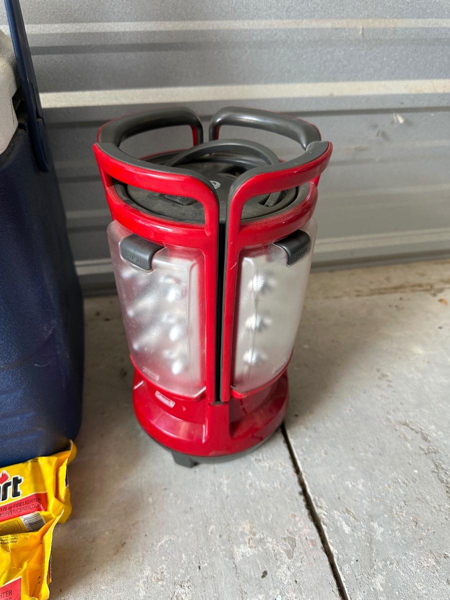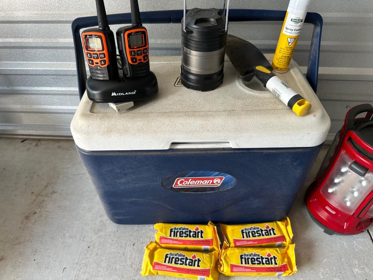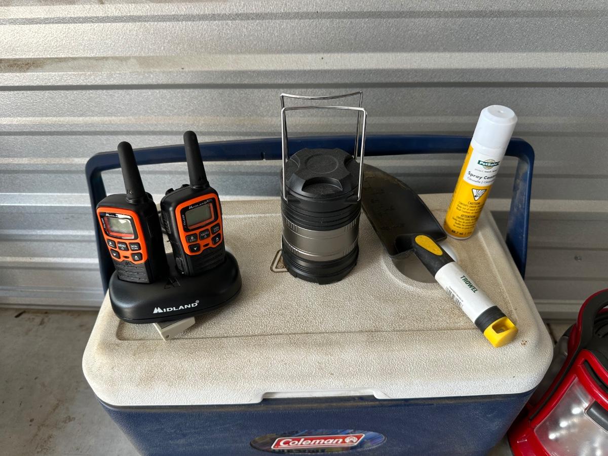 PAIR OF MIDLAND RADIOS (WALKIE TALKIES), COLEMAN COOLER, BATTERY OPERATED LANTERN & MORE