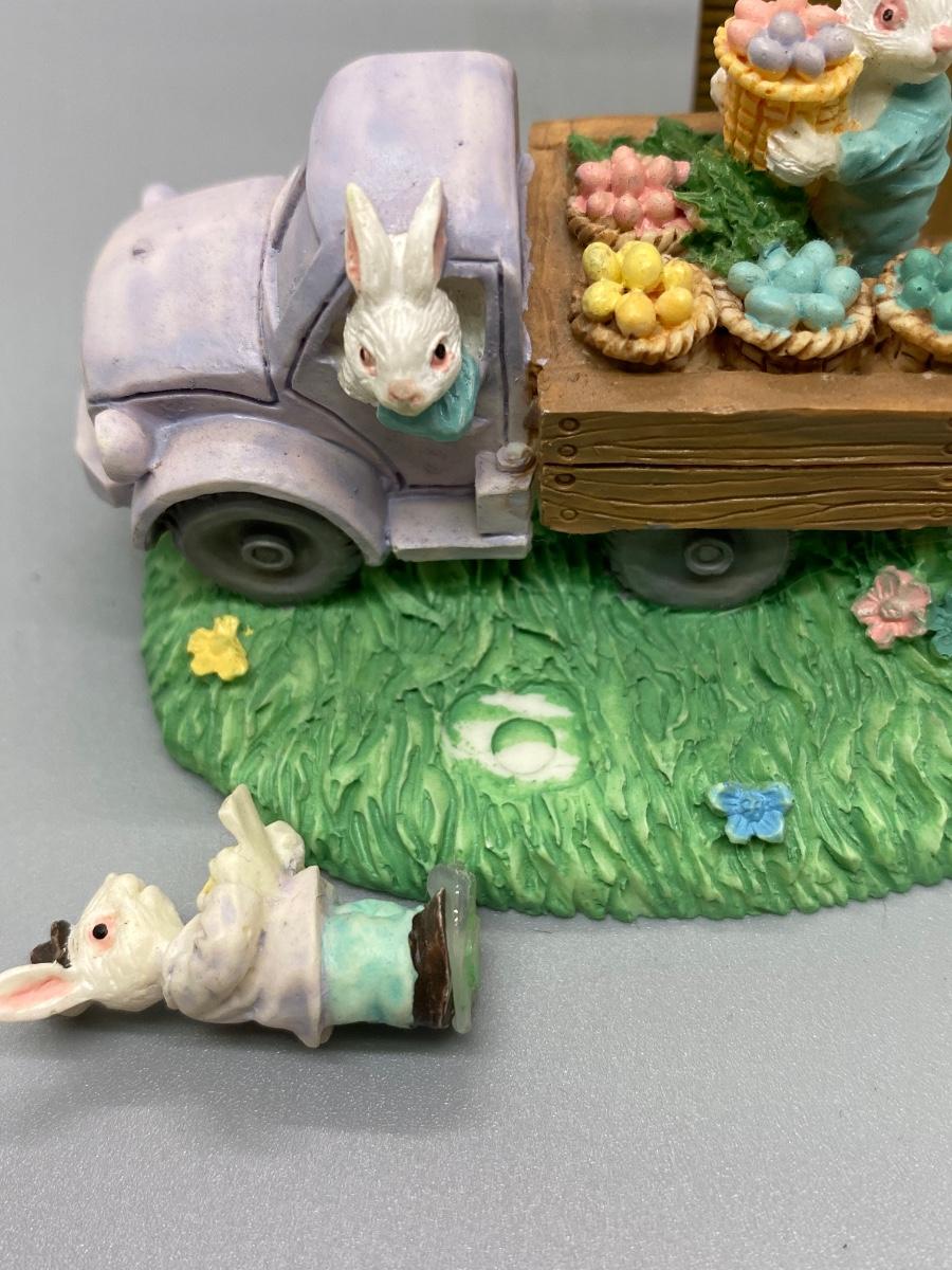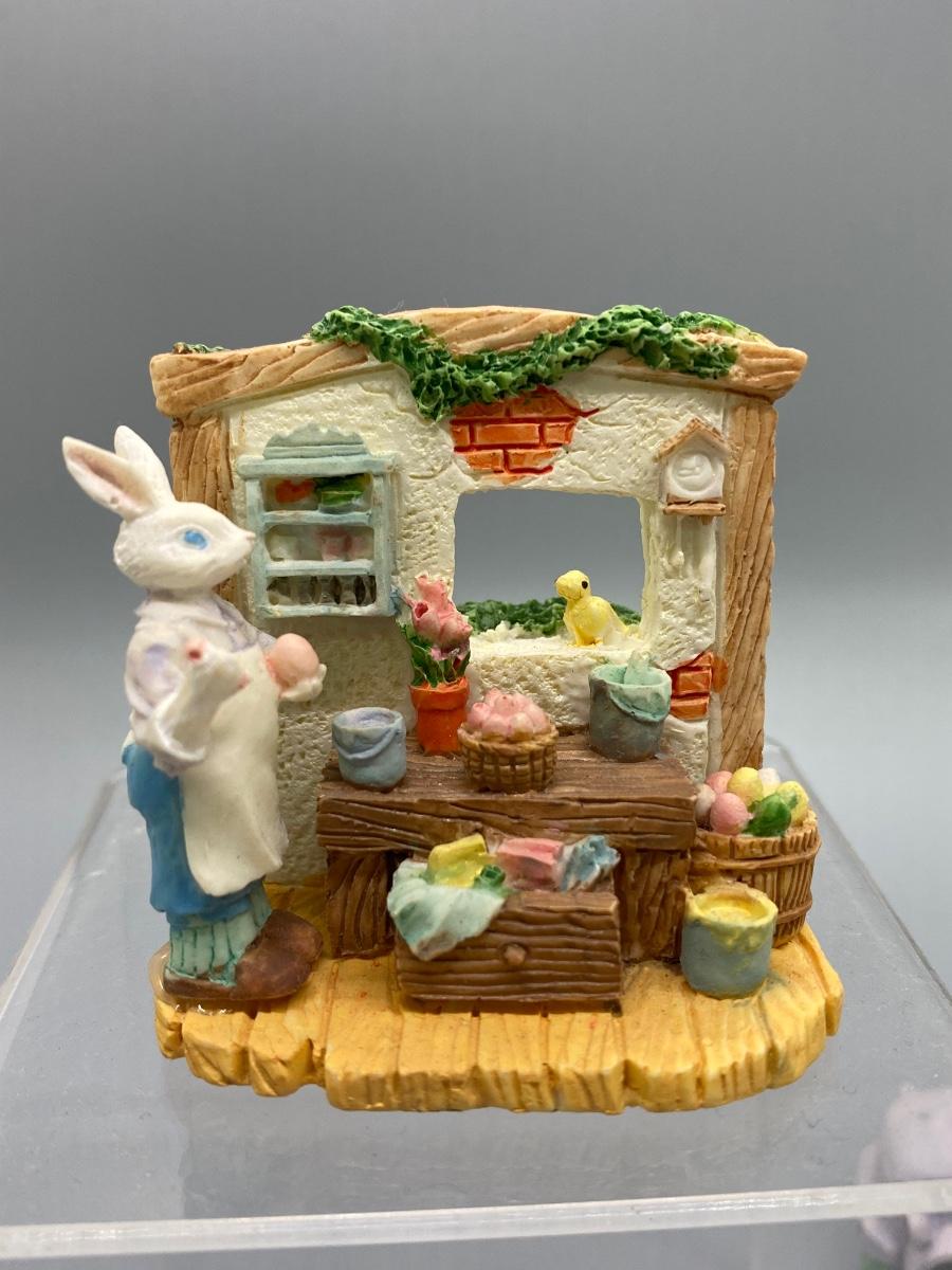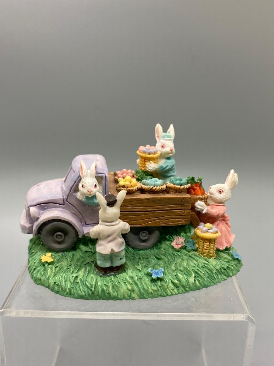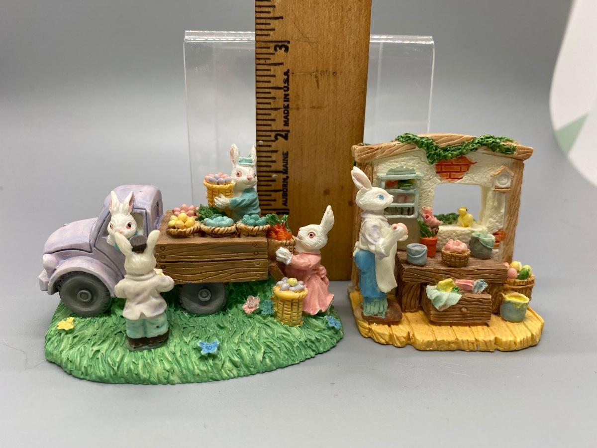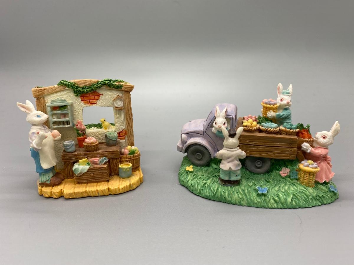 Pair of miniature Easter themed figurines. One of a bunny in an Easter egg shop. The other is a group of bunnies loading Easter eggs into a truck. Unfortunately, one bunny has been broken off and needs to be glued back into place. Small, only about 2" size.