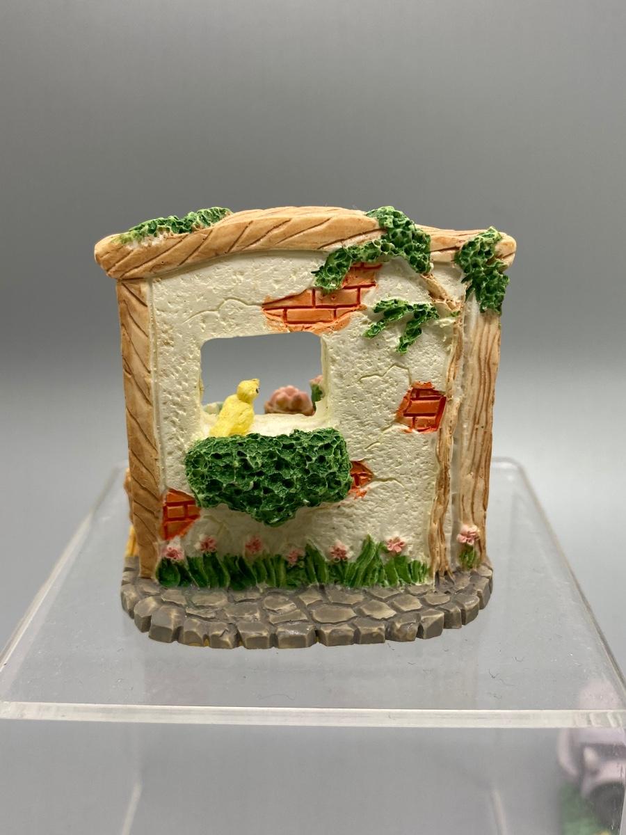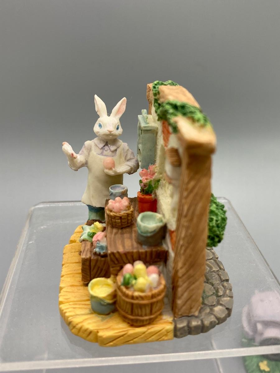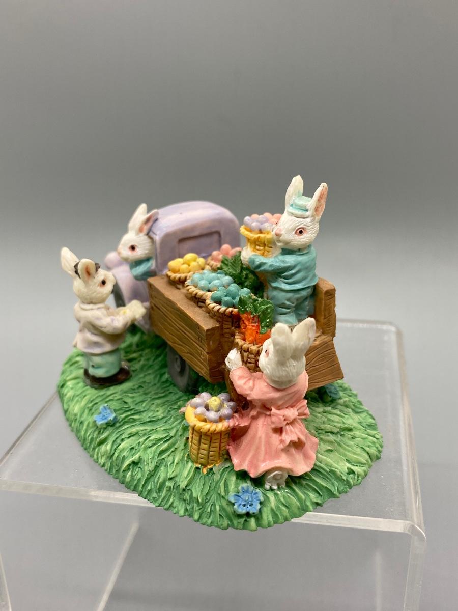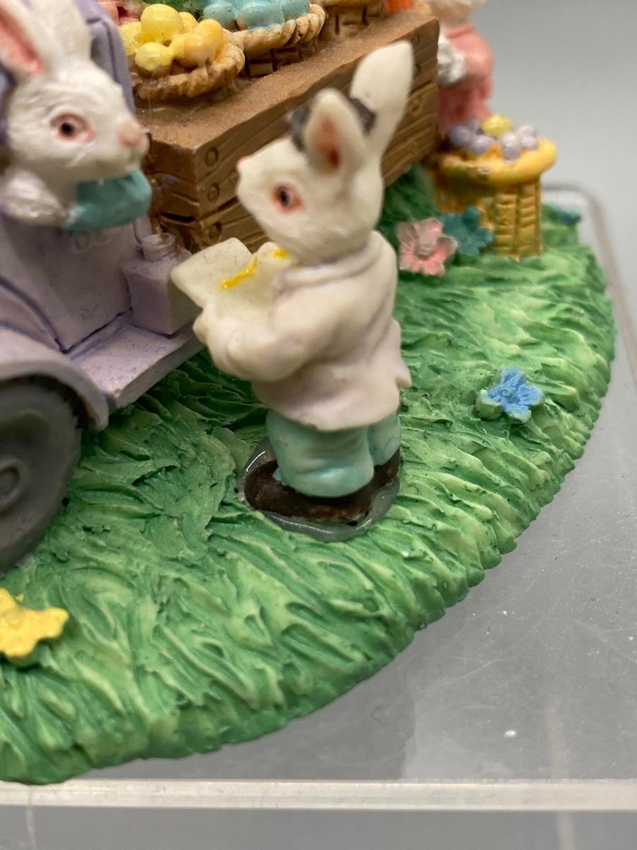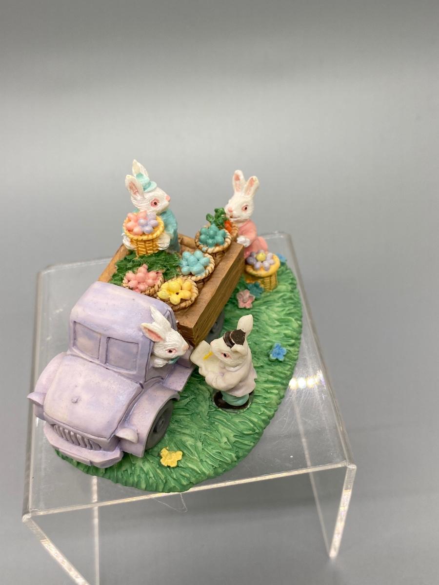 Pair of miniature Easter themed figurines. One of a bunny in an Easter egg shop. The other is a group of bunnies loading Easter eggs into a truck. Unfortunately, one bunny has been broken off and needs to be glued back into place. Small, only about 2" size.