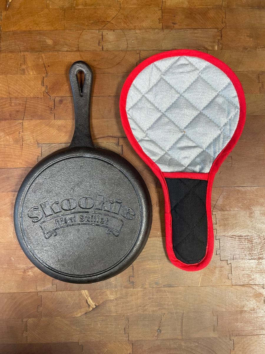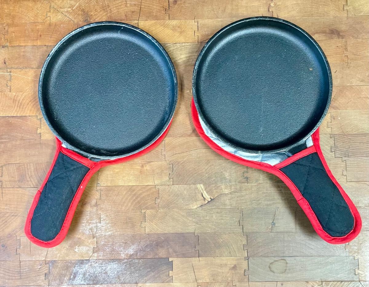 Made by Skookie, each pan includes a hot pad / handle pad. Each is approx. 7" across. Excellent condition.
