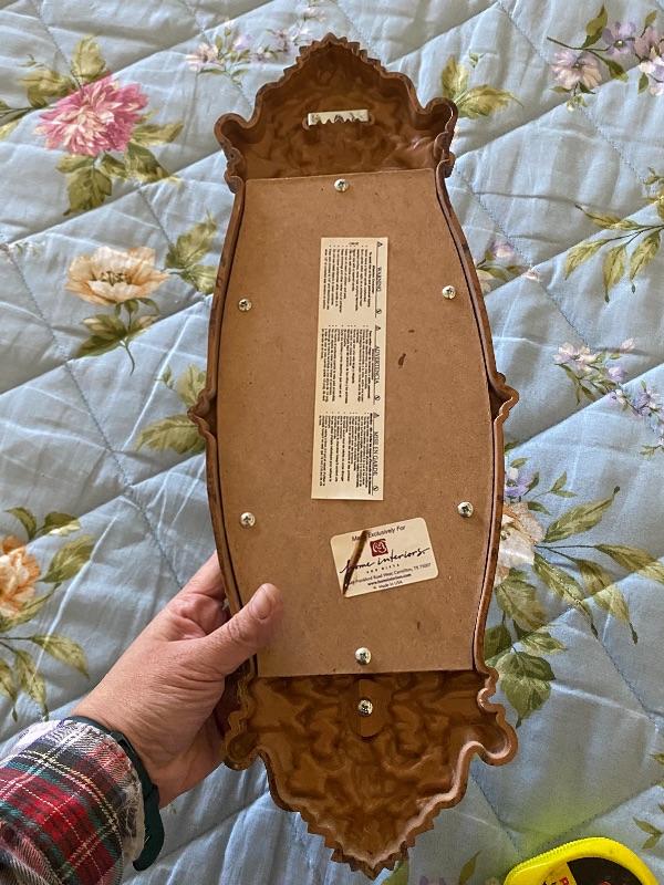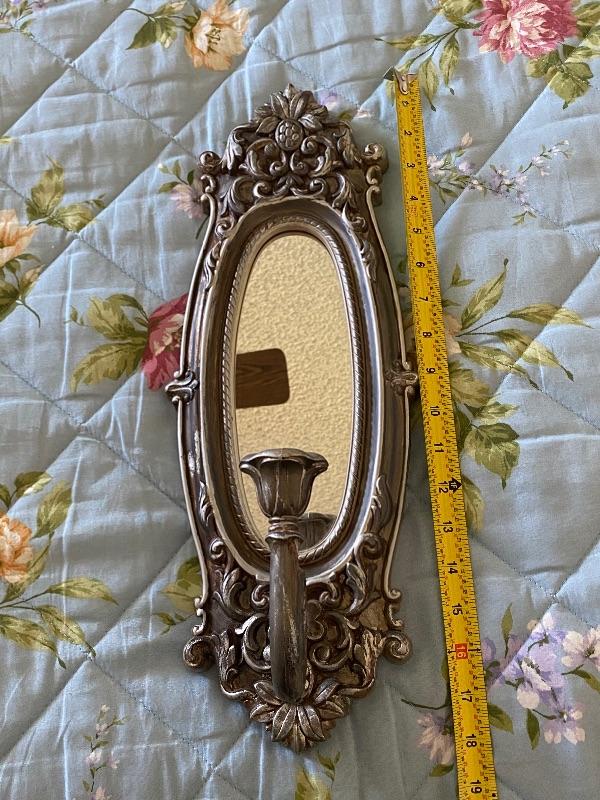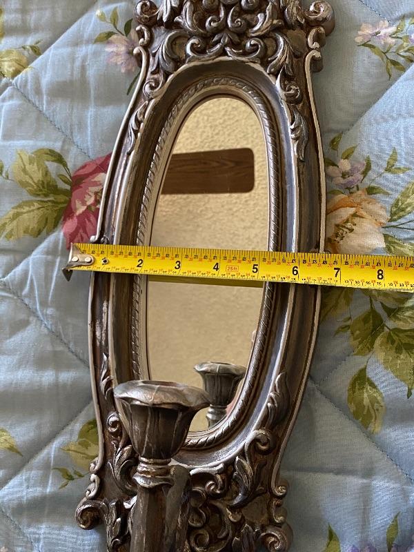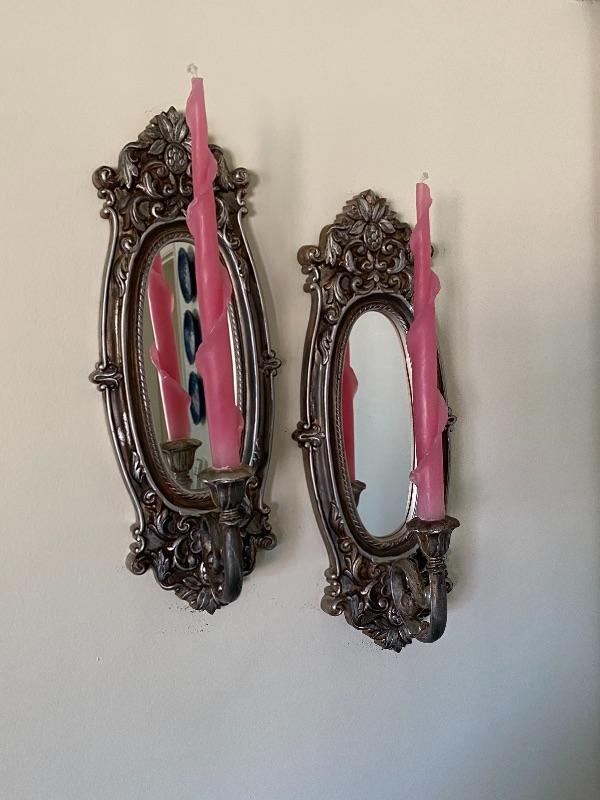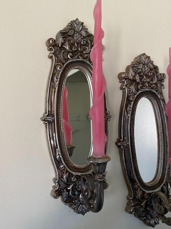 Pair of hanging wall mirror candle holders. Hold taper style candles. About 18" size. Made of plastic.