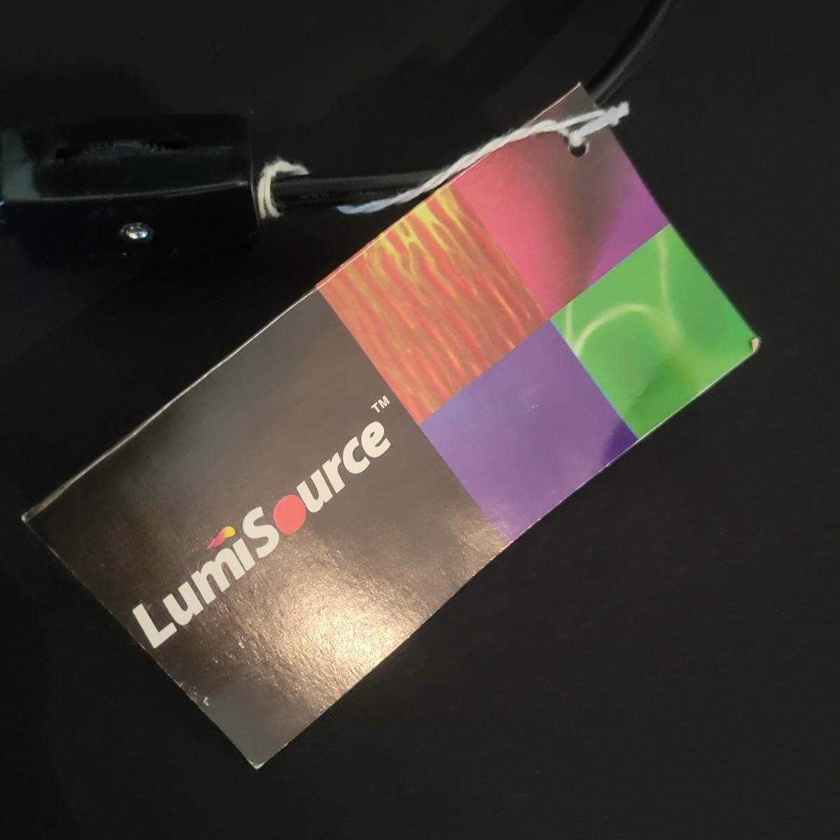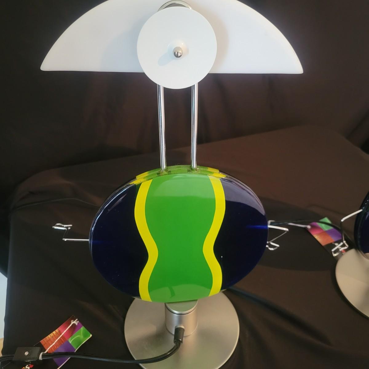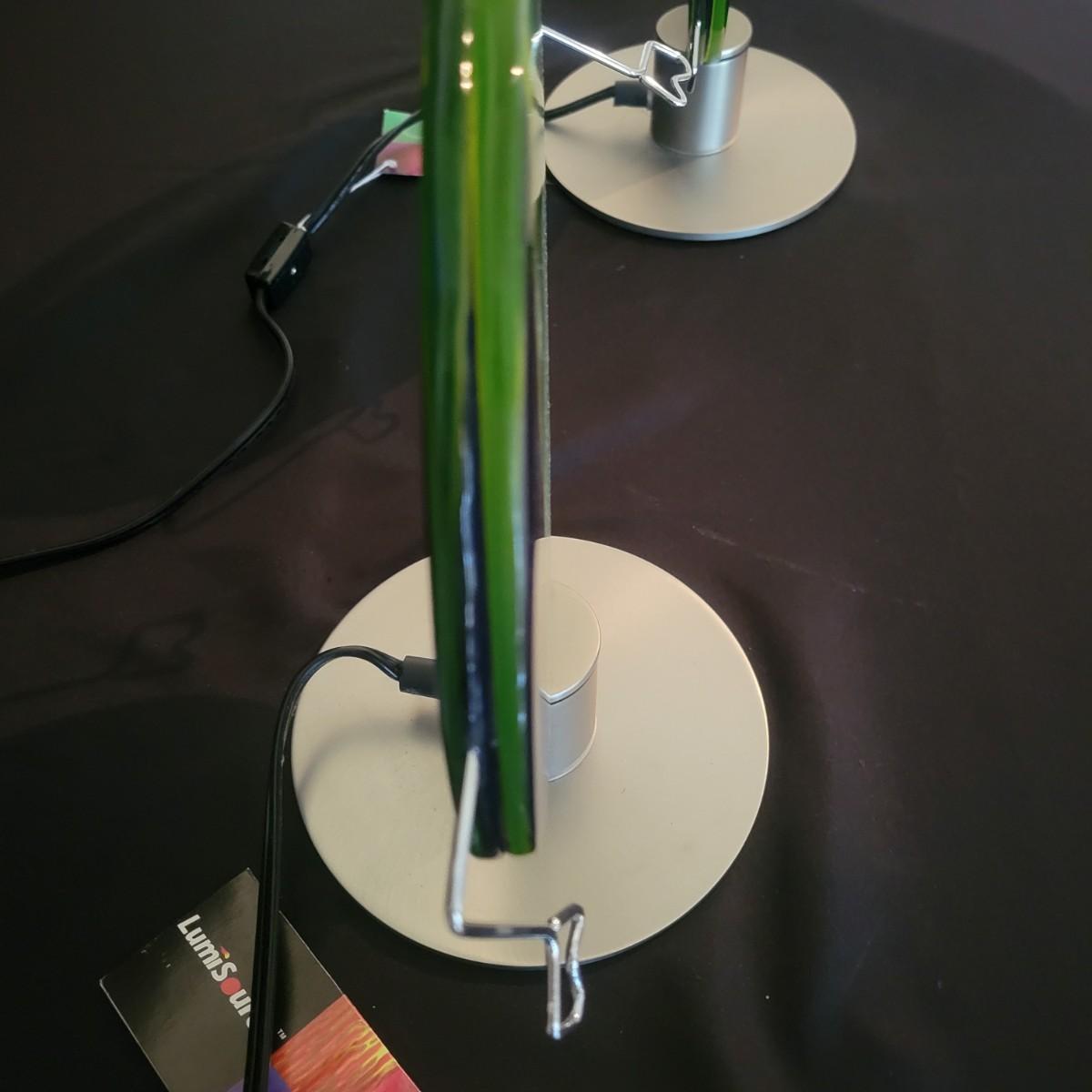 A pair of unique matching glass and metal lamps. These lamps were plugged in but did not power on. Likely due to the bulbs being bad, although the lamps appear to have never been used. These lamps feature a unique design glass with a brushed metal base and are manufactured by LumiSource. They measure approximately 11" x 6.5" x 16.5"H. Shipping available