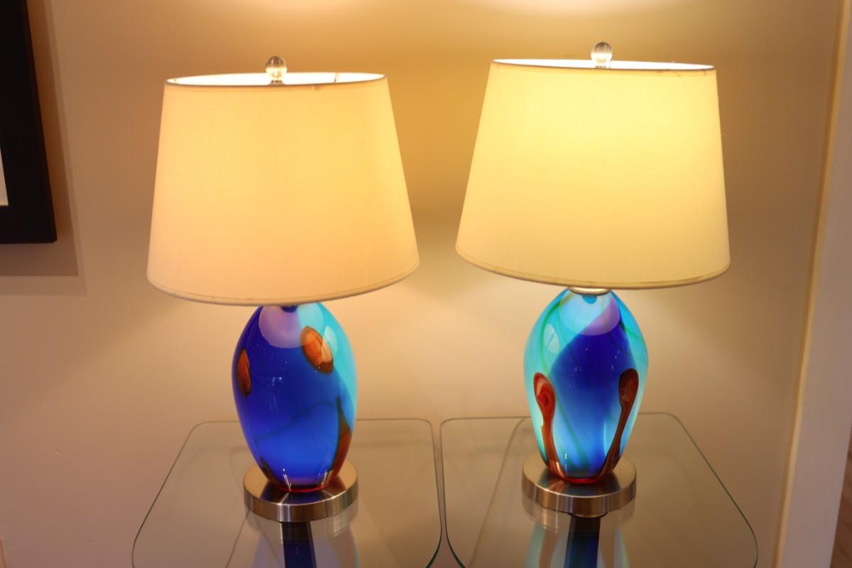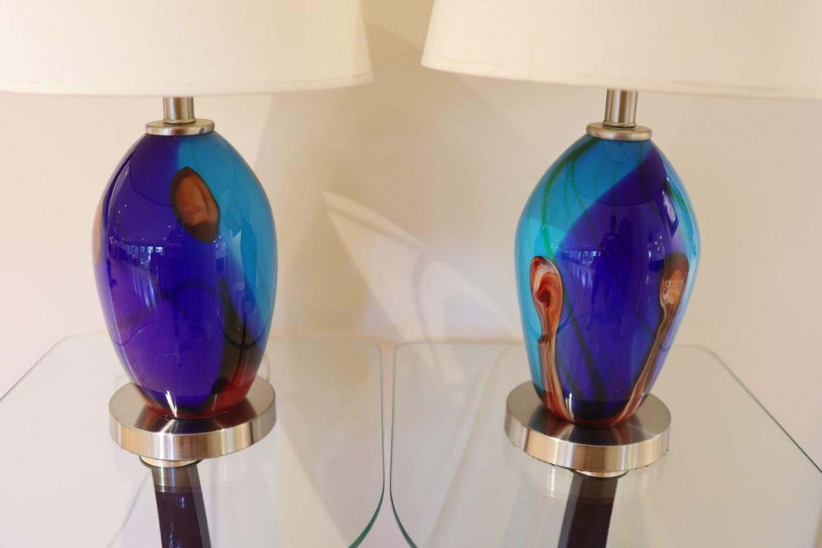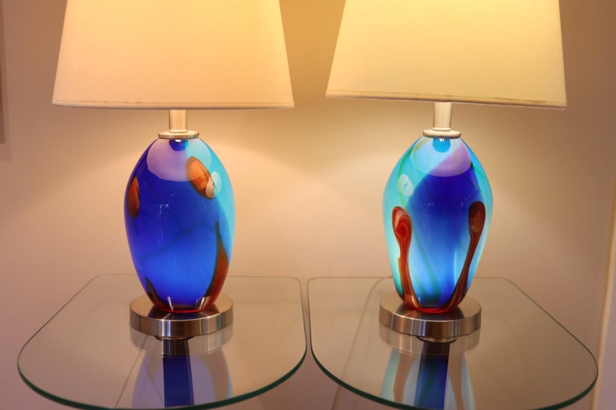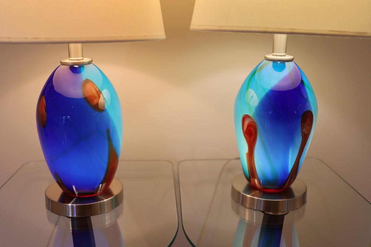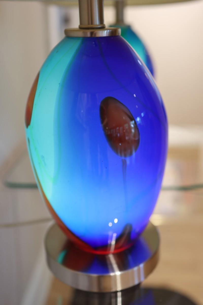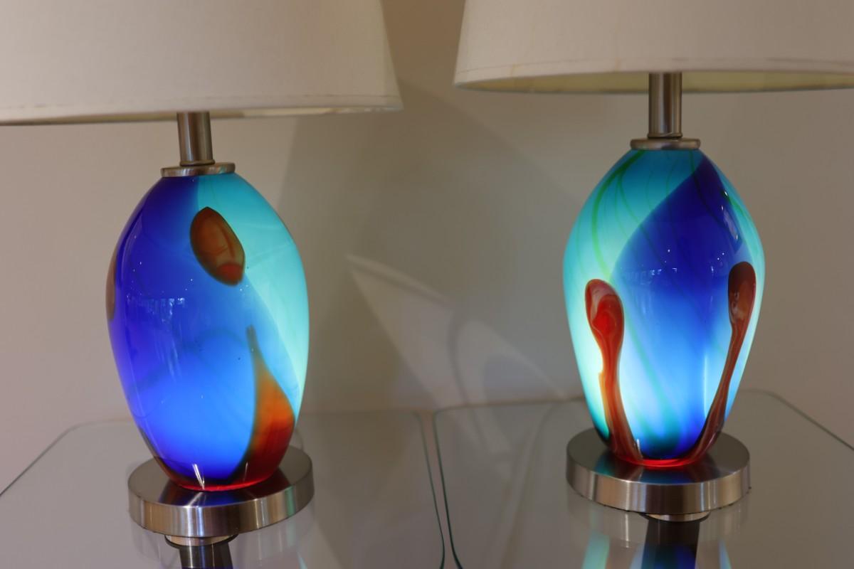 Pair of Art Glass Table Lamps with Internal Lights – Blue and Amber Swirl