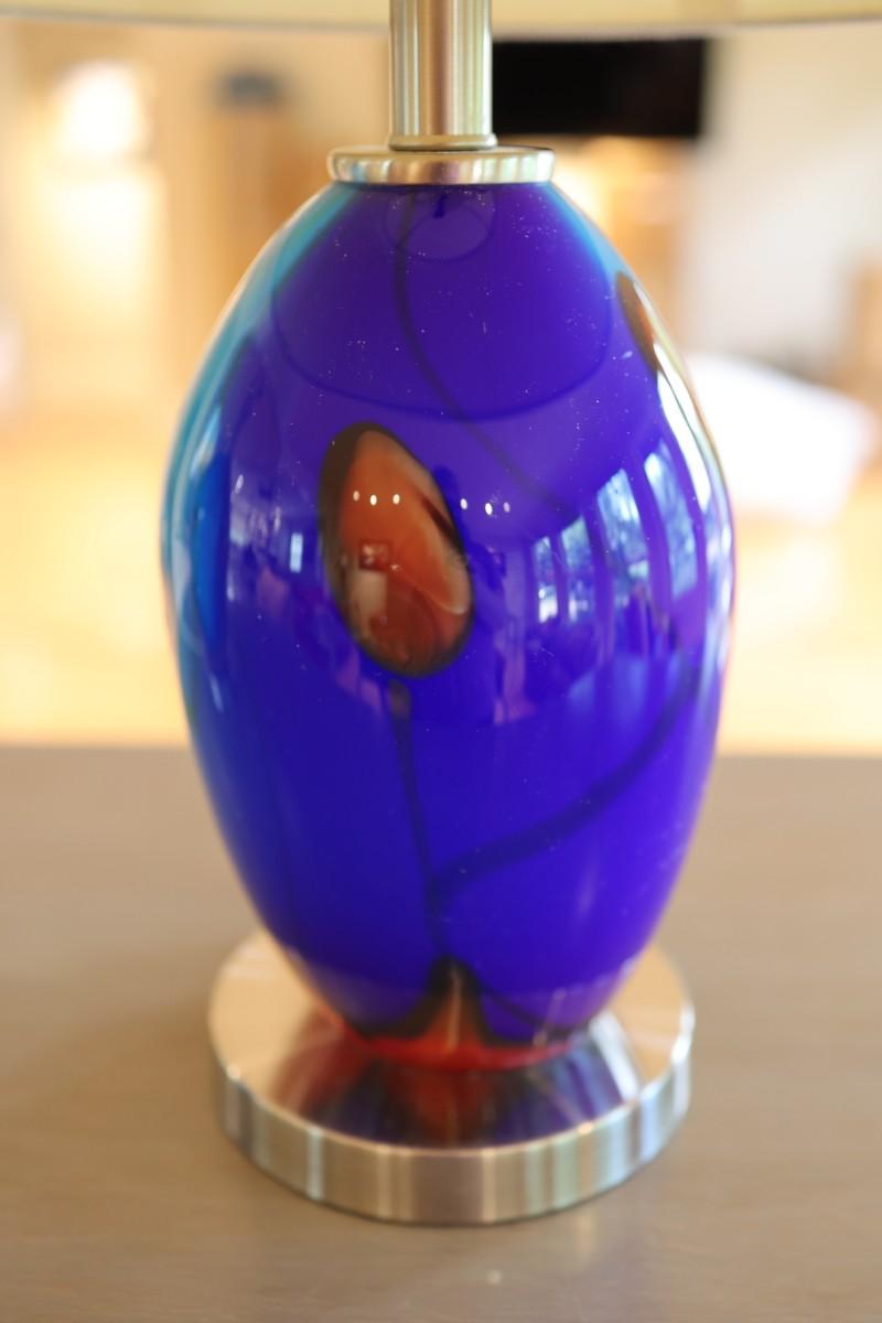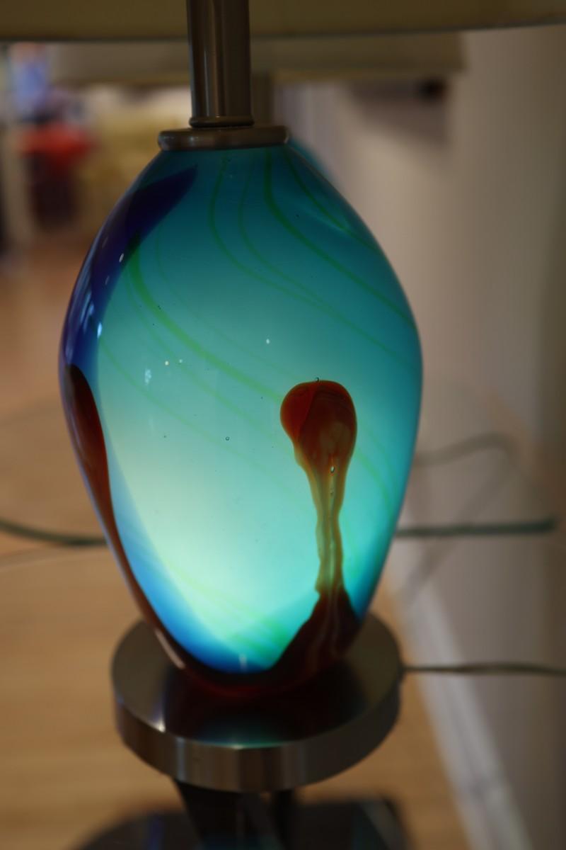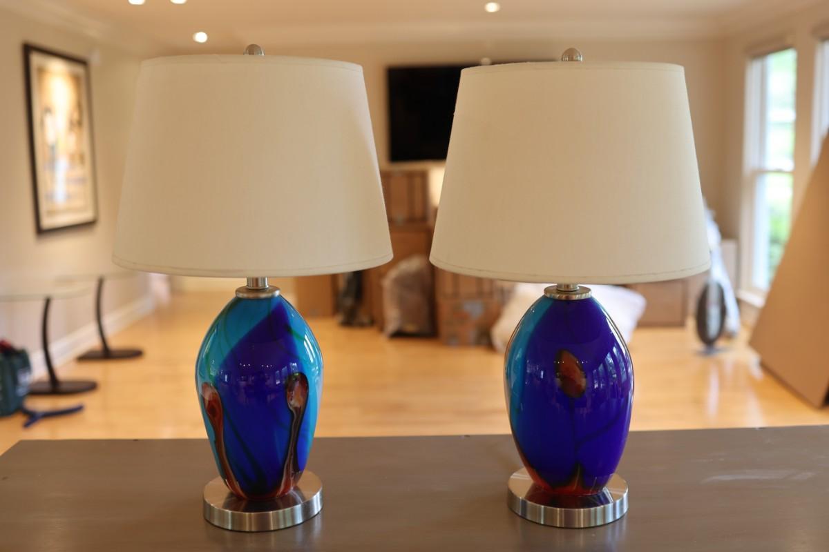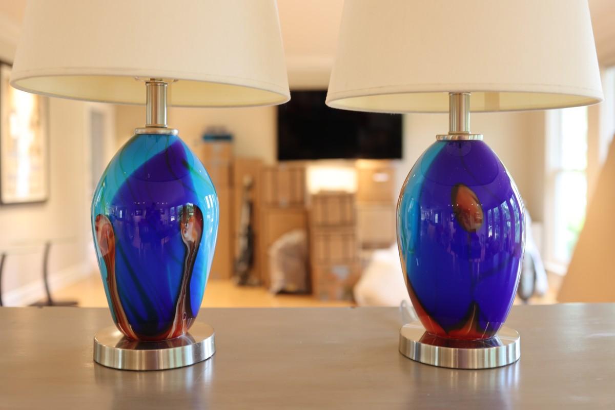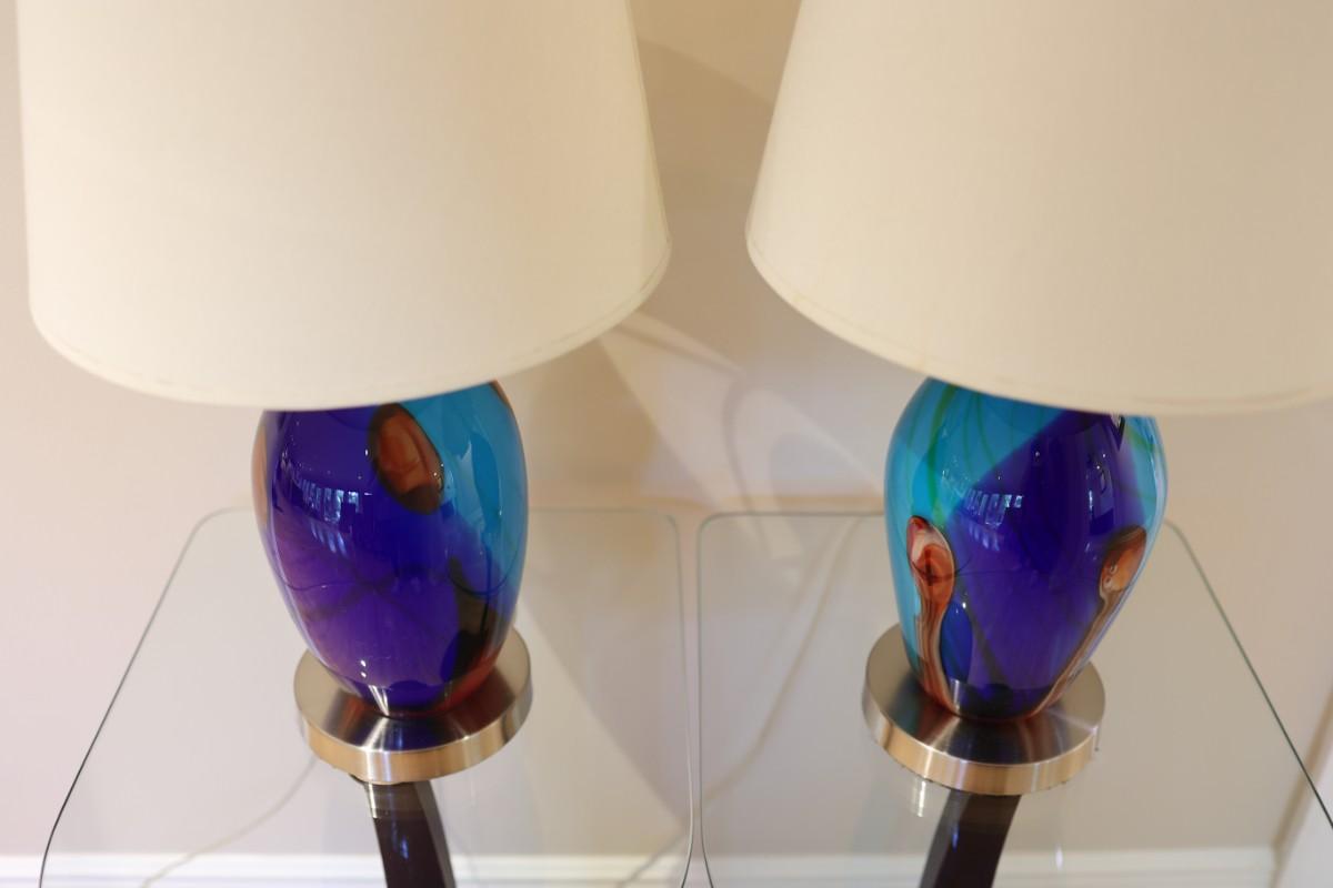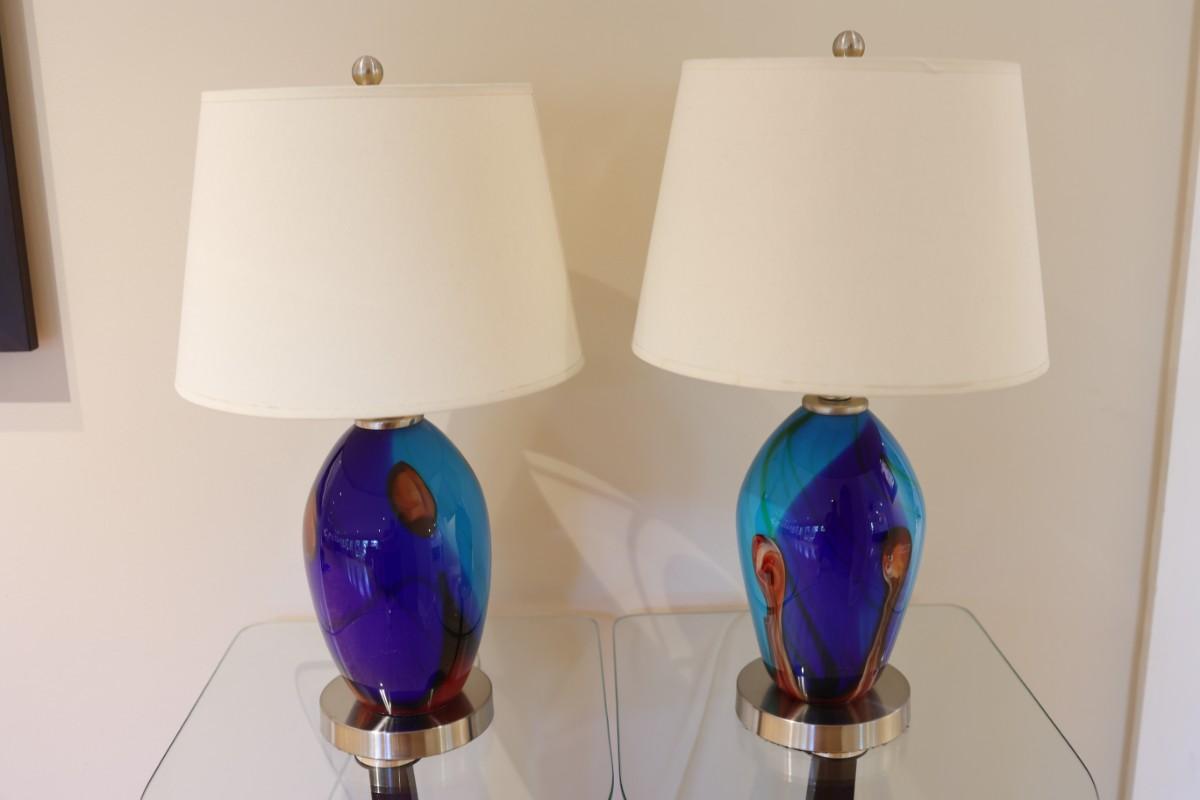 Pair of Art Glass Table Lamps with Internal Lights – Blue and Amber Swirl