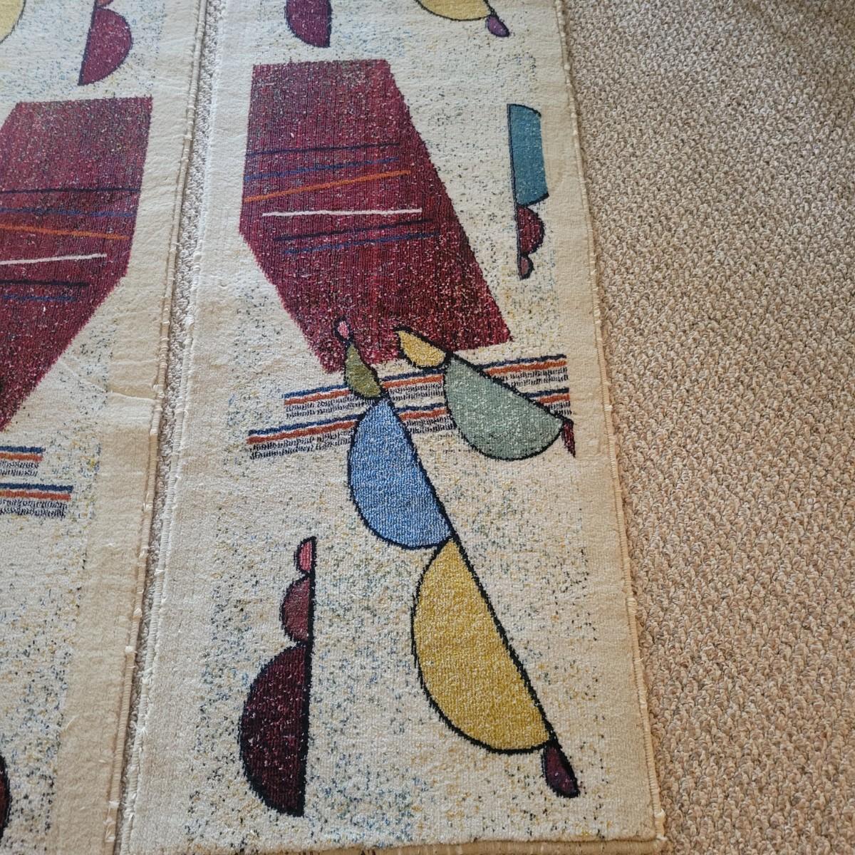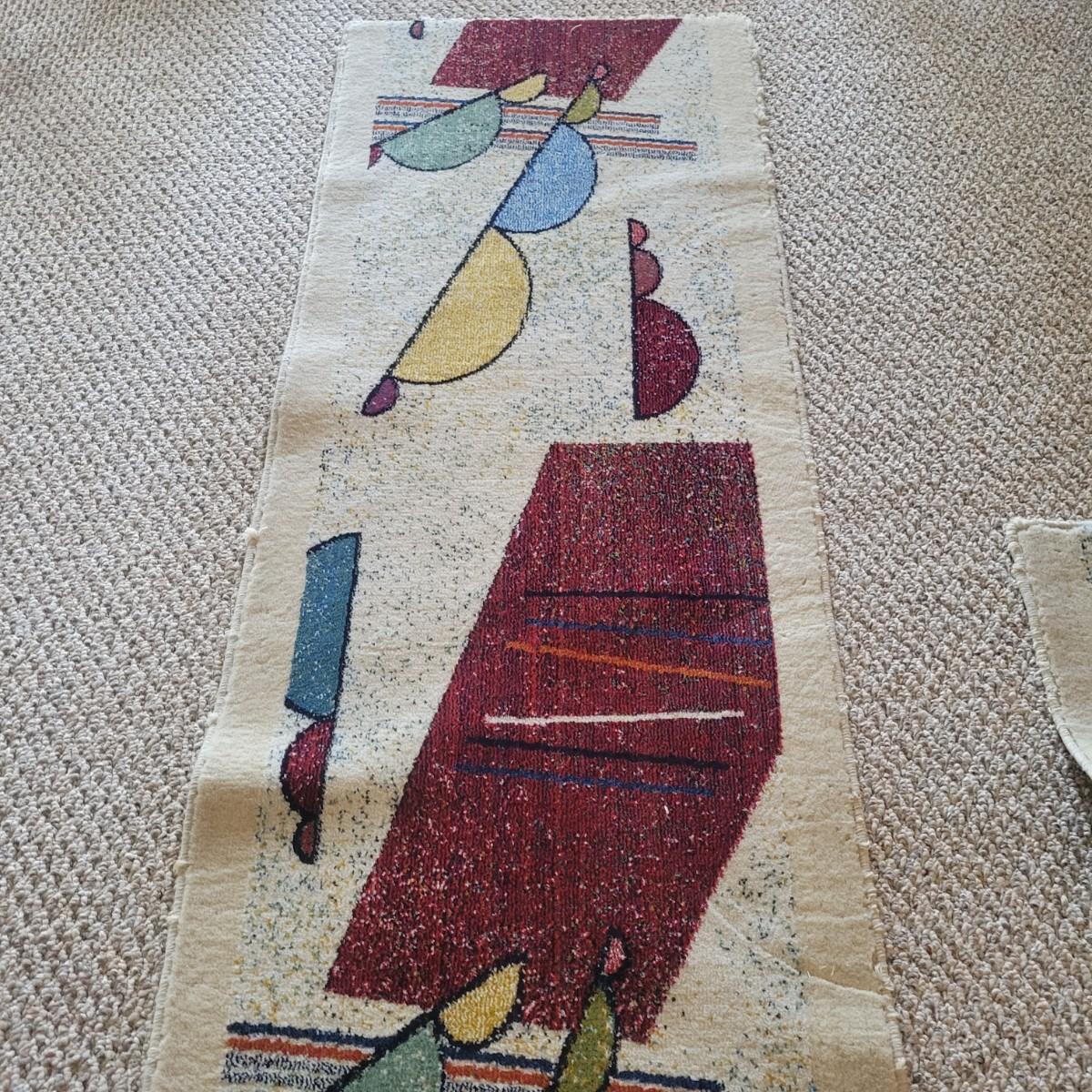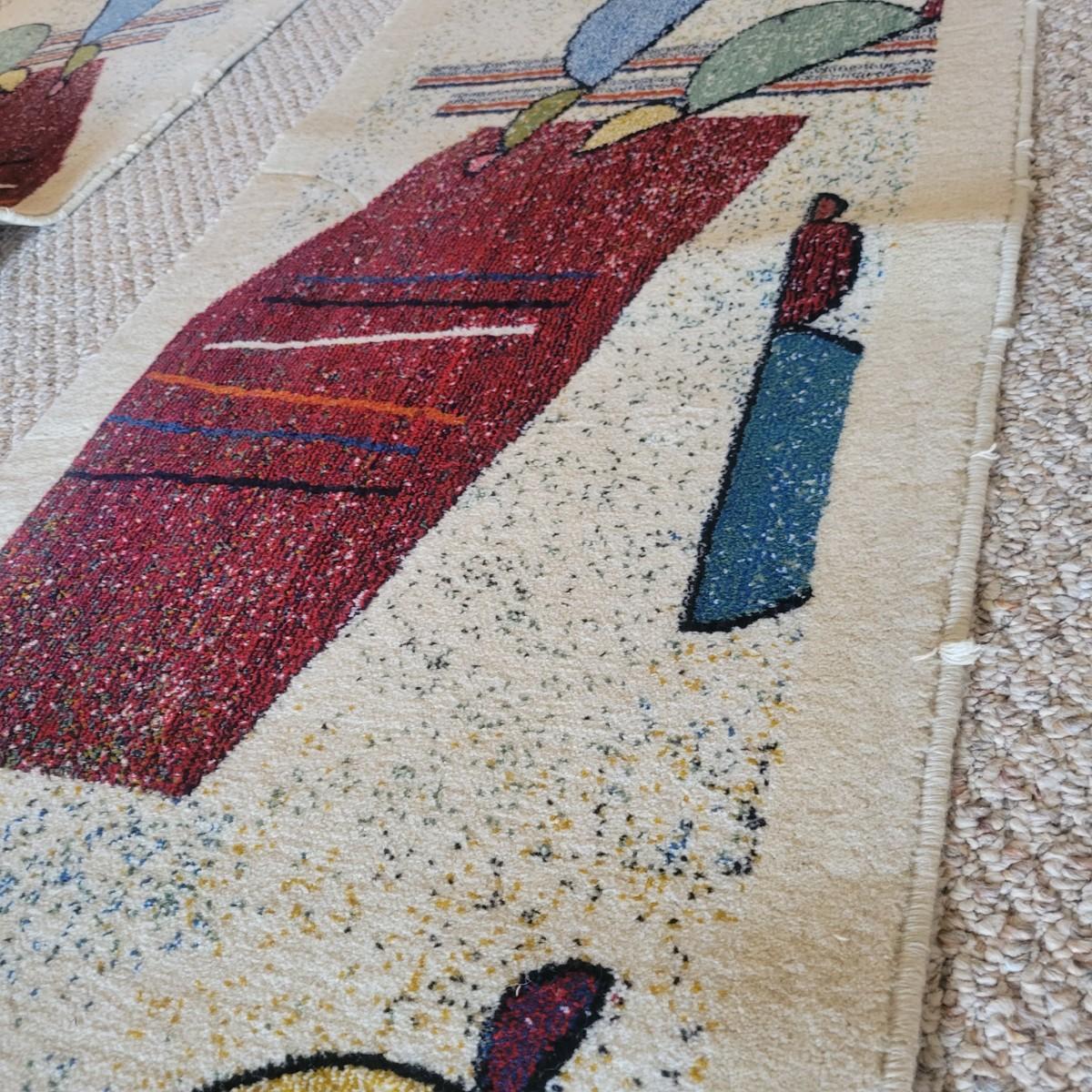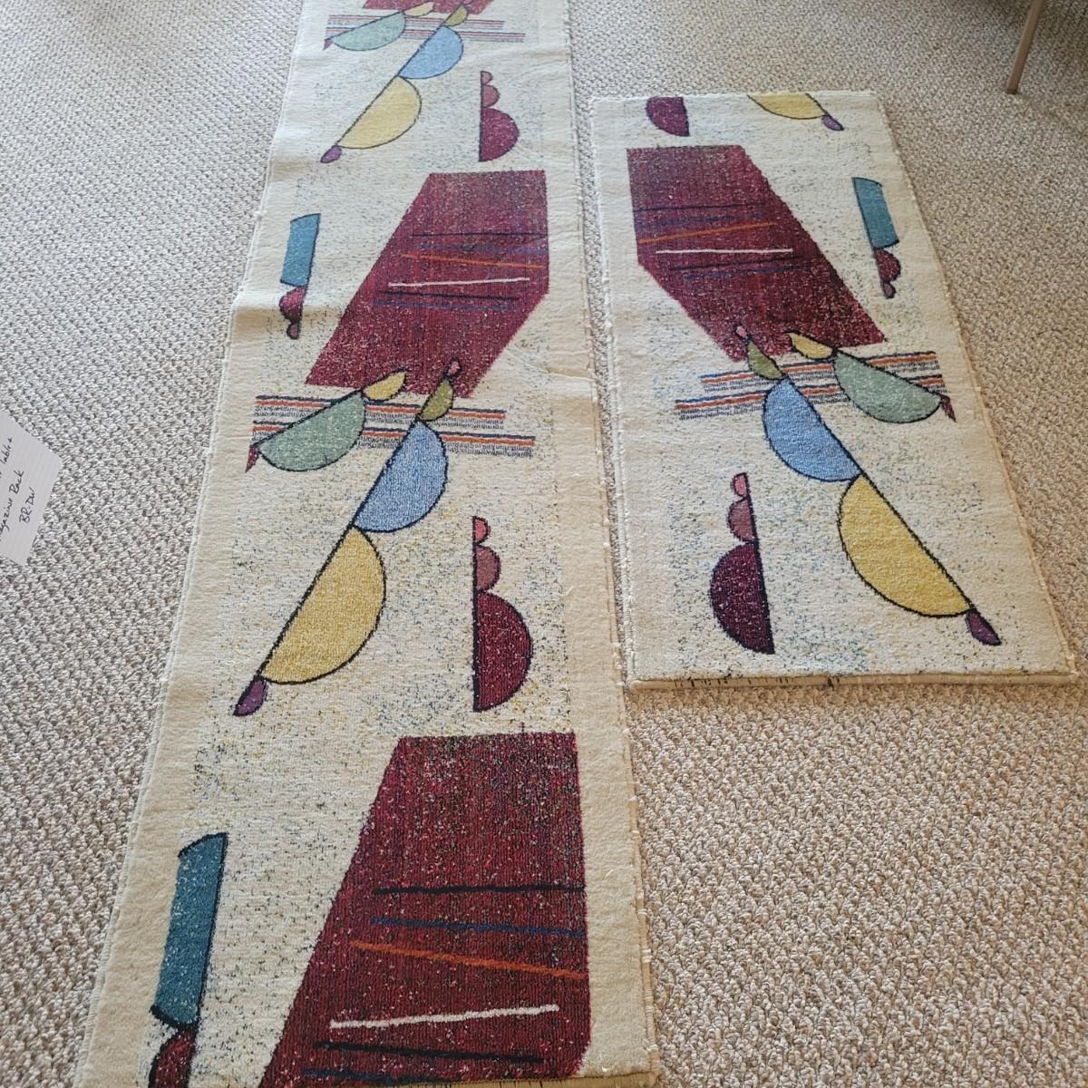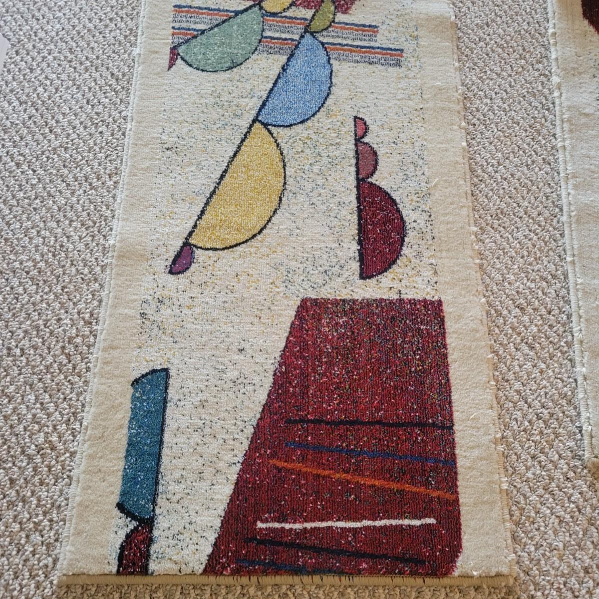 A pair of matching modern runner rugs. Theses runners feature a modern design with bold and rich colors with a neutral background. There is some minor fraying on the edges and the largest rug measures approximately 23" x 78". Local pickup only