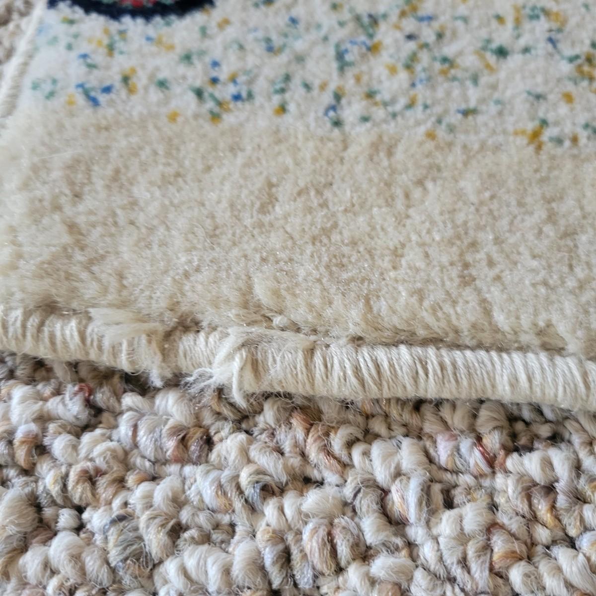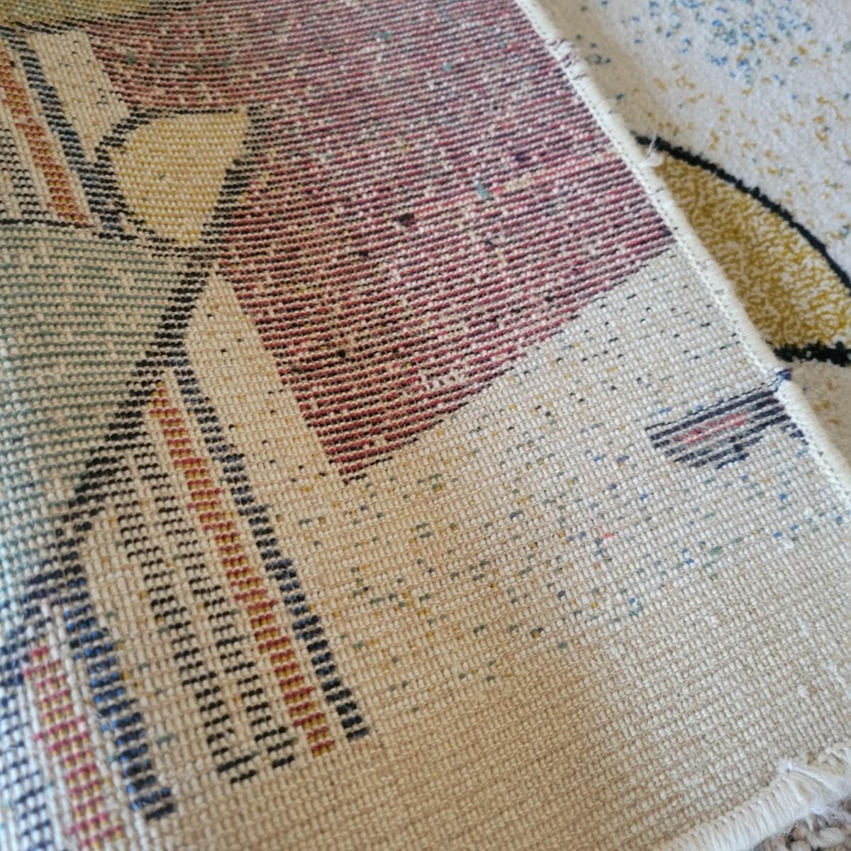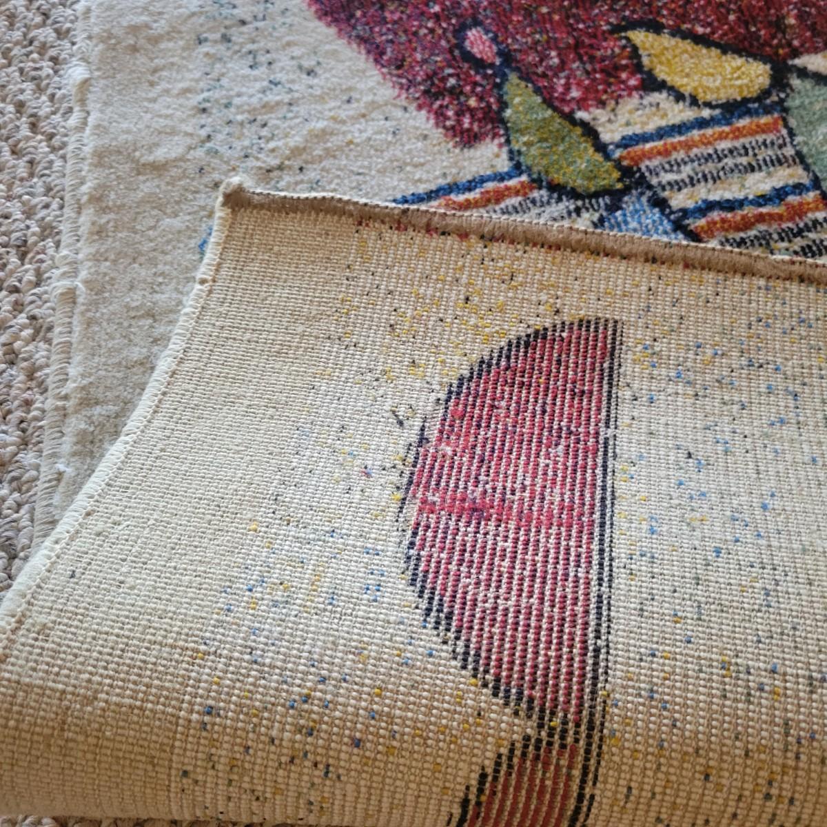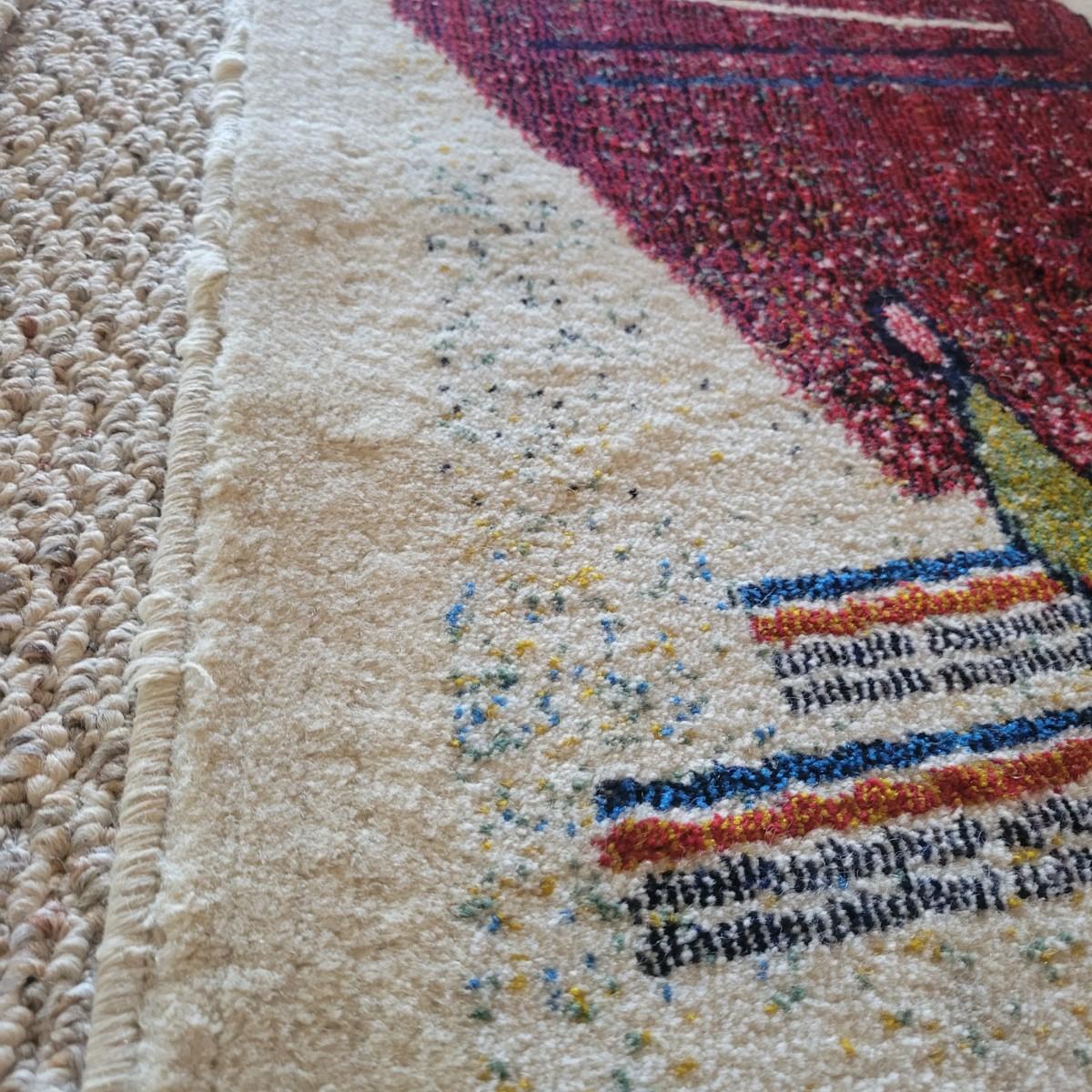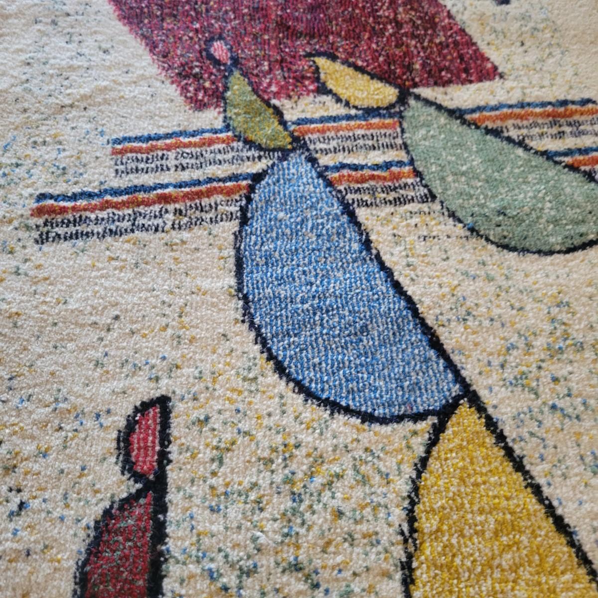 A pair of matching modern runner rugs. Theses runners feature a modern design with bold and rich colors with a neutral background. There is some minor fraying on the edges and the largest rug measures approximately 23" x 78". Local pickup only