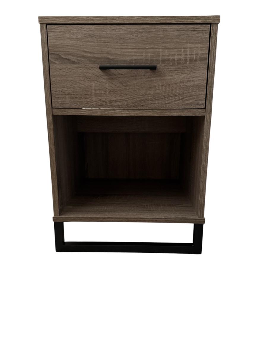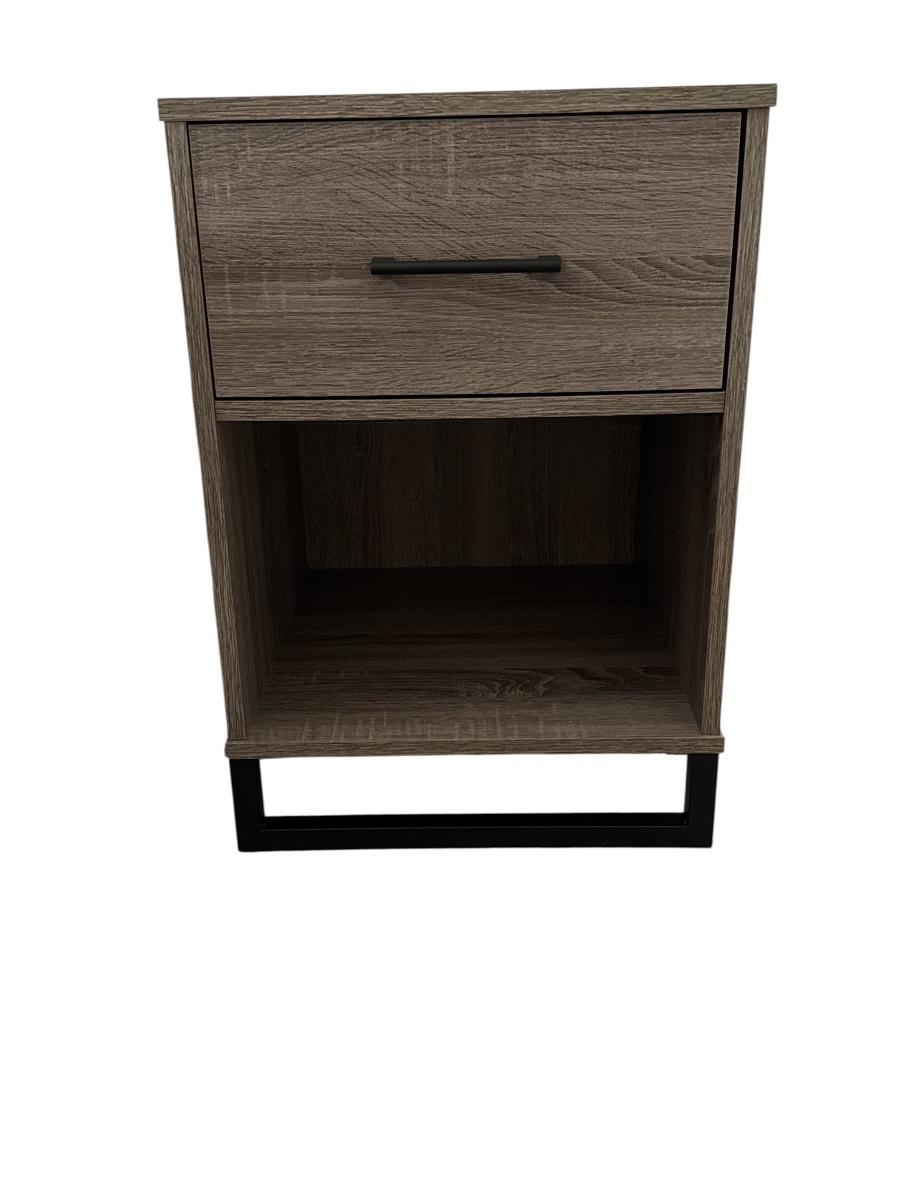 Pair of modern side tables with weathered wood finish, single drawer, and open lower shelf. Features a sleek black metal base and minimalist black drawer pull. Great for bedside or living room use.