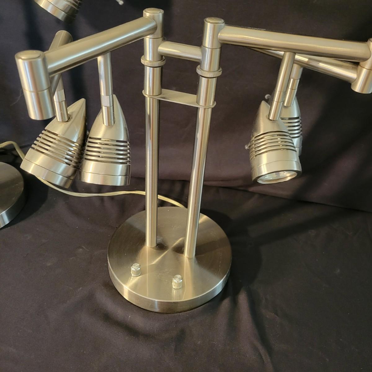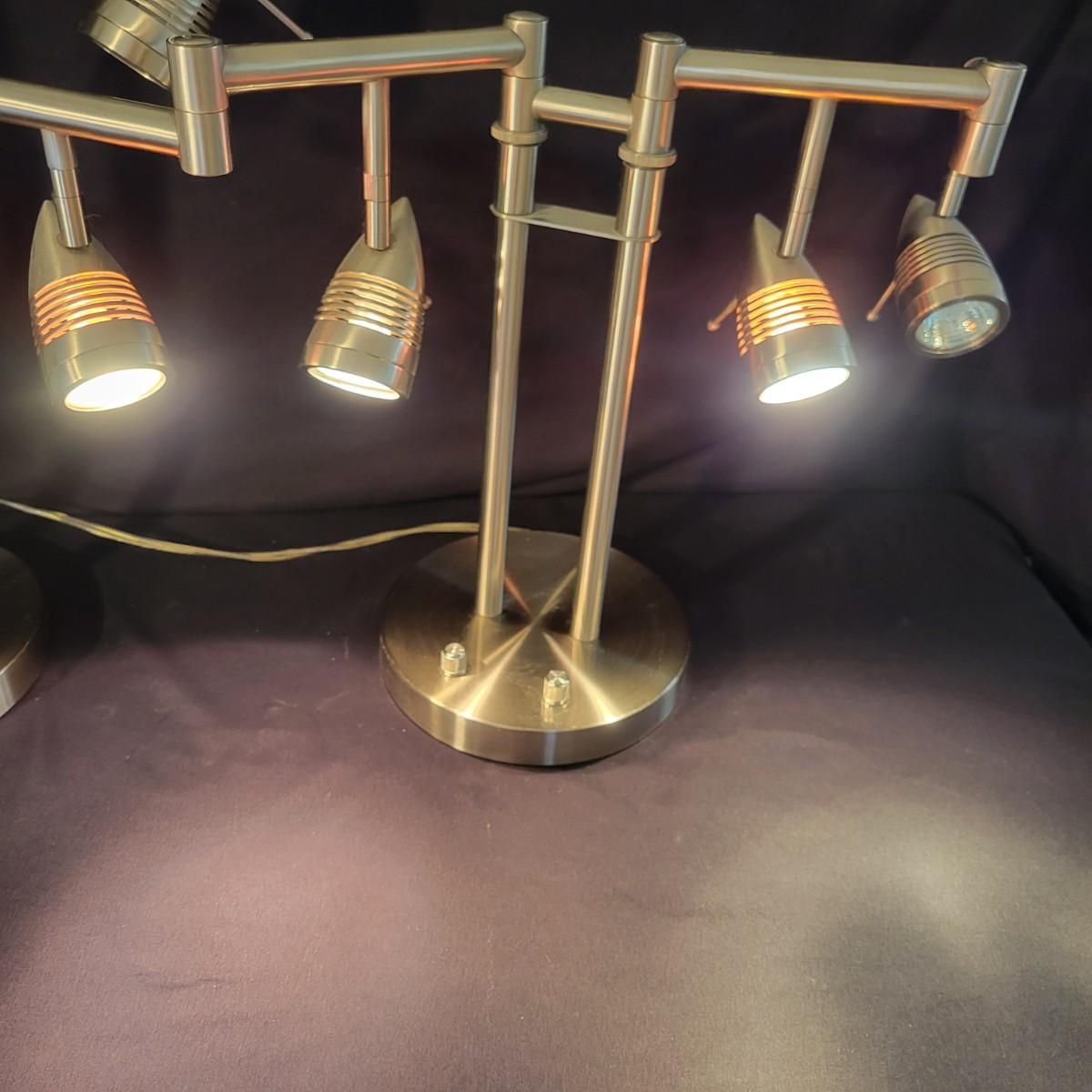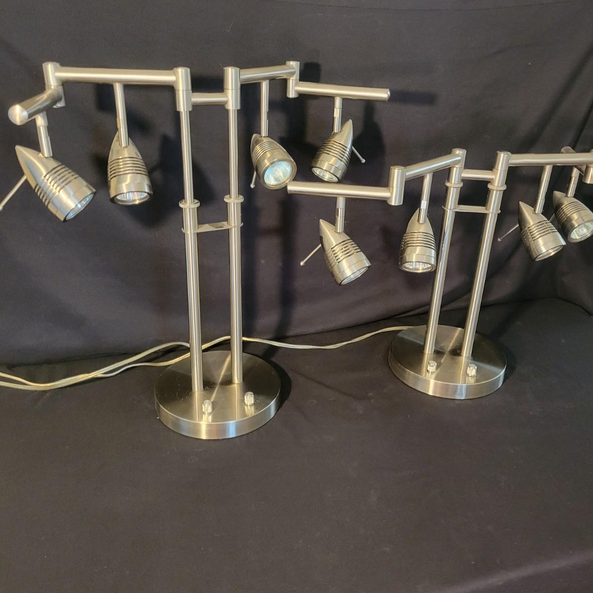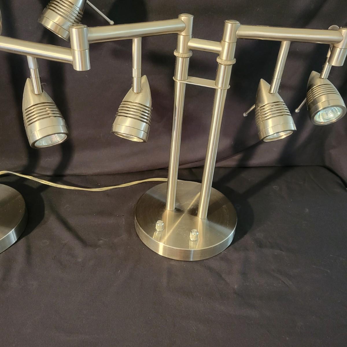 A pair of modern halogen lamps in good condition with no notable damage. Both lamps were tested and work. Each lamp features four direction adjustable halogen lamps that have moving arms and adjustable height. The minimum and maximum height are shown in the side by side pic. Each lamp has two on off switches with dimmers and feel substantial in their construction. The maximum height measures approximately 27" x 8" x 20.5". Shipping available. Shipping can be costly. We suggest calling our local UPS with dimensions and getting an estimate before bidding: (828) 252-6930