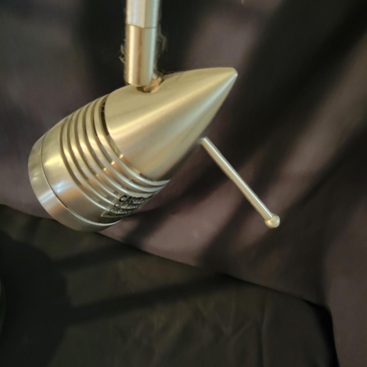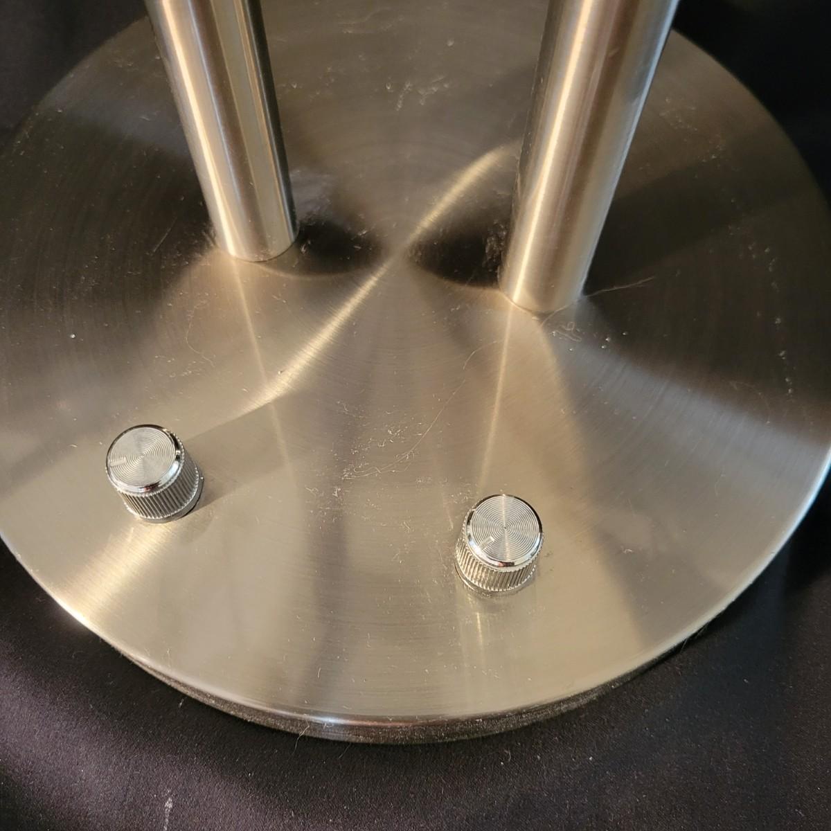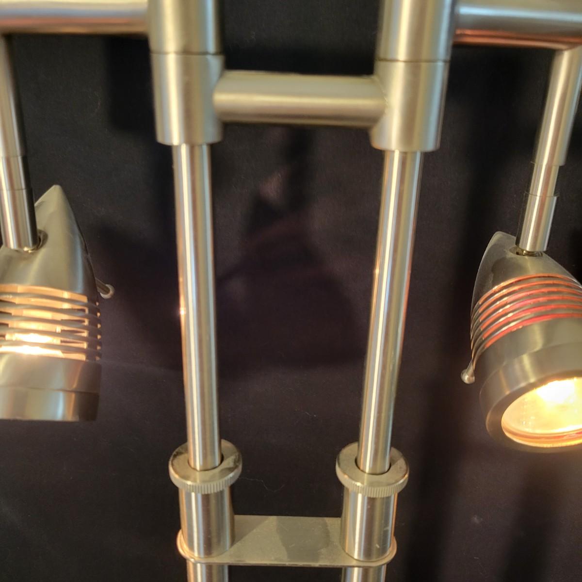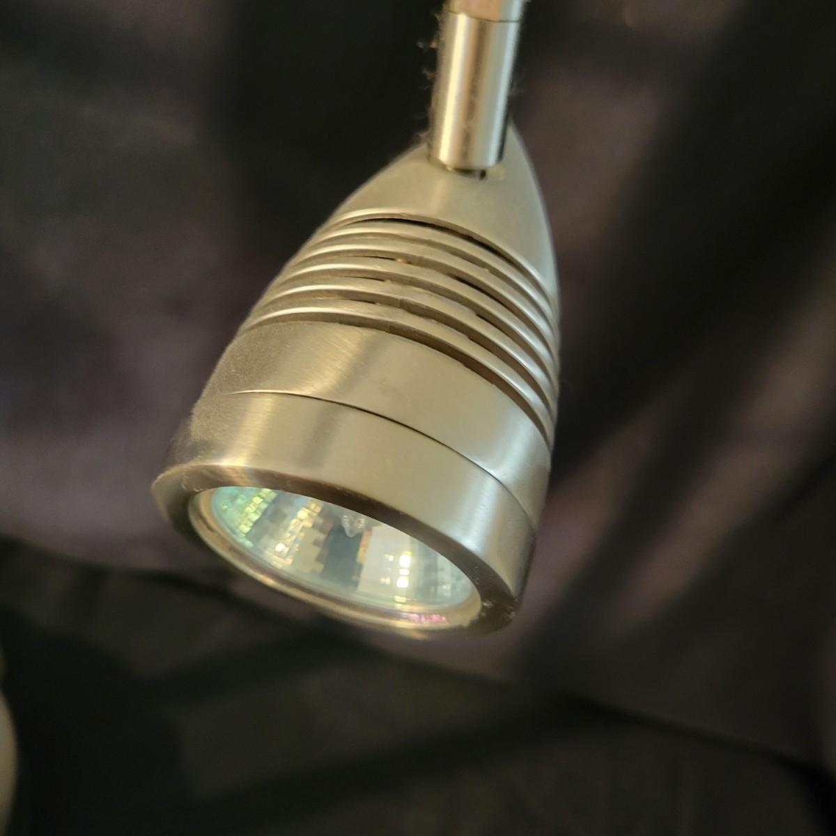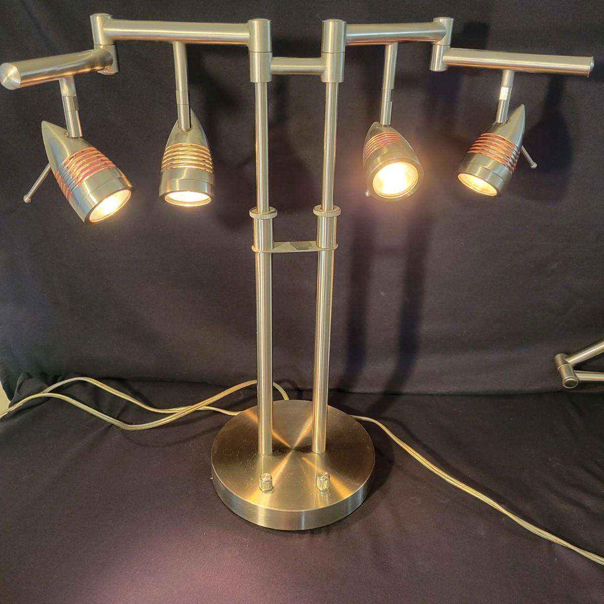 A pair of modern halogen lamps in good condition with no notable damage. Both lamps were tested and work. Each lamp features four direction adjustable halogen lamps that have moving arms and adjustable height. The minimum and maximum height are shown in the side by side pic. Each lamp has two on off switches with dimmers and feel substantial in their construction. The maximum height measures approximately 27" x 8" x 20.5". Shipping available. Shipping can be costly. We suggest calling our local UPS with dimensions and getting an estimate before bidding: (828) 252-6930