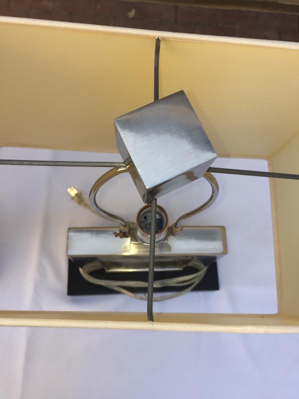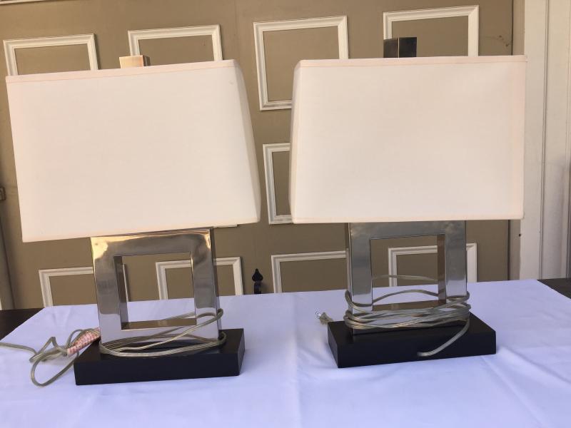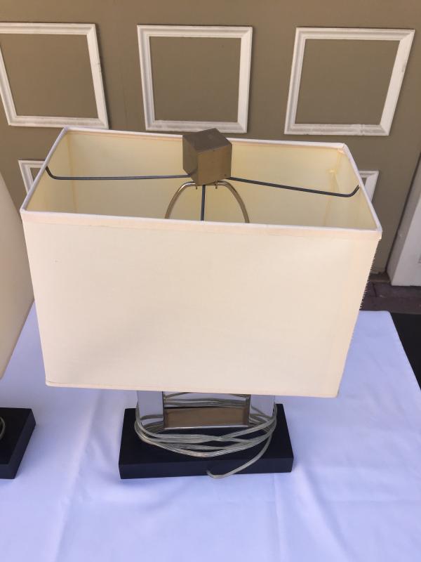 Base: 10" x 4" x 1.5". 21.5" tall. Shades included, although some wear and tear.