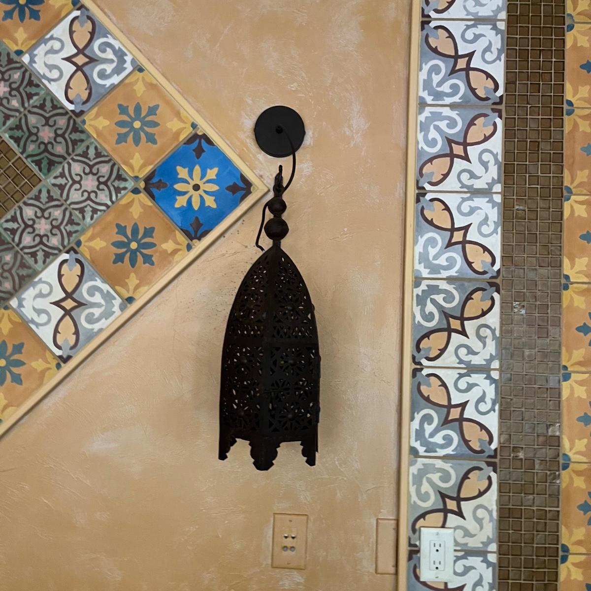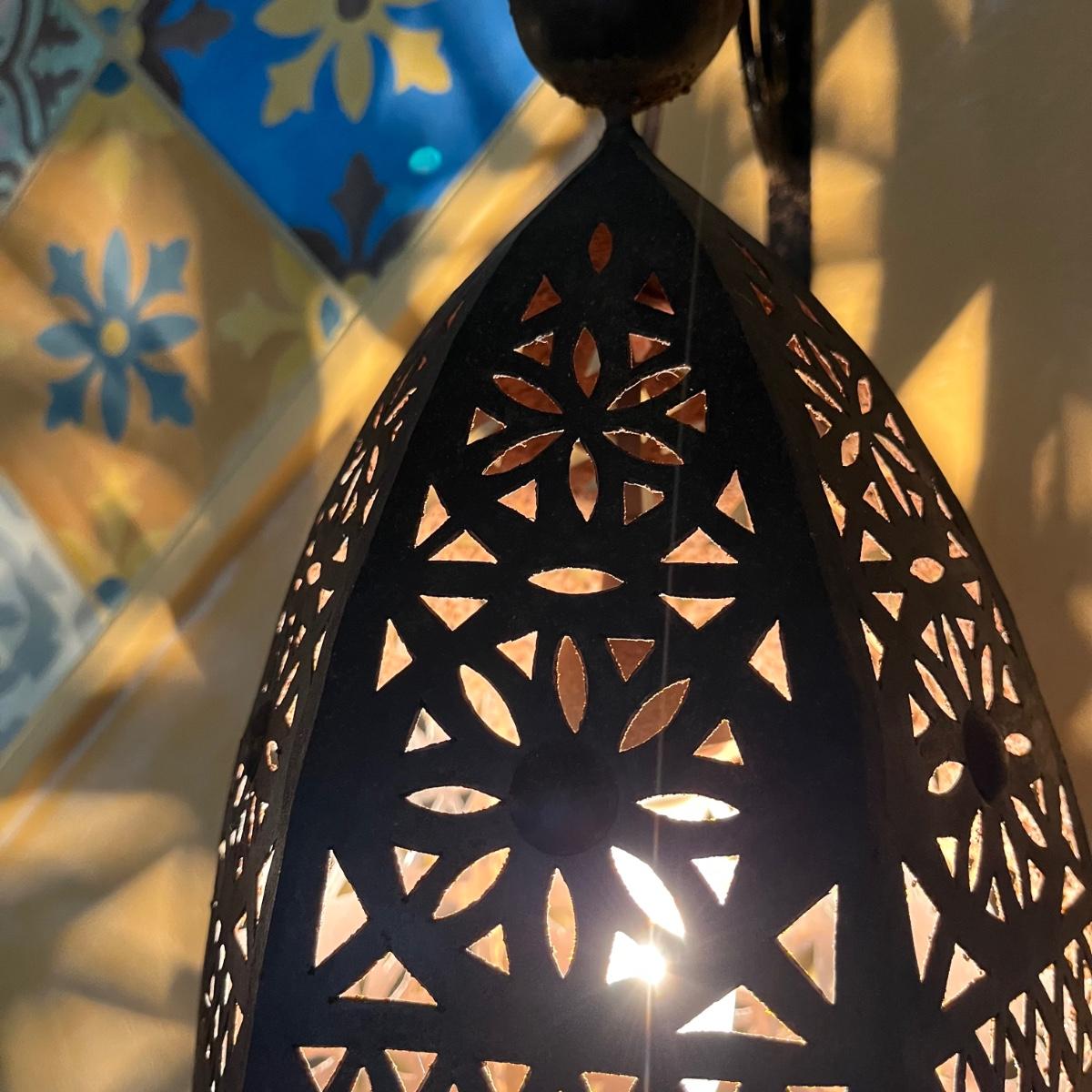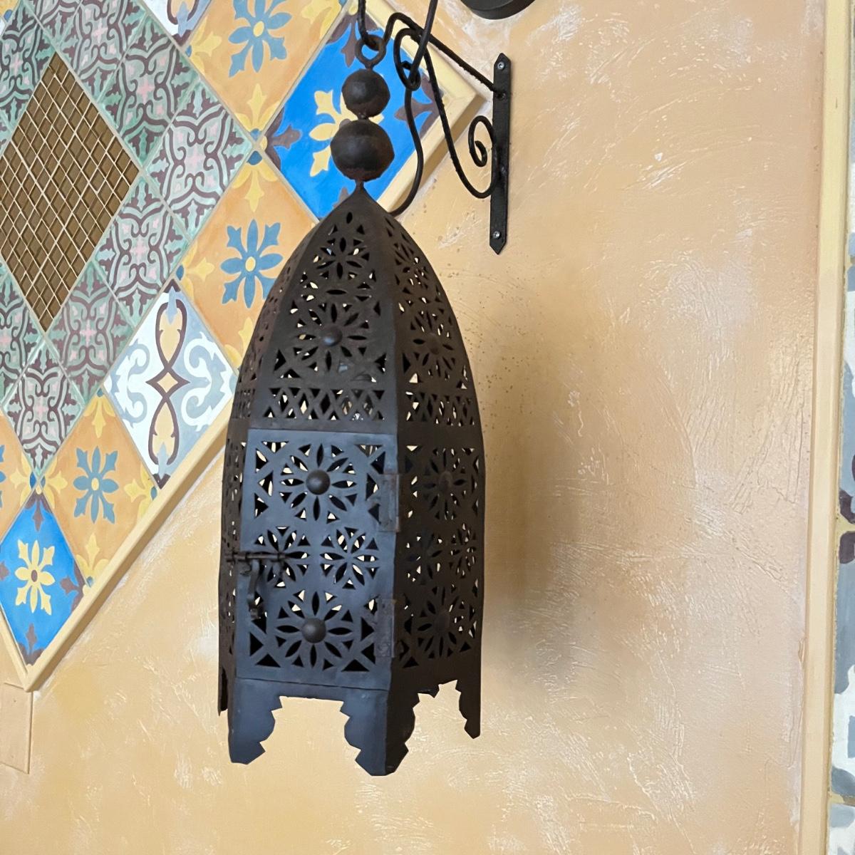 Lot includes a pair of metal Moroccan style candle holders that have been made into electric lights. Lights worked when tested. Lights measure 8”D x 23”H not counting hanging hardware. Hardware is included.