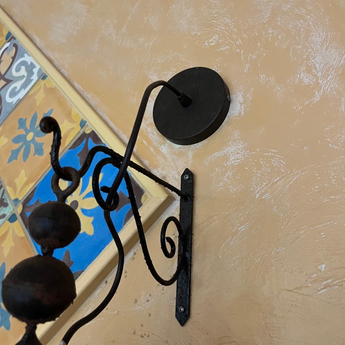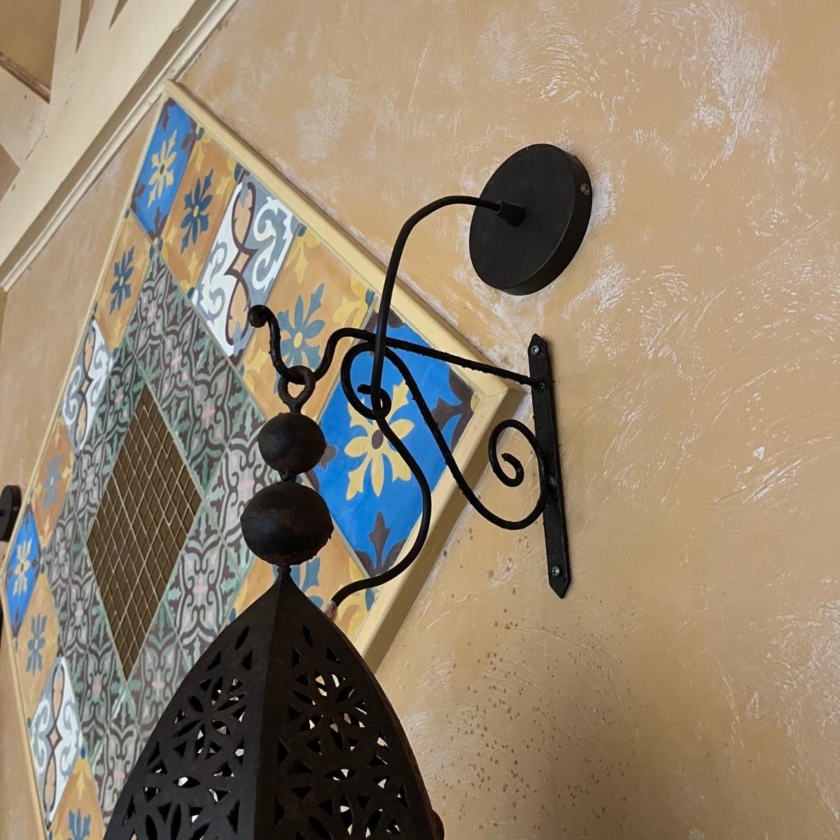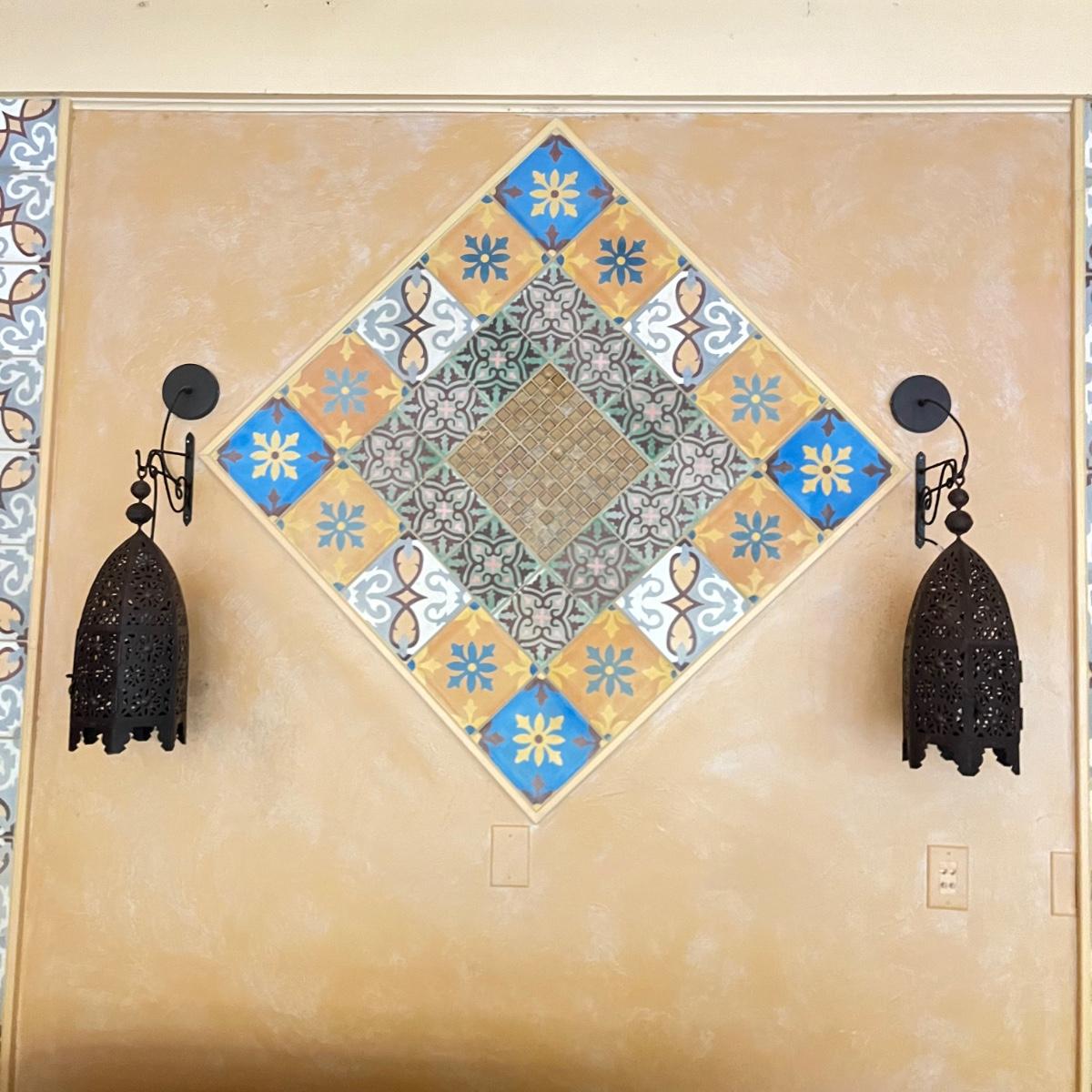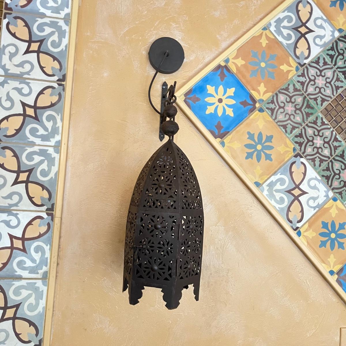 Lot includes a pair of metal Moroccan style candle holders that have been made into electric lights. Lights worked when tested. Lights measure 8”D x 23”H not counting hanging hardware. Hardware is included.