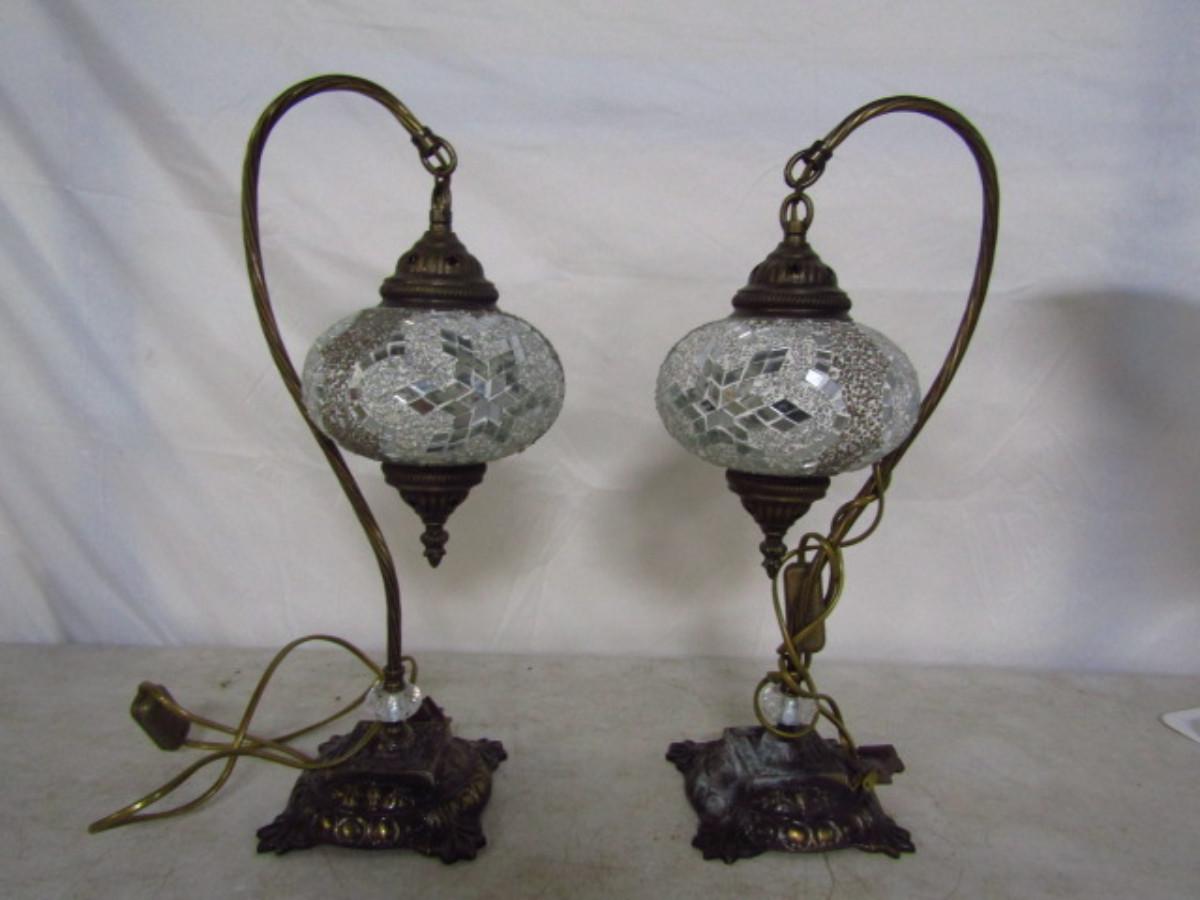 Pair of Morroccan Style Table Top Lamps. Pl.ease see all pictures- one lamp has discoloration on base.