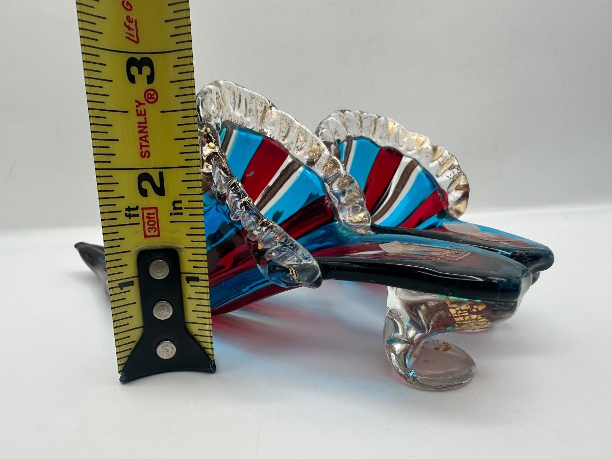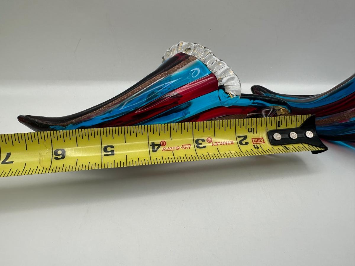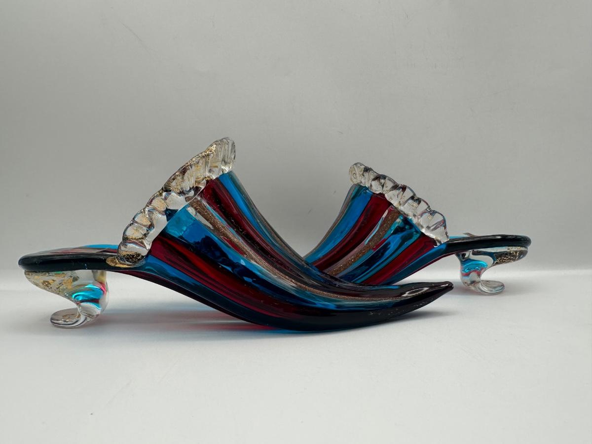 Decorative Murano art glass high-heel shoe sculpture by Vetri d’Arte, Italy. Hand-blown with flowing ribbed form in layered blue and red glass with gold fleck accents and clear rim detailing. Retains original Vetri d’Arte – Murano (VE) – Made in Italy label.
