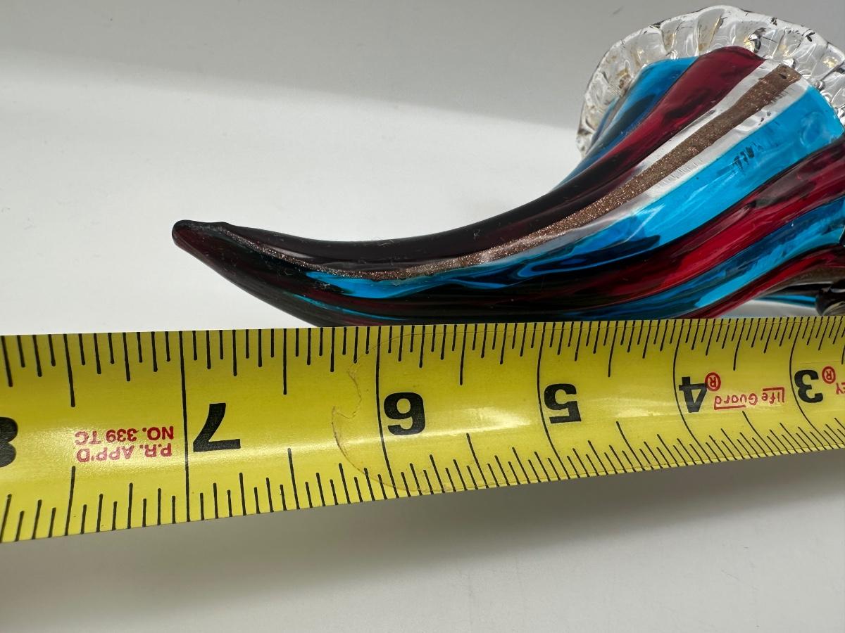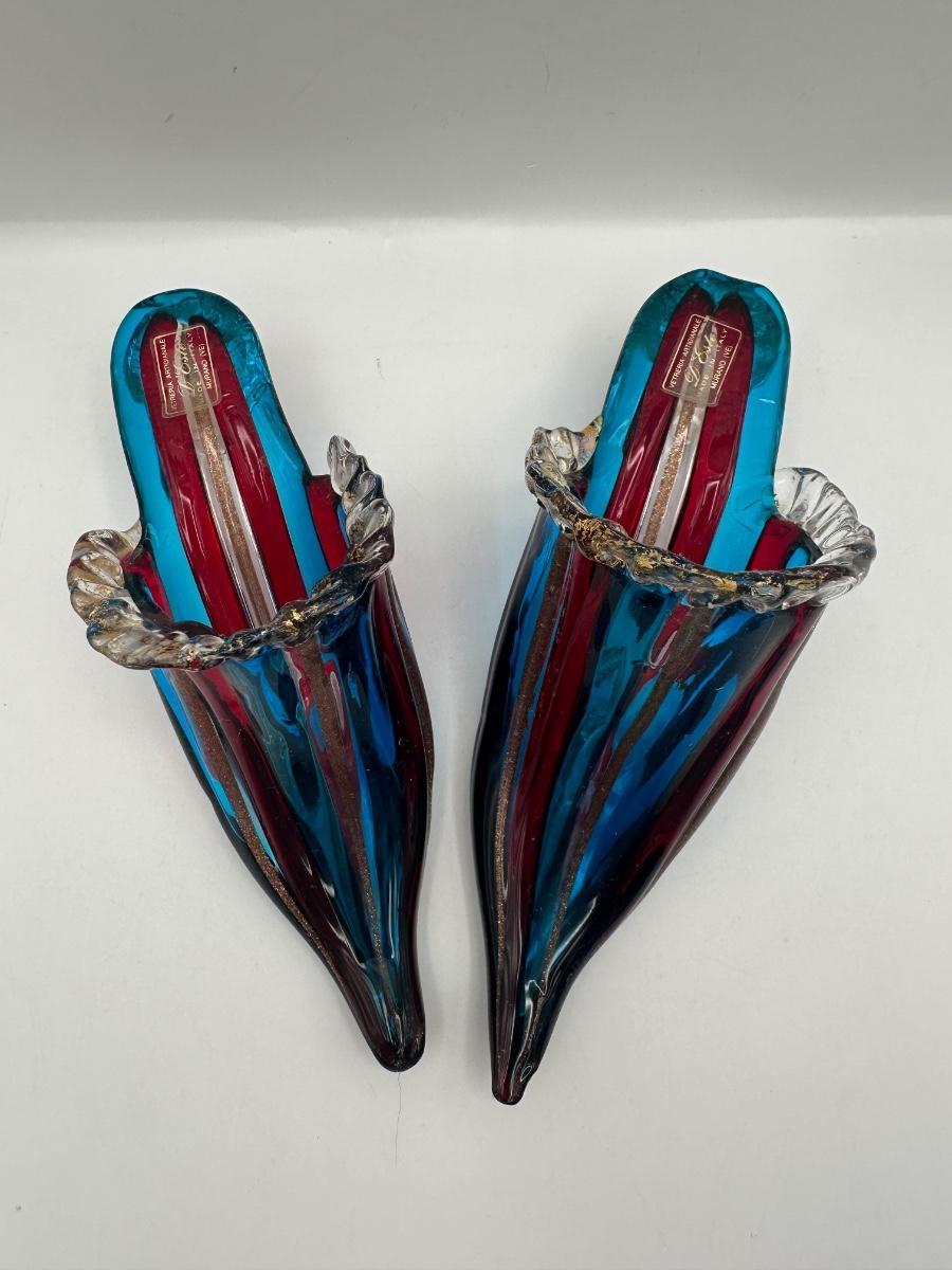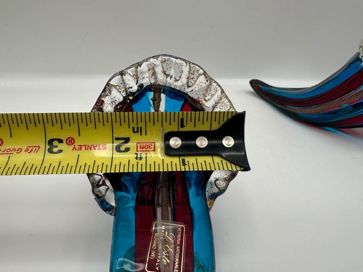 Decorative Murano art glass high-heel shoe sculpture by Vetri d’Arte, Italy. Hand-blown with flowing ribbed form in layered blue and red glass with gold fleck accents and clear rim detailing. Retains original Vetri d’Arte – Murano (VE) – Made in Italy label.