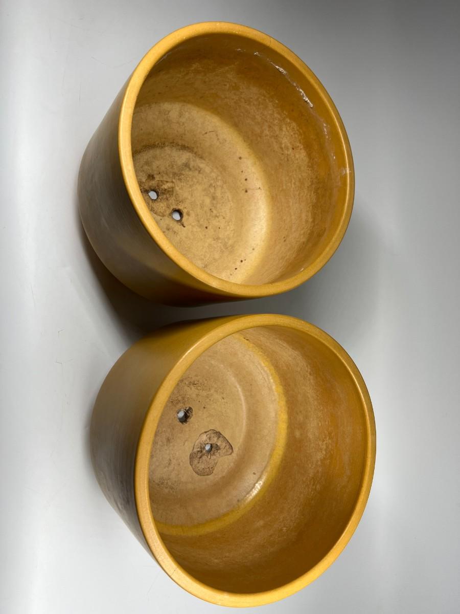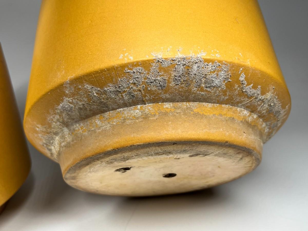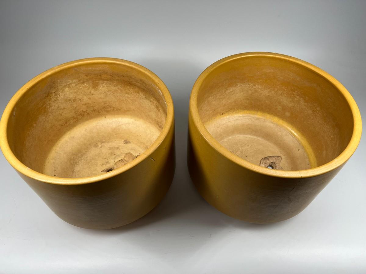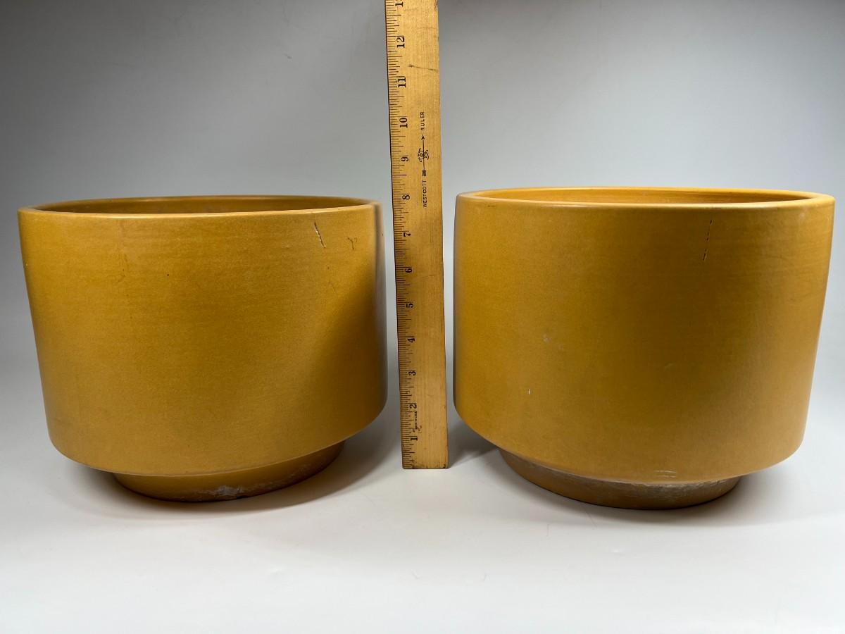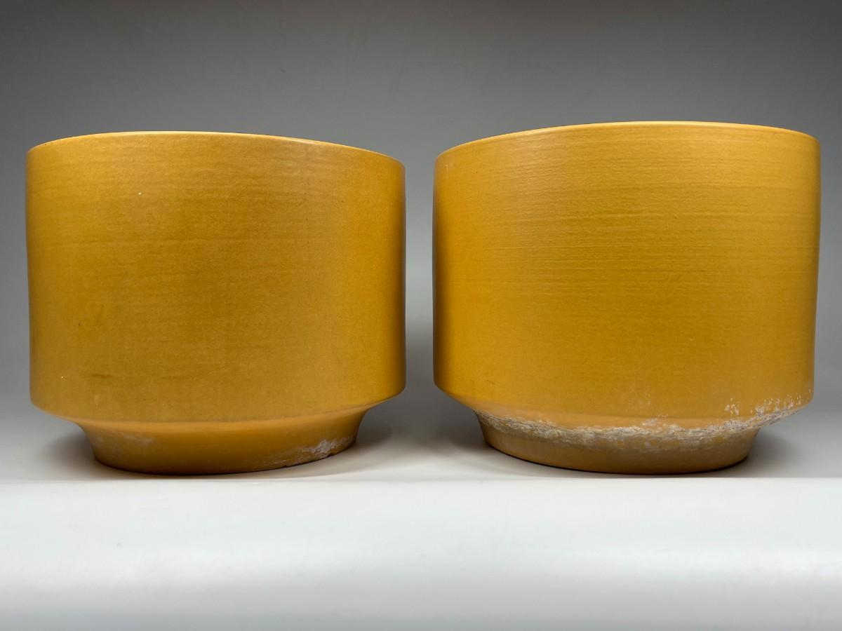 Pair of Mustard Yellow Gainey Ceramics La Verne 8" Planter Pots MCM Midcentury Pottery. In vintage condition. Display great. There is a fine line crack in one pot. See photos.