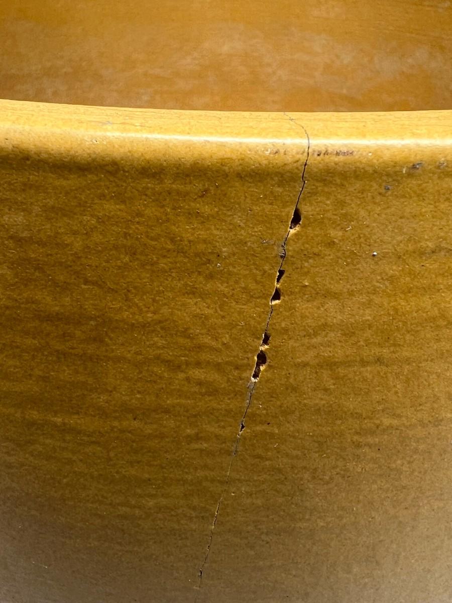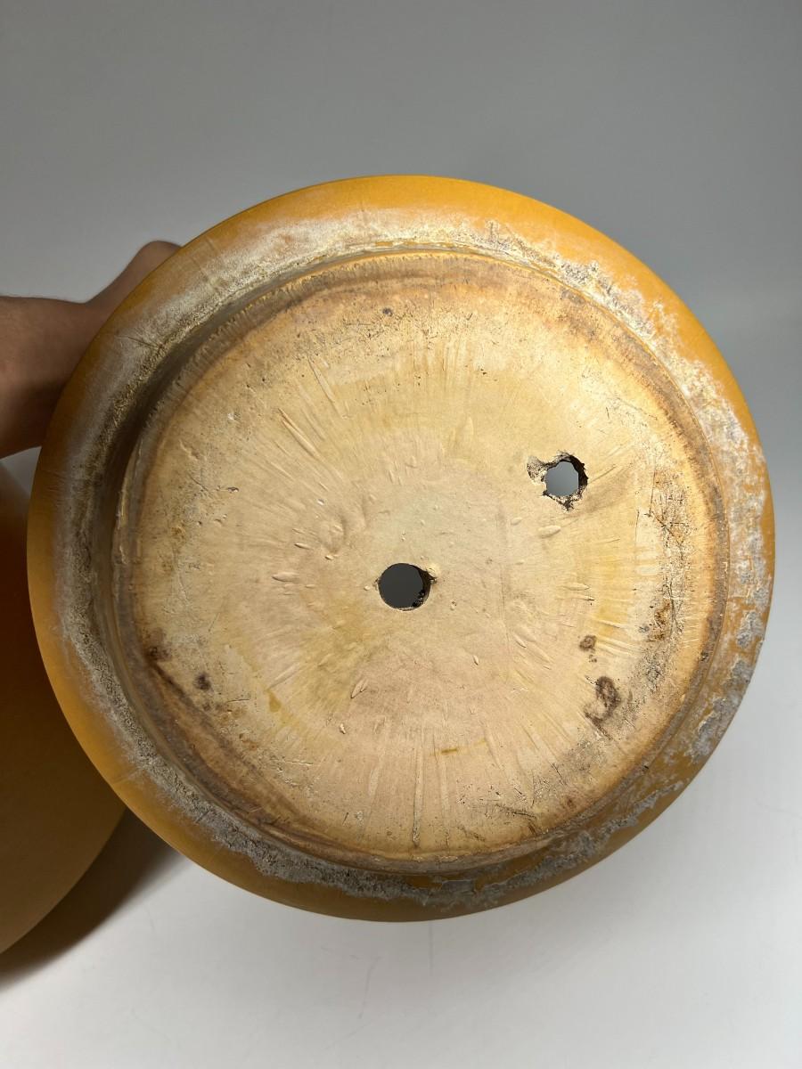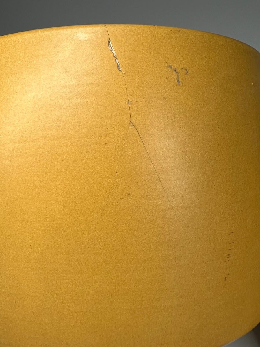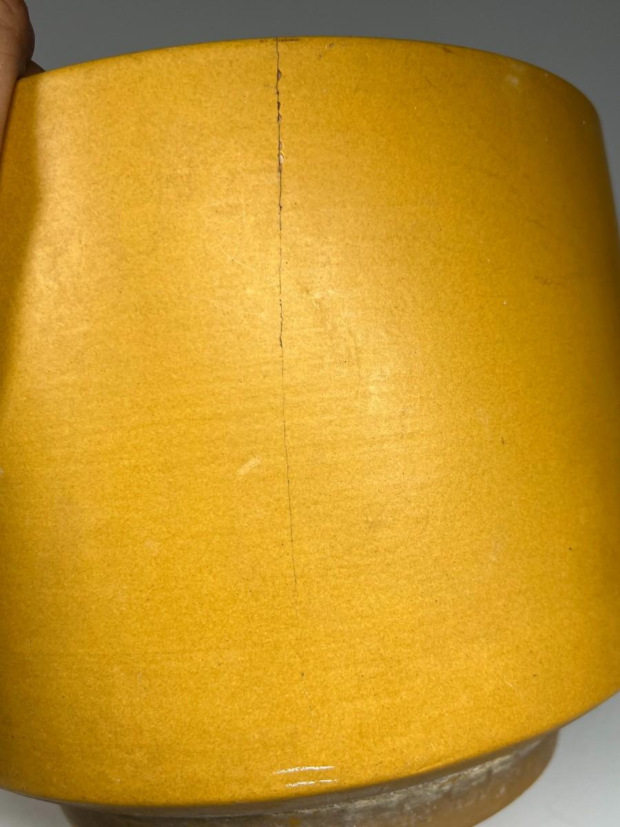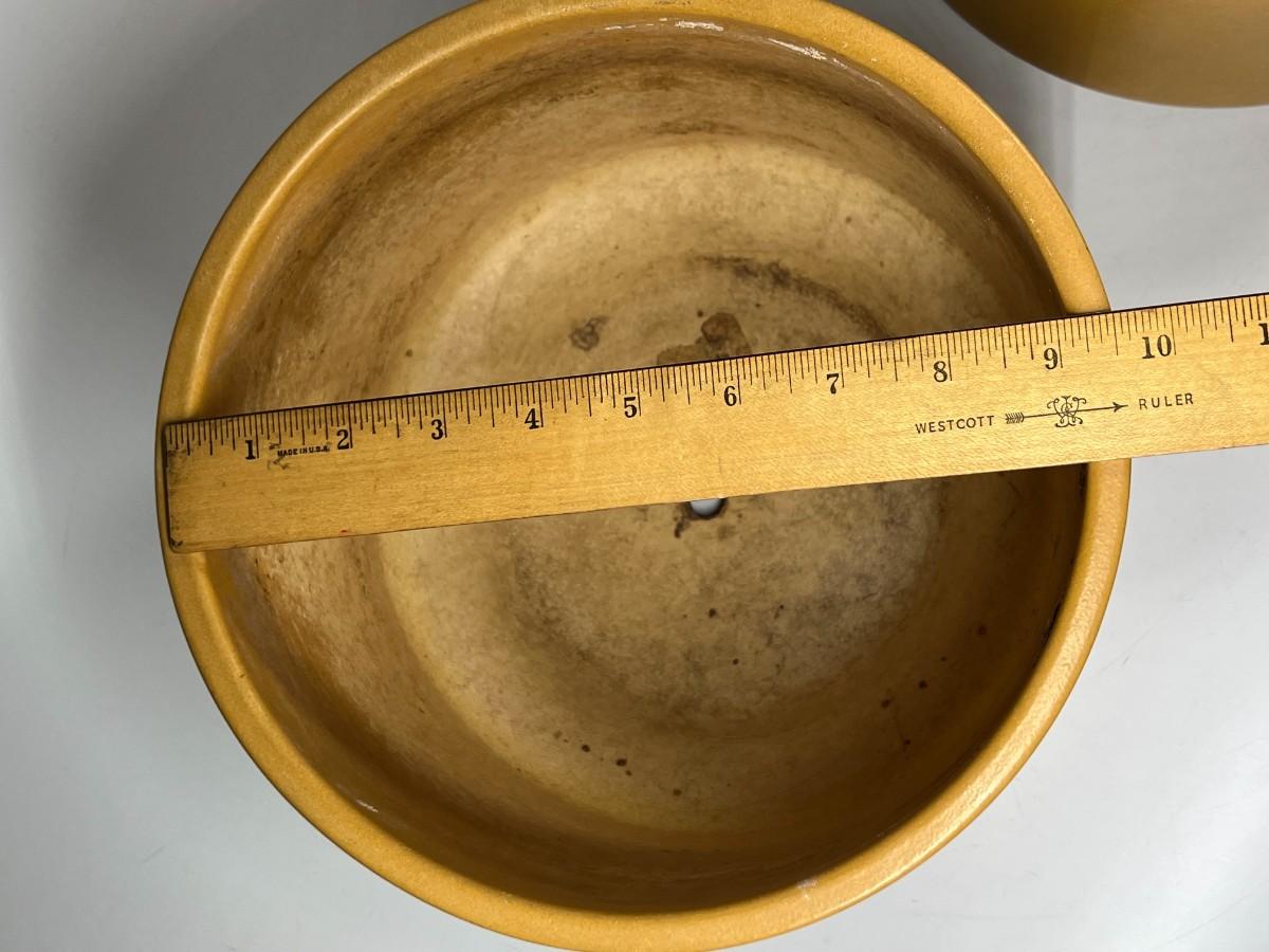 Pair of Mustard Yellow Gainey Ceramics La Verne 8" Planter Pots MCM Midcentury Pottery. In vintage condition. Display great. There is a fine line crack in one pot. See photos.