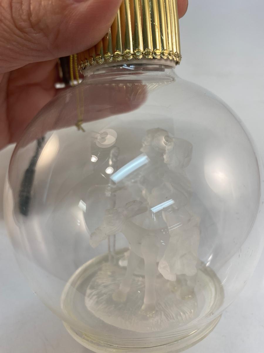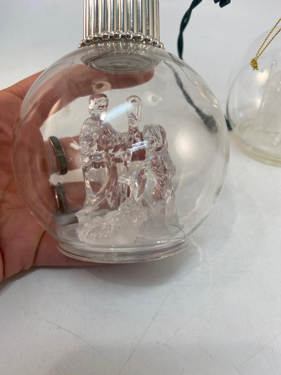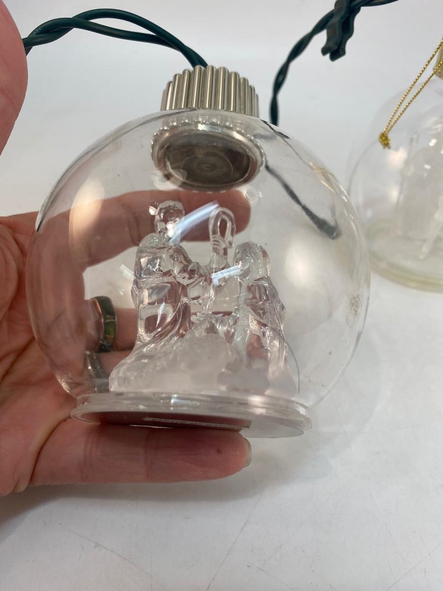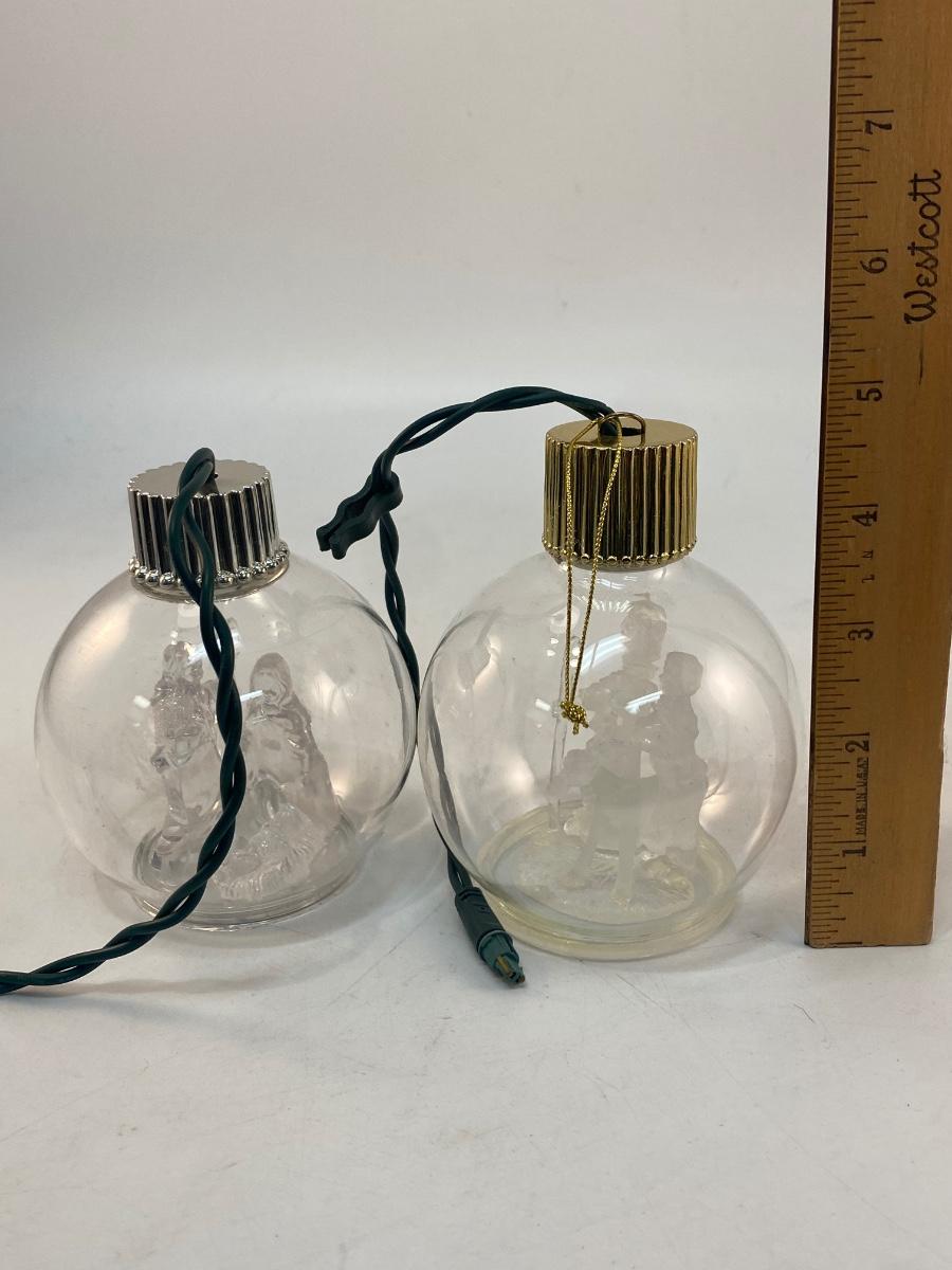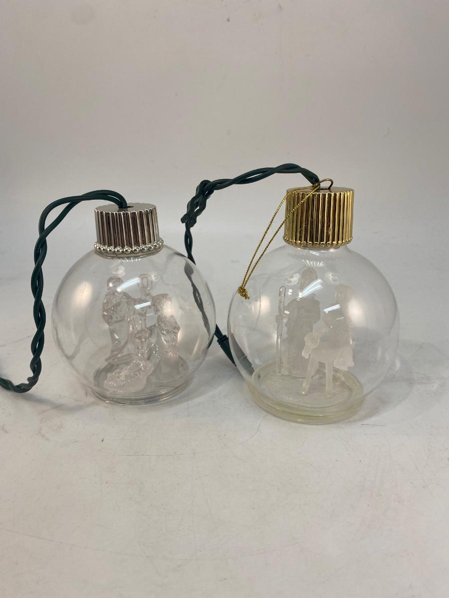 Pair of Nativity Scene Light Up Ball Christmas Tree Ornaments. Untested. Ornaments would plug into small Christmas light strand. Connectors look to be in good condition.