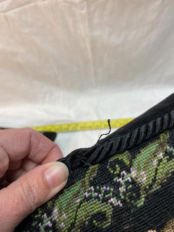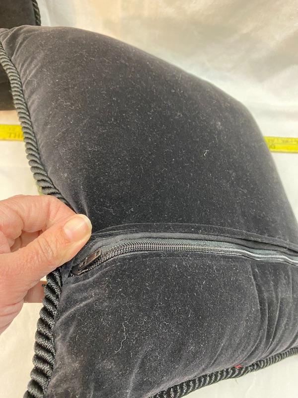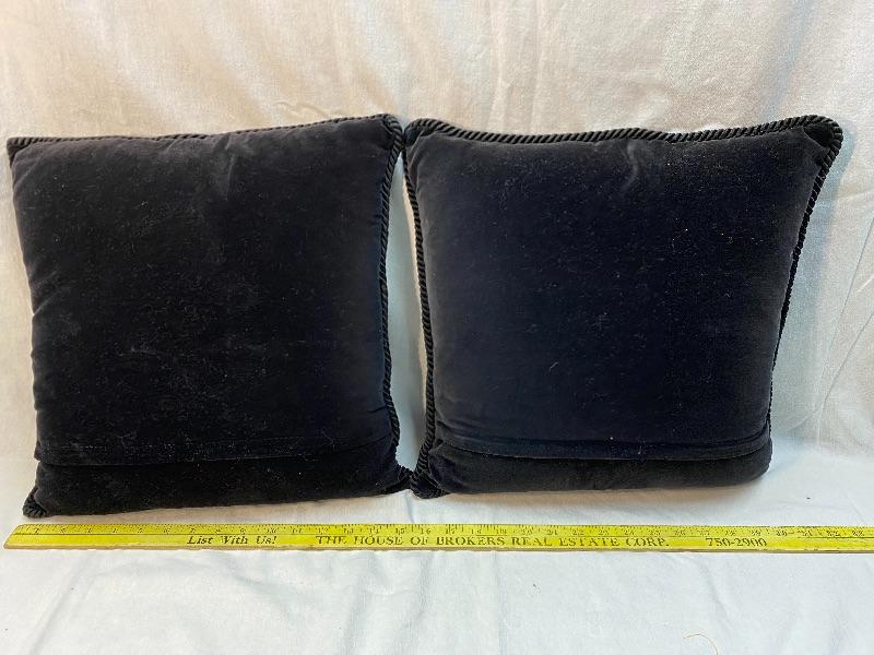 Pair of farmhouse hen & rooster throw pillows. Front pattern is completely needle point done. Back is black velvet velour like material. There is a zipper on both for easy remove and cleaning. Black twisted piping around the outside. Good condition. About 15" size.