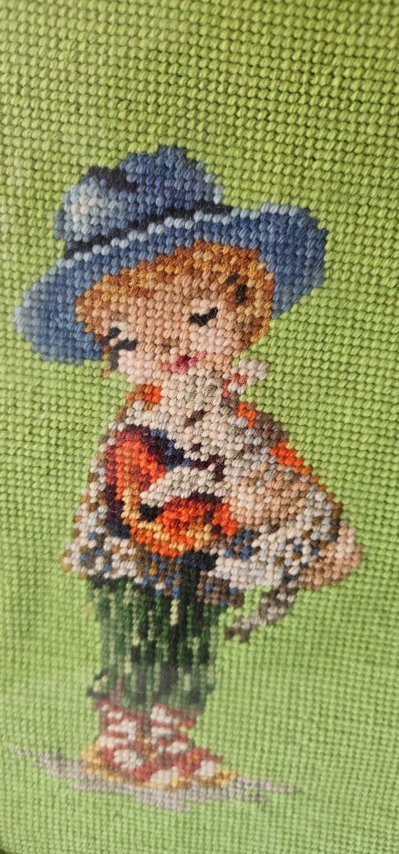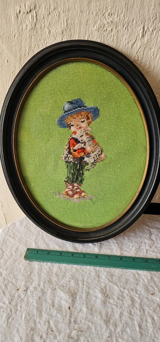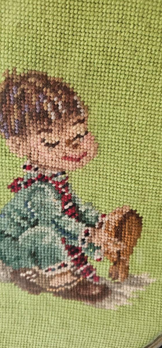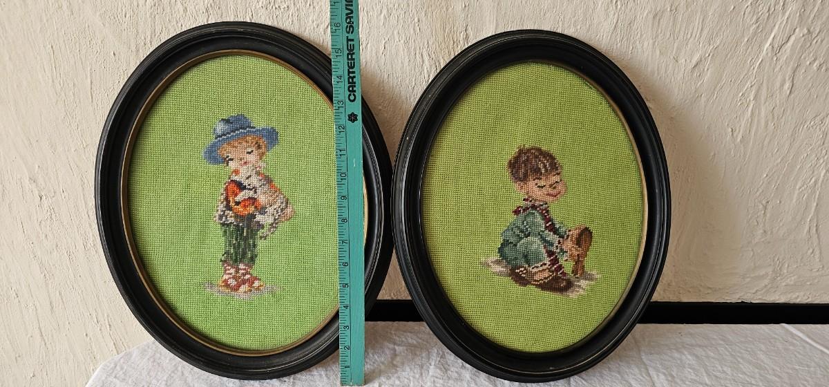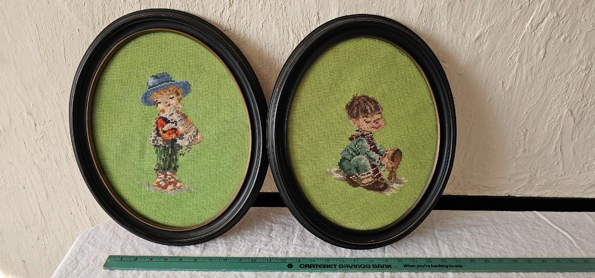 Pair of needlepoint vintage portraits of children playing with puppies 16" tall