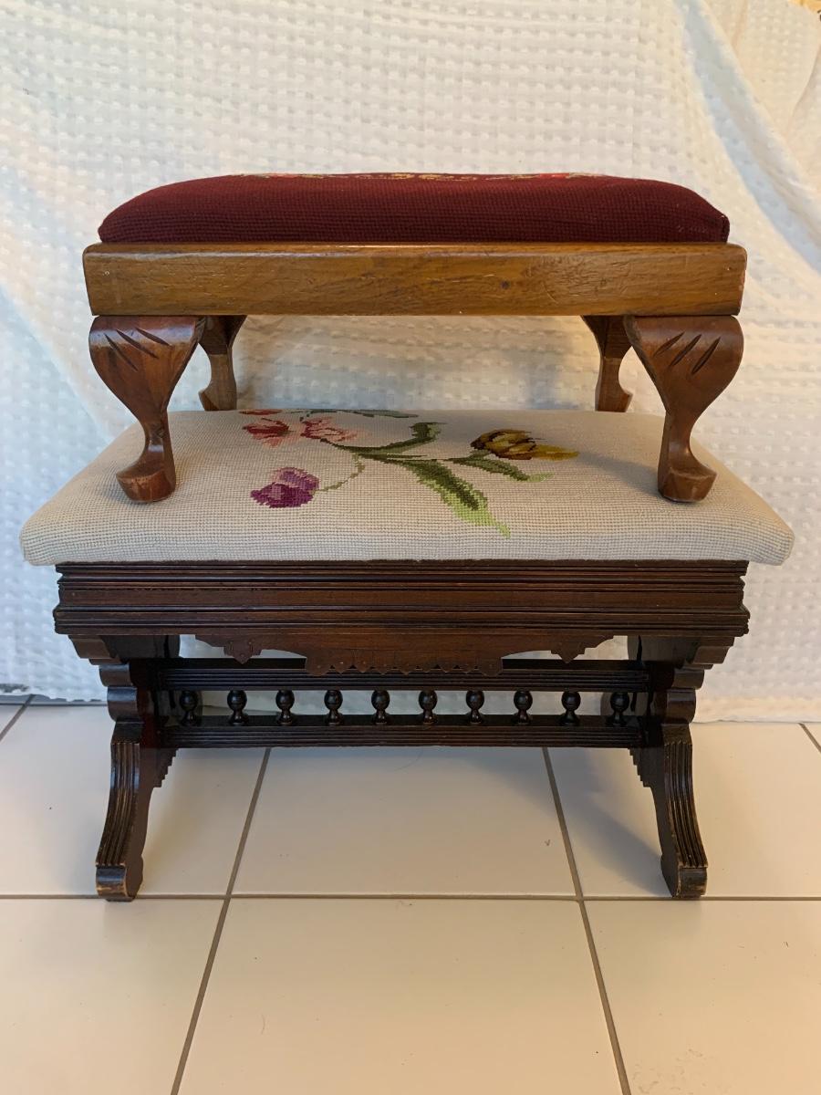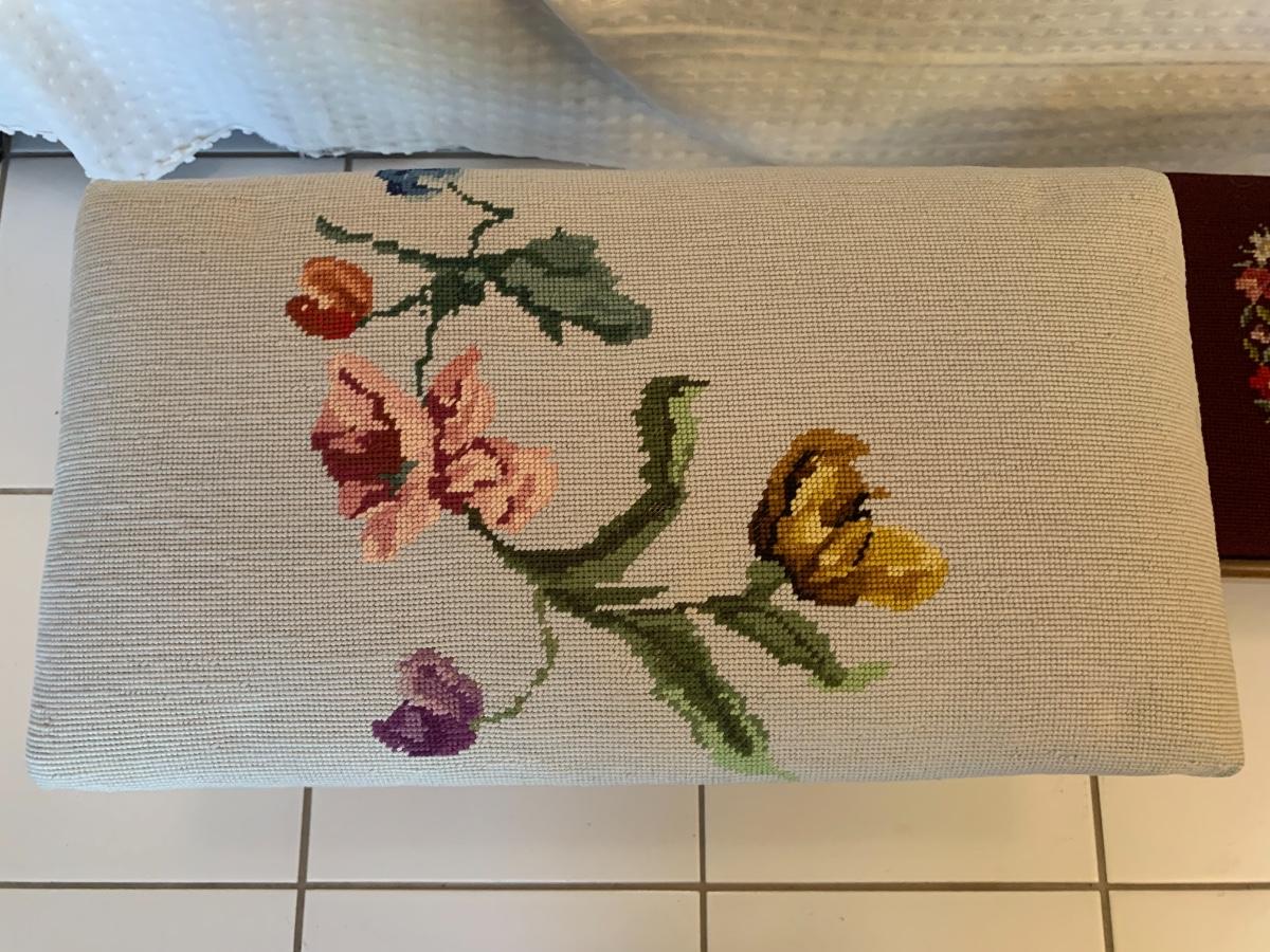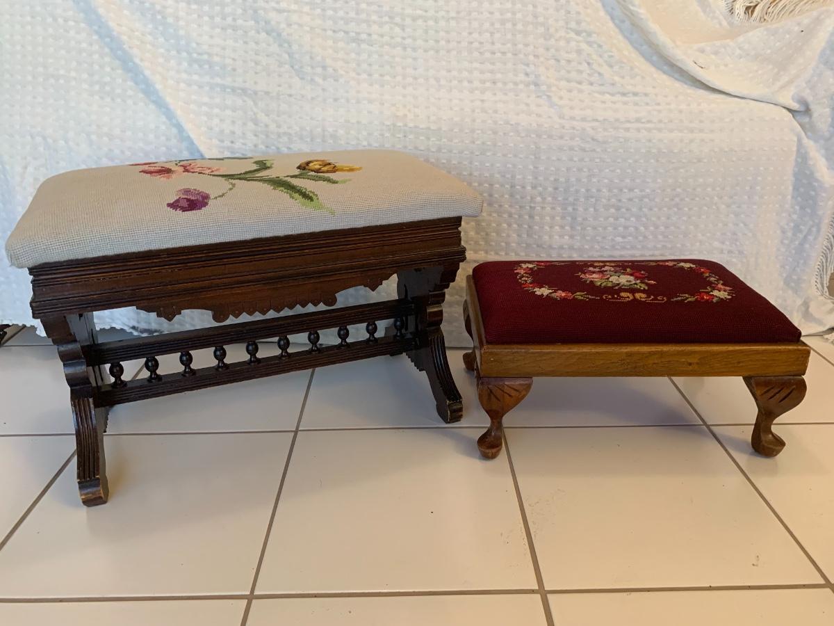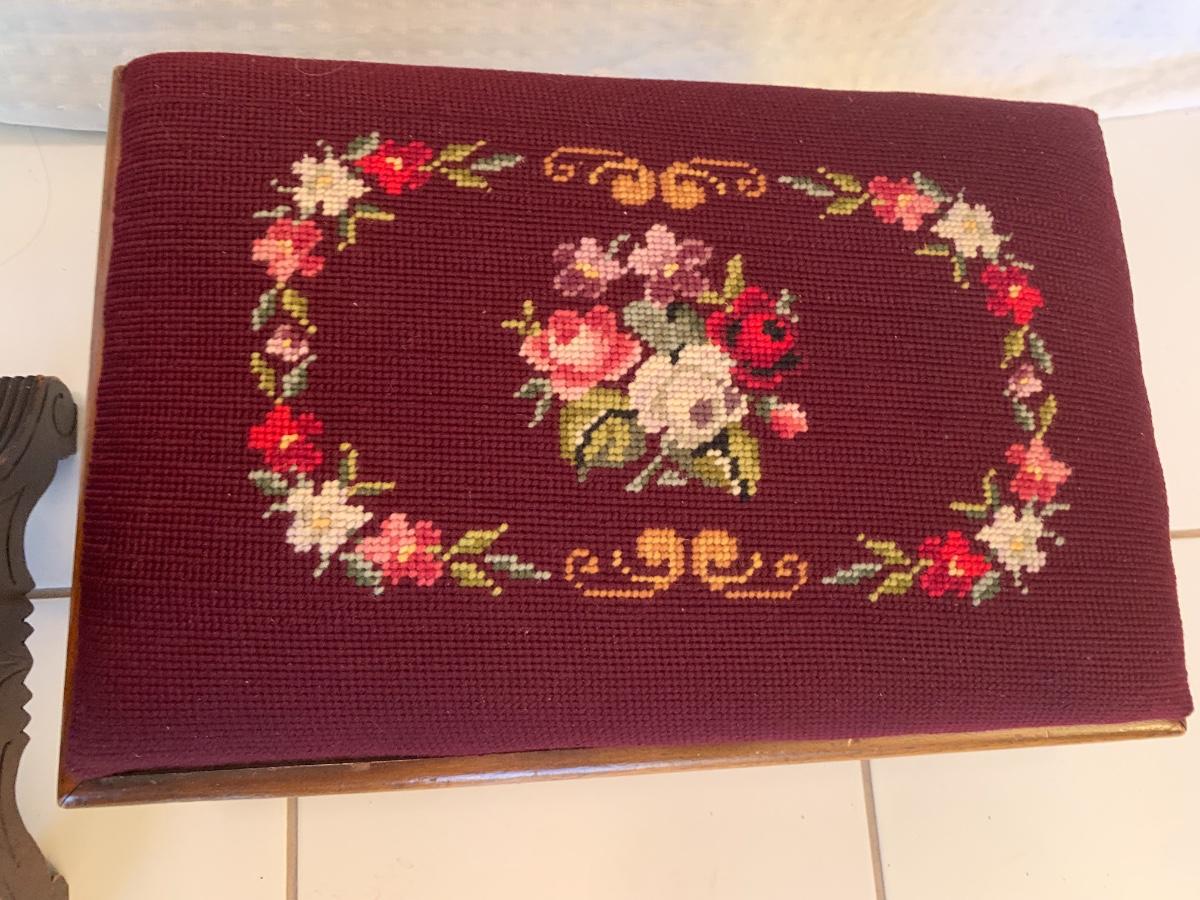 This lot includes two needlepoint stools. The first is a taller antique wood carved stool/small bench with beige floral needlepoint and top opens for storage. Second one is smaller, antique carved wood stool with maroon floral needlepoint top.