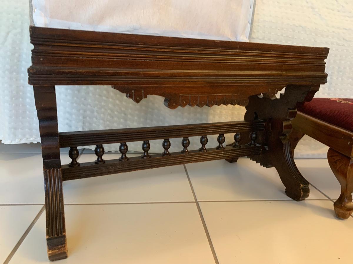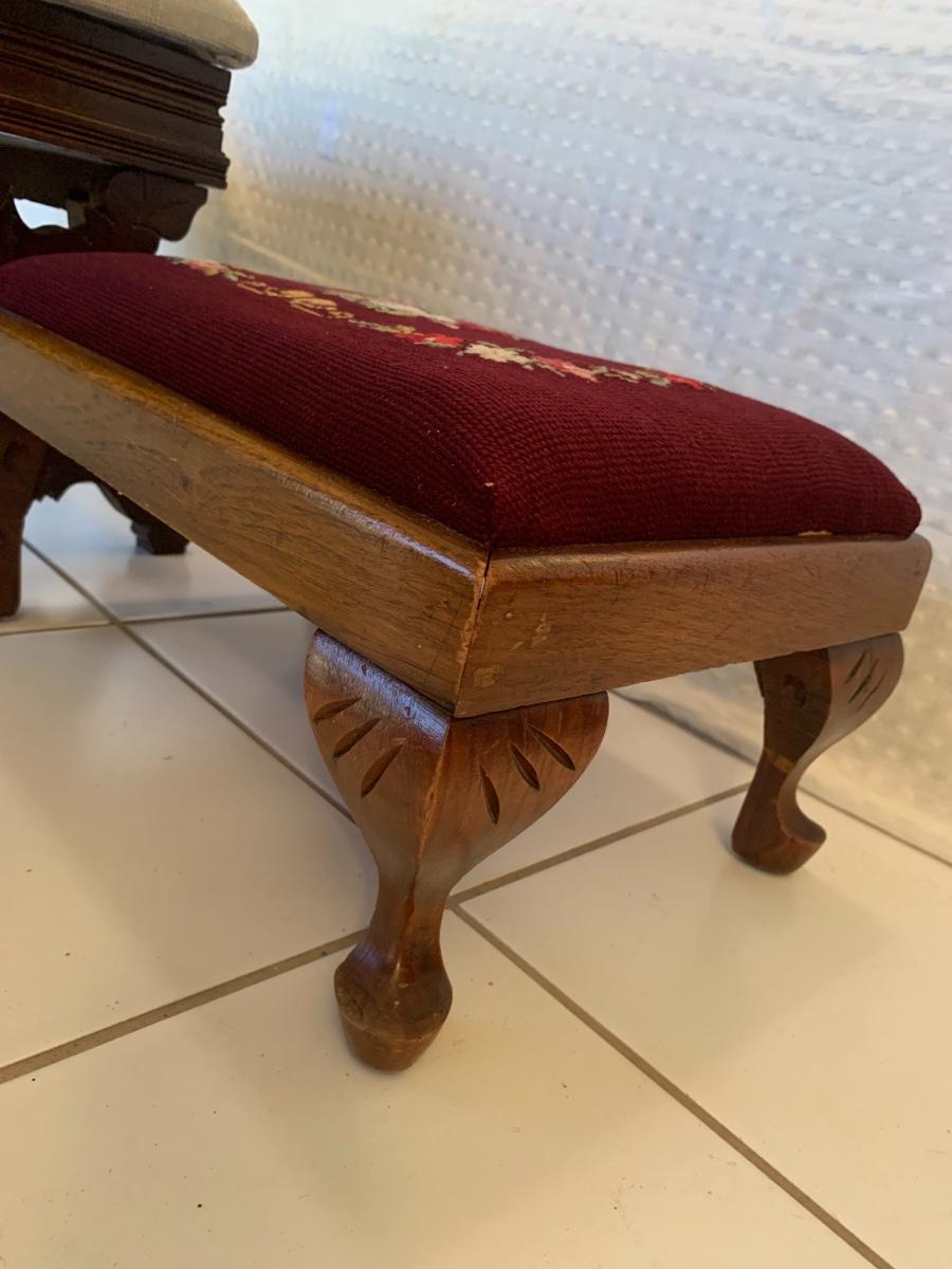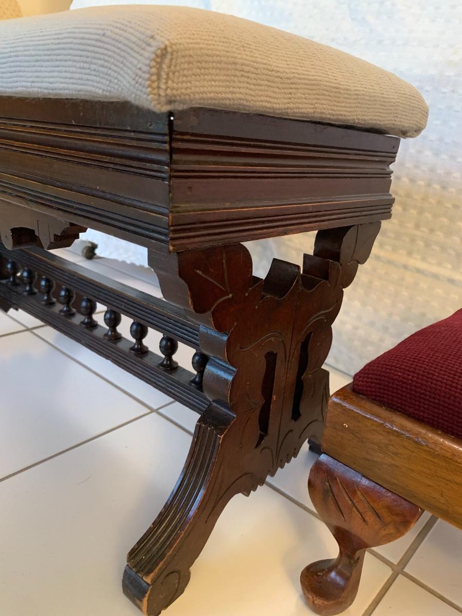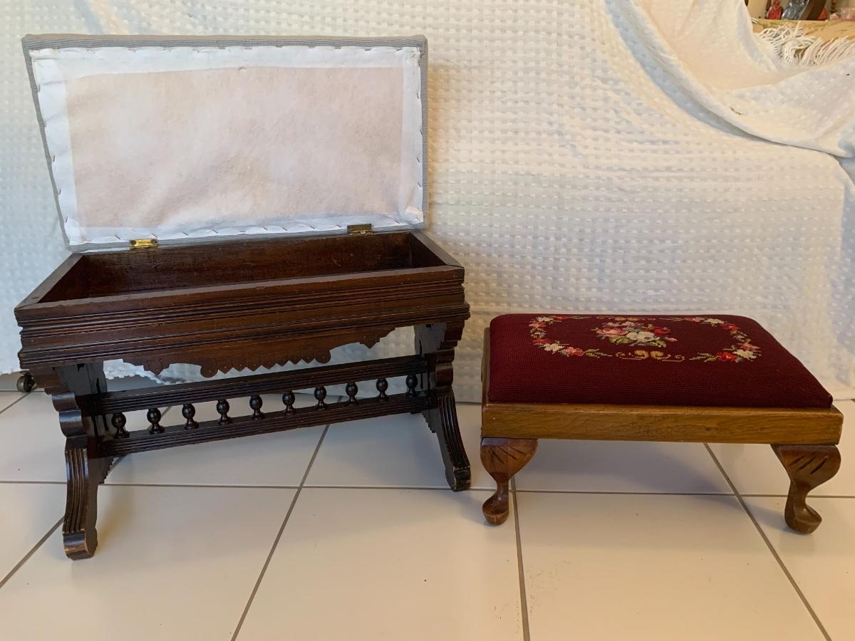 This lot includes two needlepoint stools. The first is a taller antique wood carved stool/small bench with beige floral needlepoint and top opens for storage. Second one is smaller, antique carved wood stool with maroon floral needlepoint top.