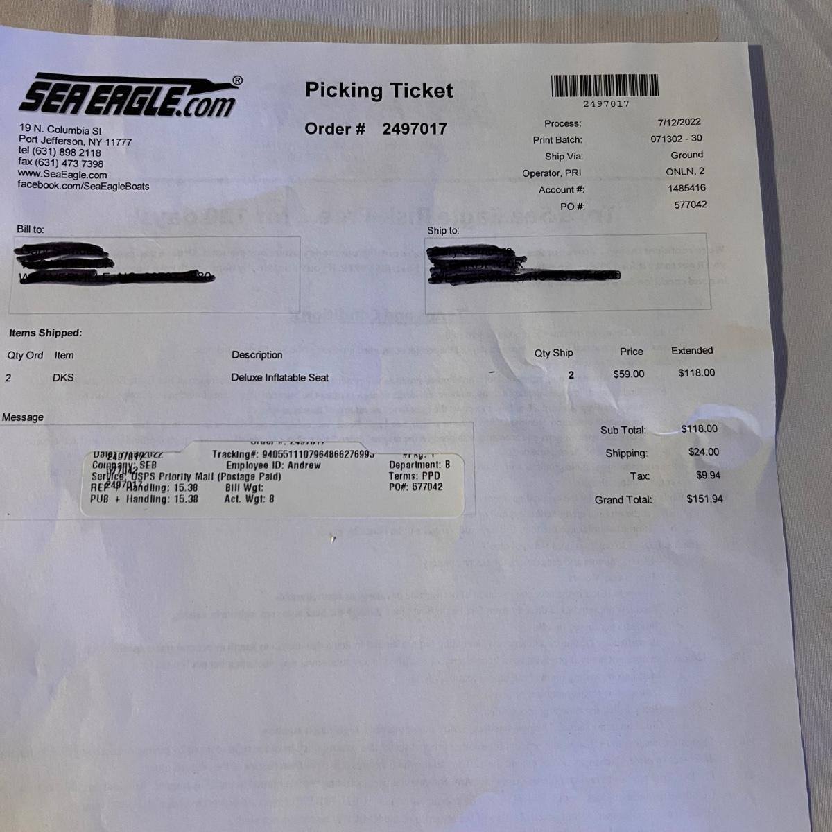 This pair of Kayak inflatable seats are new in packaging. Stock photo and measurements were taken from seaeagle.com website. We cannot make any guarantees on condition or that they are exact replicas of stock photo as they might be older versions, but they are sealed in plastic.