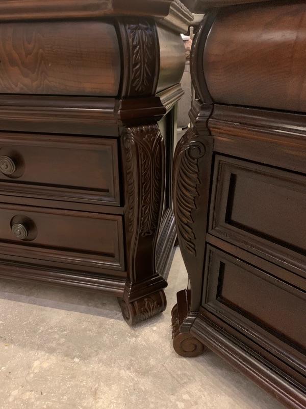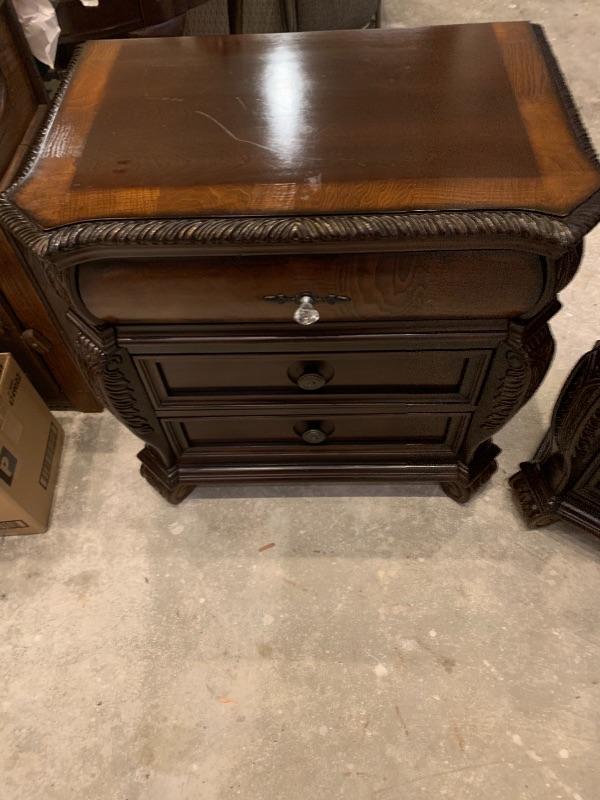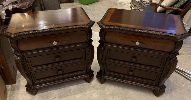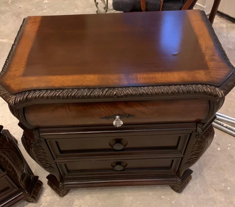 Solid Pair of Night Stands with some surface scratches noted, Nice looking and heavy. Top drawers are felt lined. Top pull is crystal like for a nice look.