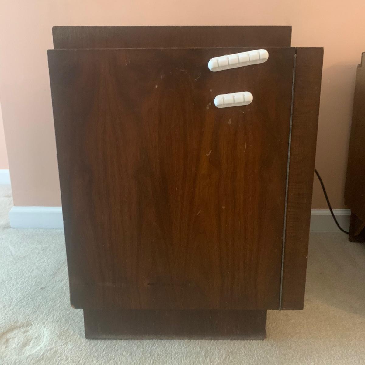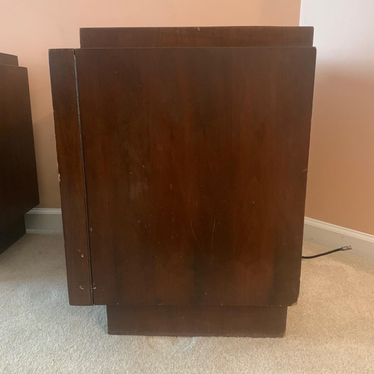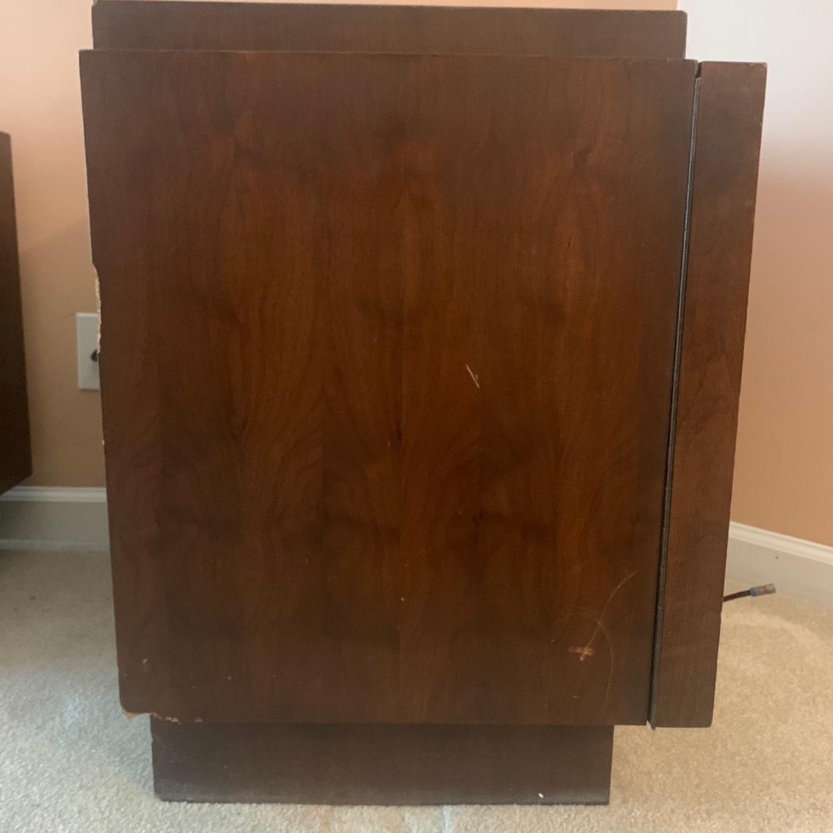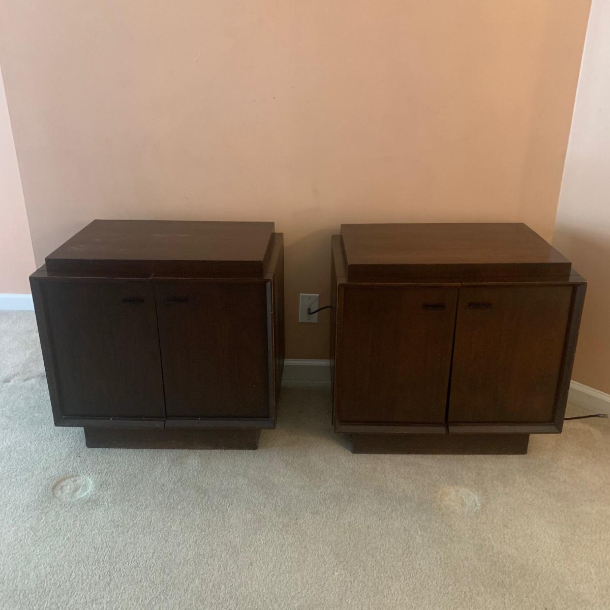 Two matching wood nightstands measuring 26” x 17.5” x 25”H each. Items show multiple blemishes, see photos. These pieces could easily be stained and refinished. Please note that one of the nightstands has two white cord organizers attached to it. Please see photos for more details. Local pick-up only.
