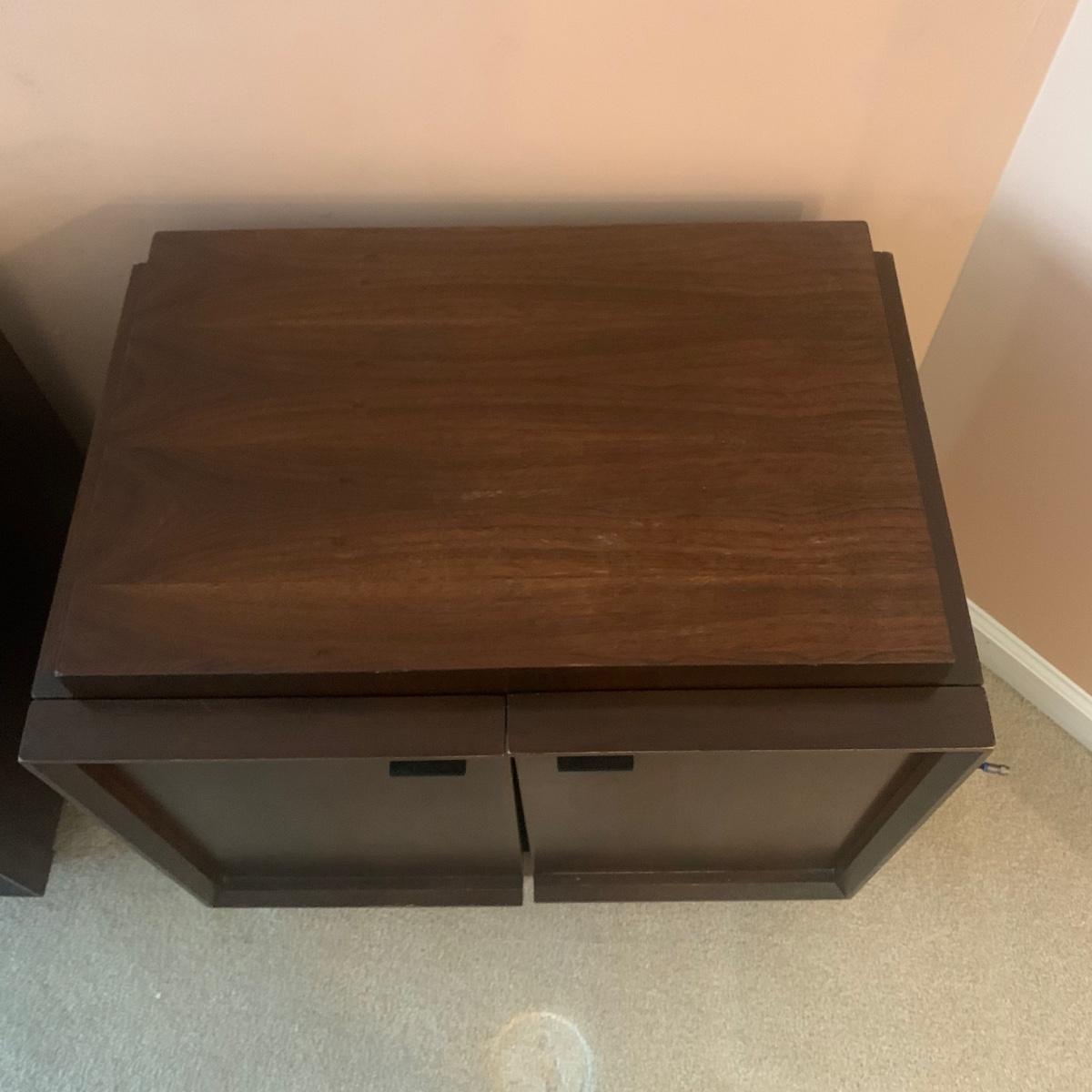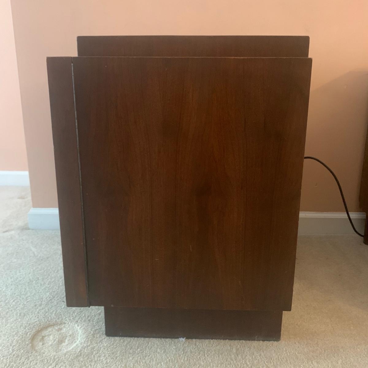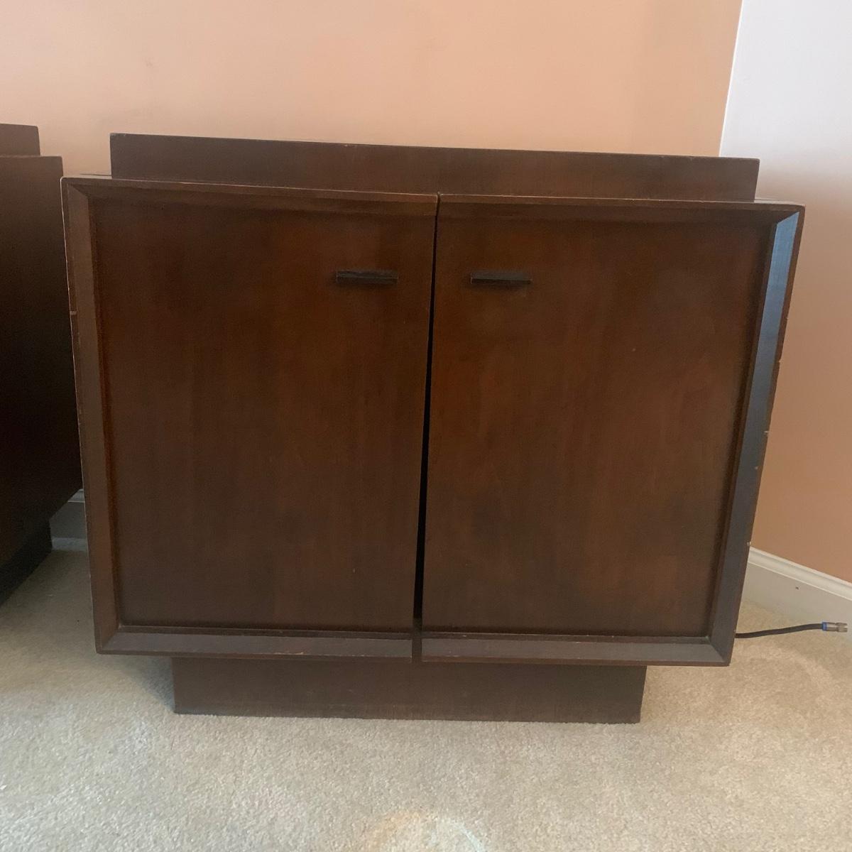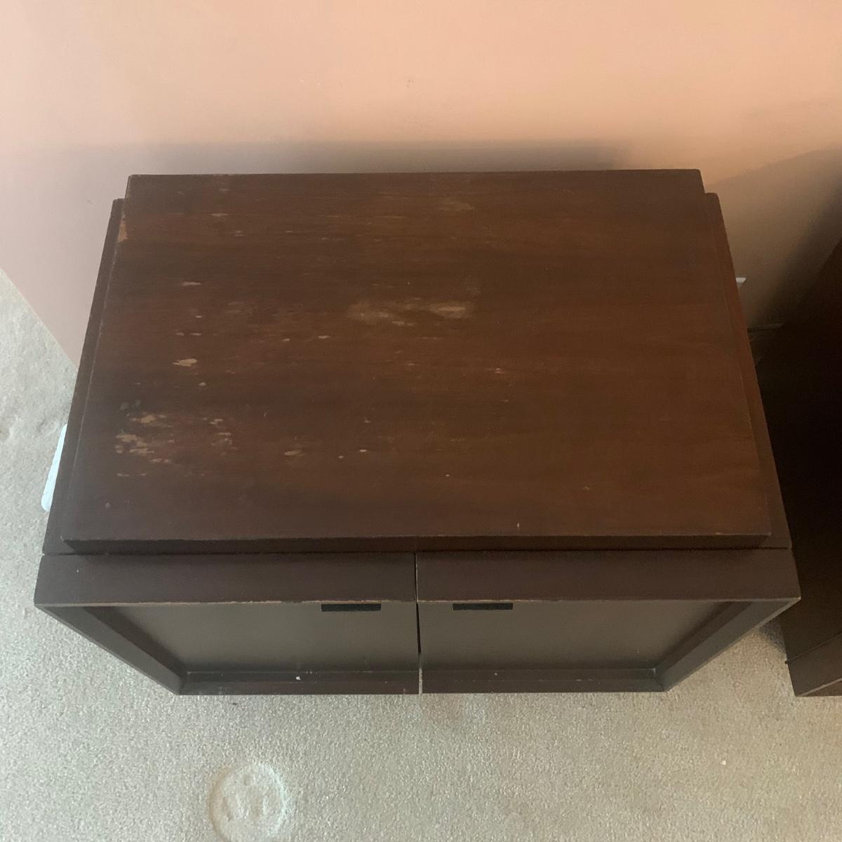 Two matching wood nightstands measuring 26” x 17.5” x 25”H each. Items show multiple blemishes, see photos. These pieces could easily be stained and refinished. Please note that one of the nightstands has two white cord organizers attached to it. Please see photos for more details. Local pick-up only.