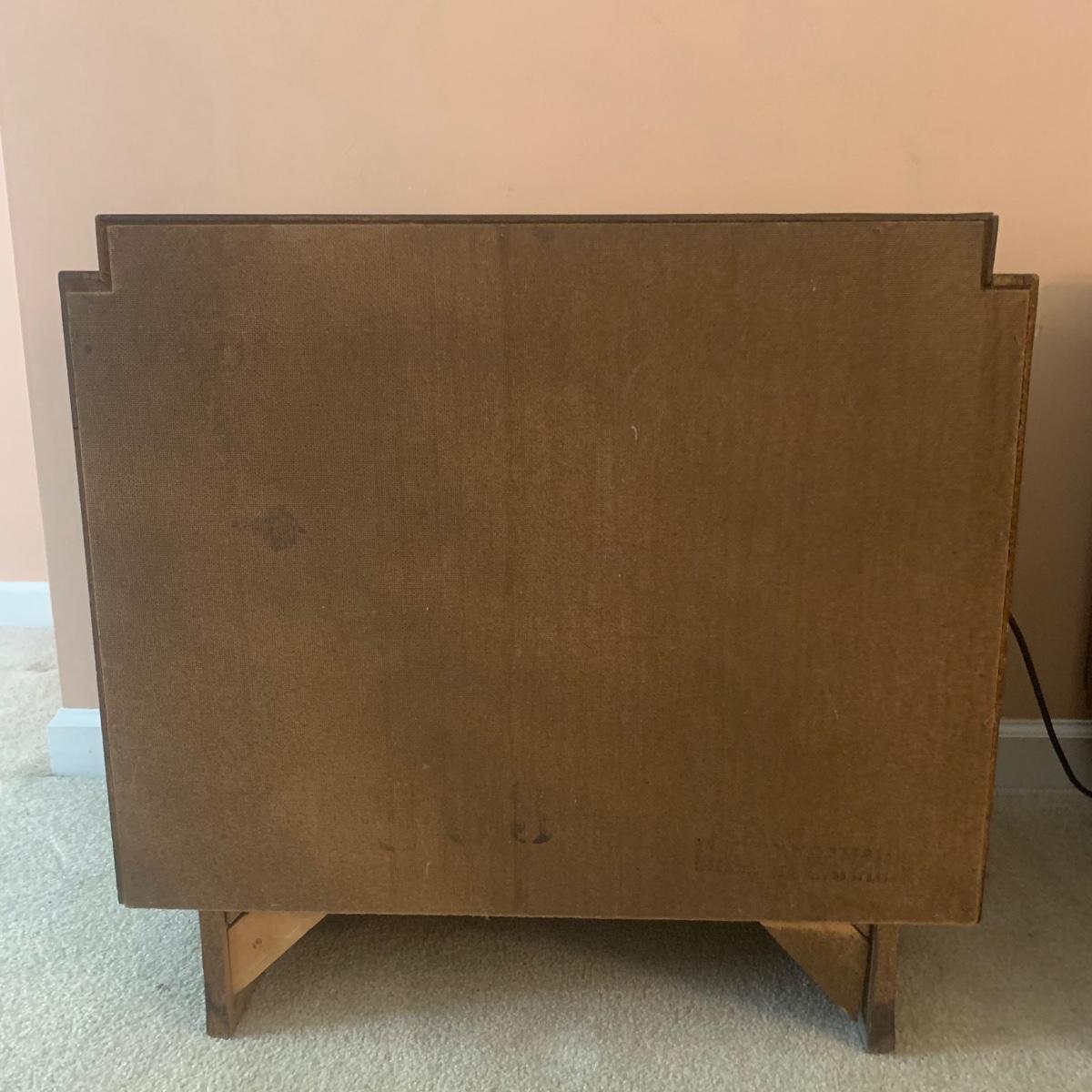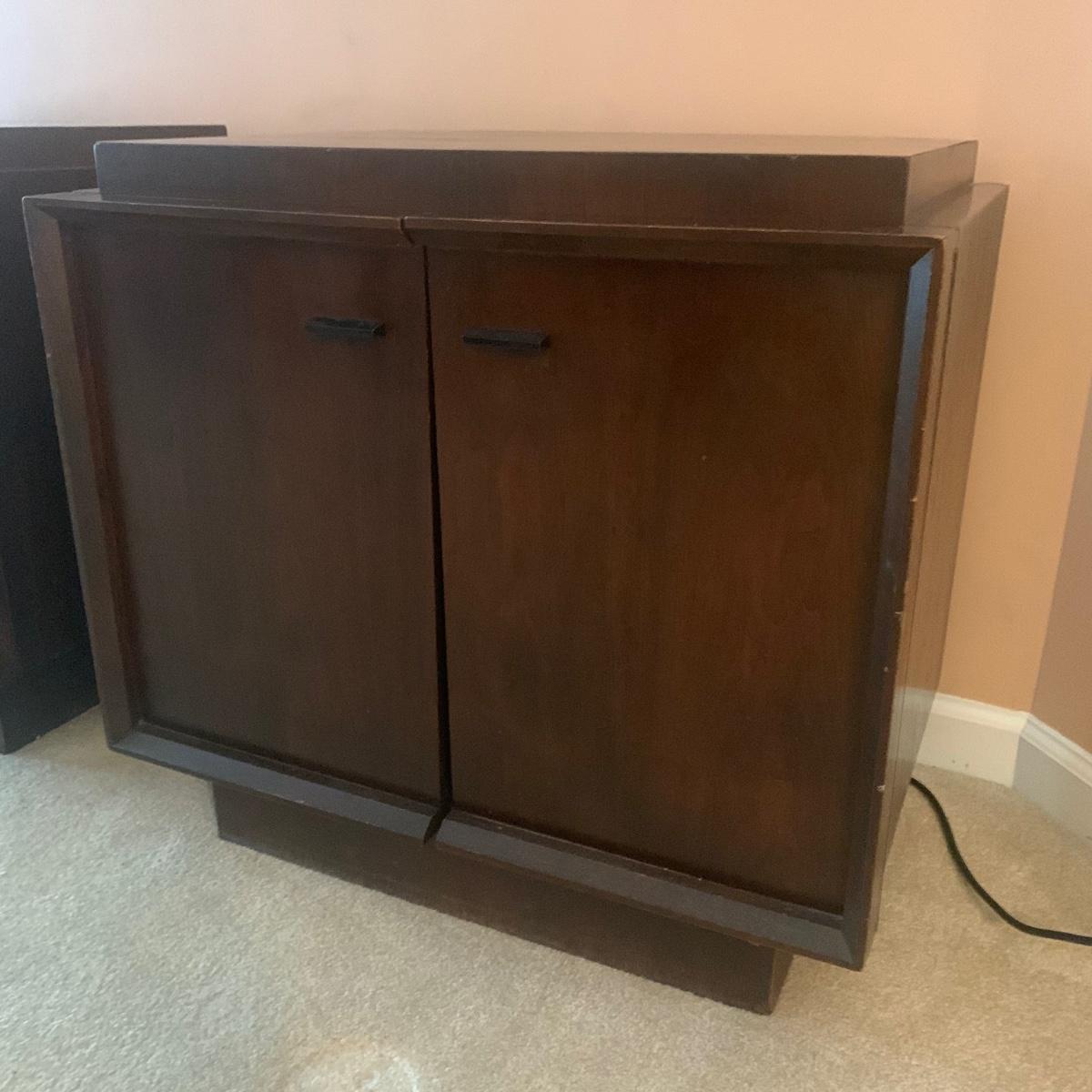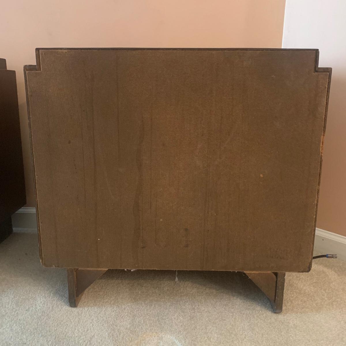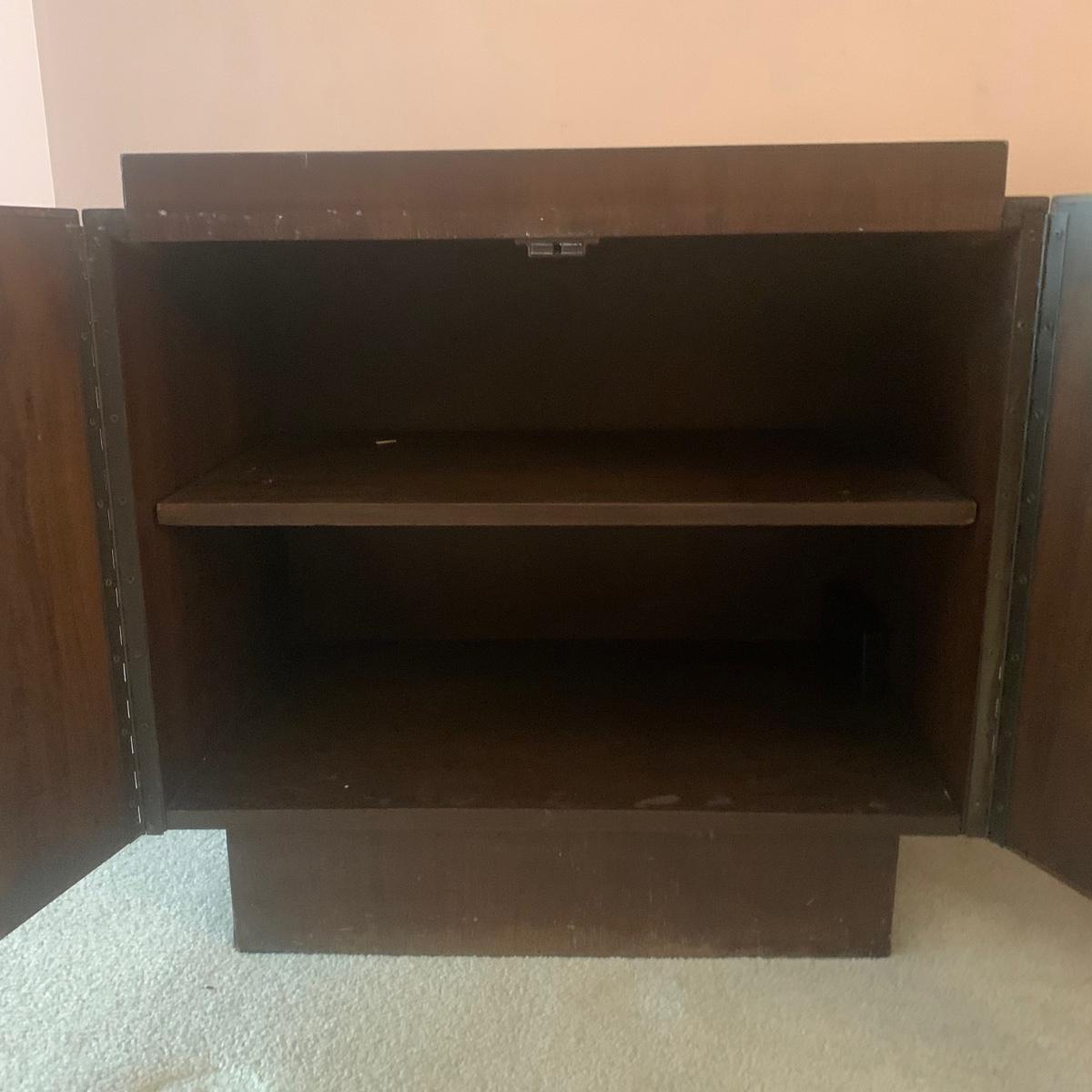 Two matching wood nightstands measuring 26” x 17.5” x 25”H each. Items show multiple blemishes, see photos. These pieces could easily be stained and refinished. Please note that one of the nightstands has two white cord organizers attached to it. Please see photos for more details. Local pick-up only.