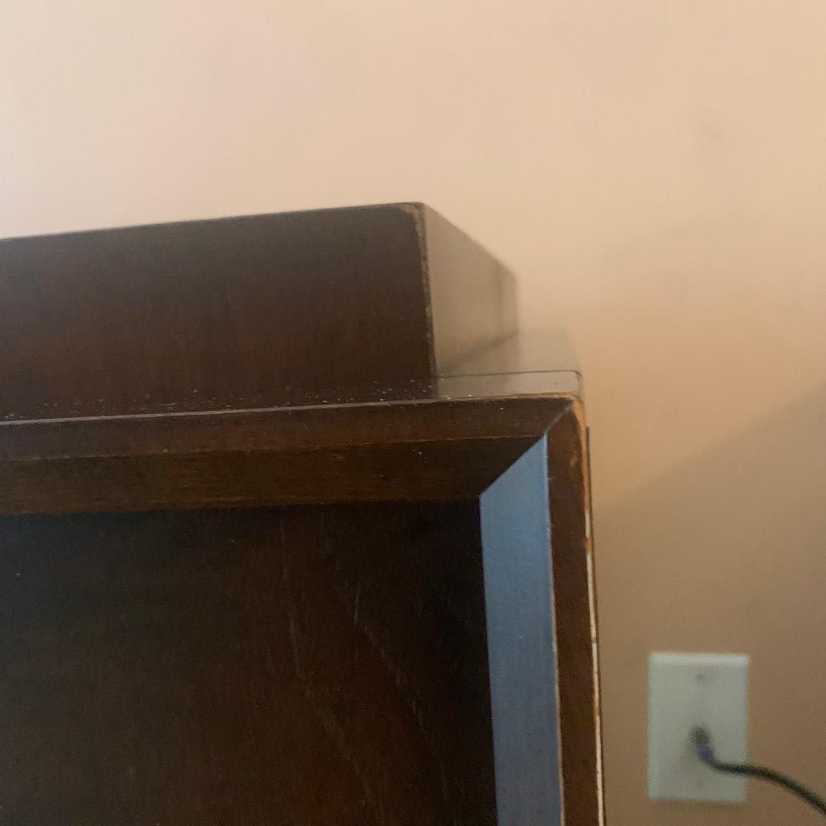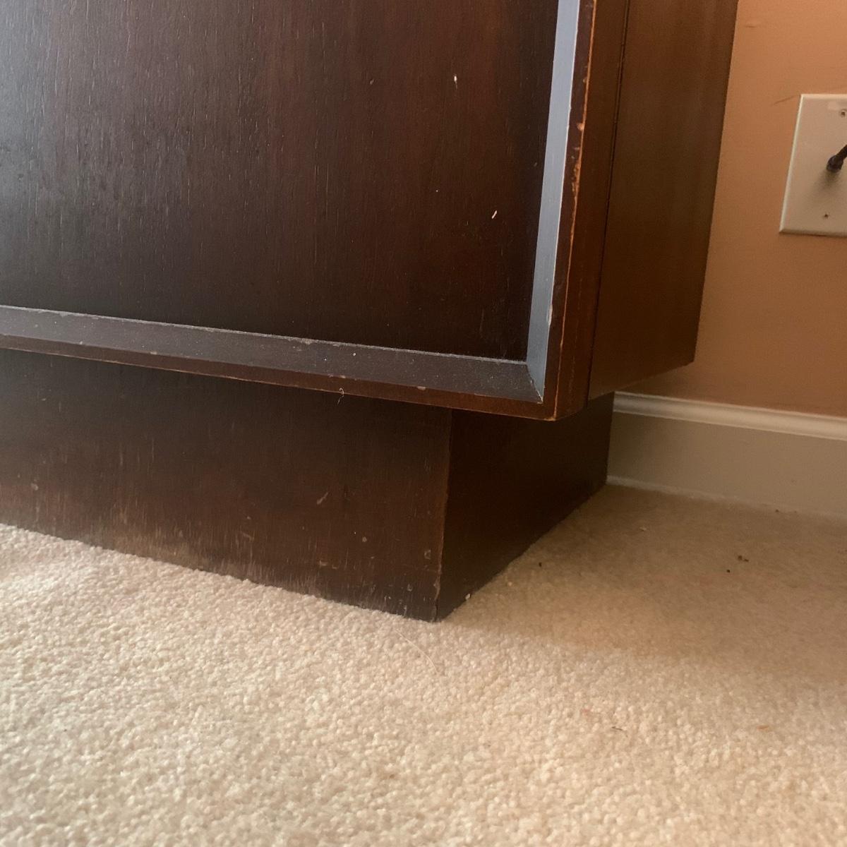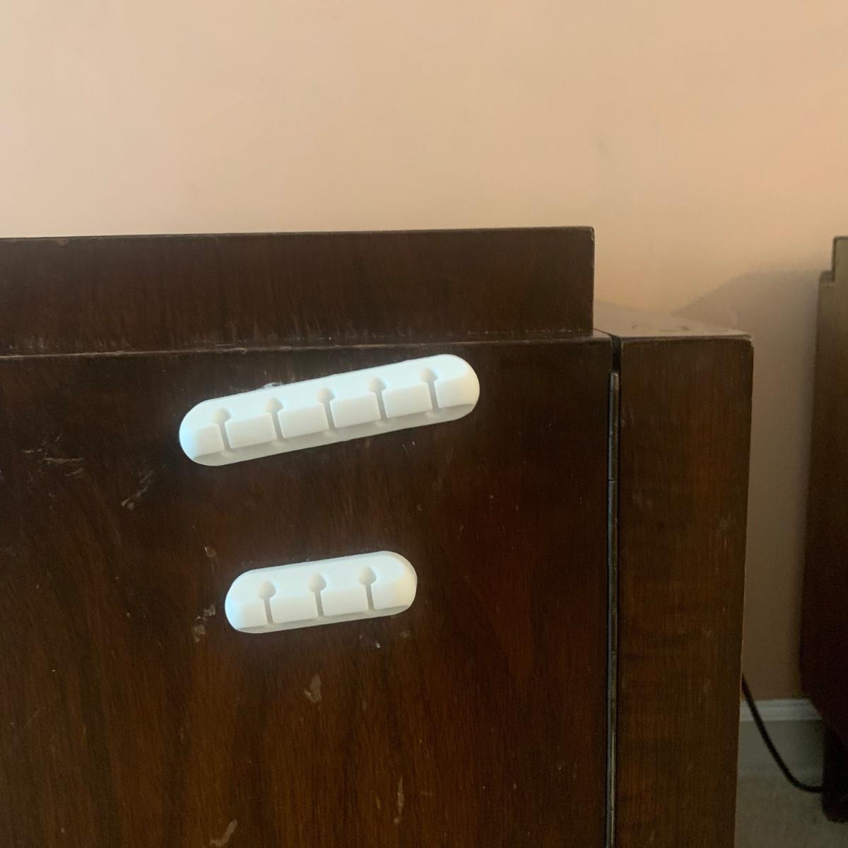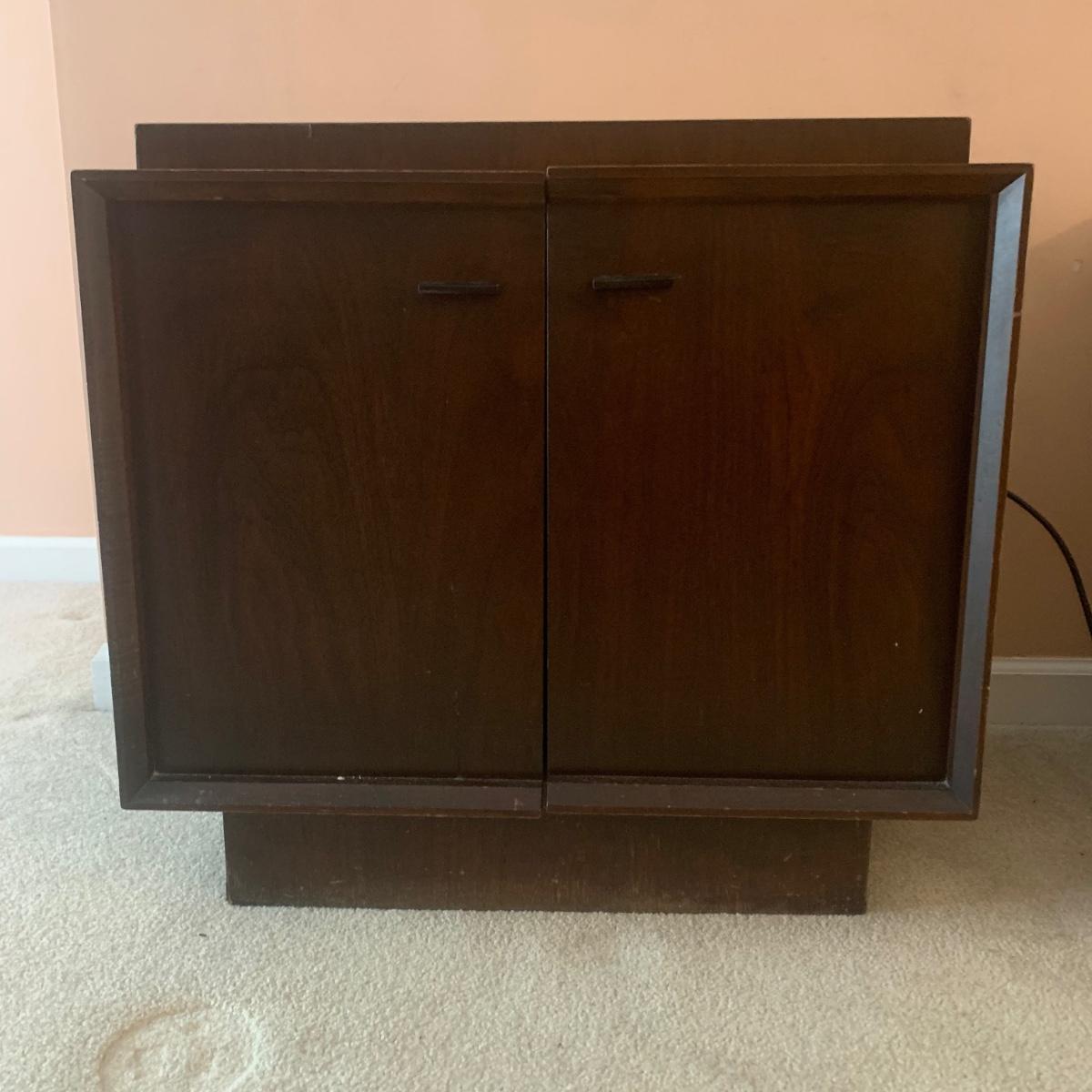 Two matching wood nightstands measuring 26” x 17.5” x 25”H each. Items show multiple blemishes, see photos. These pieces could easily be stained and refinished. Please note that one of the nightstands has two white cord organizers attached to it. Please see photos for more details. Local pick-up only.
