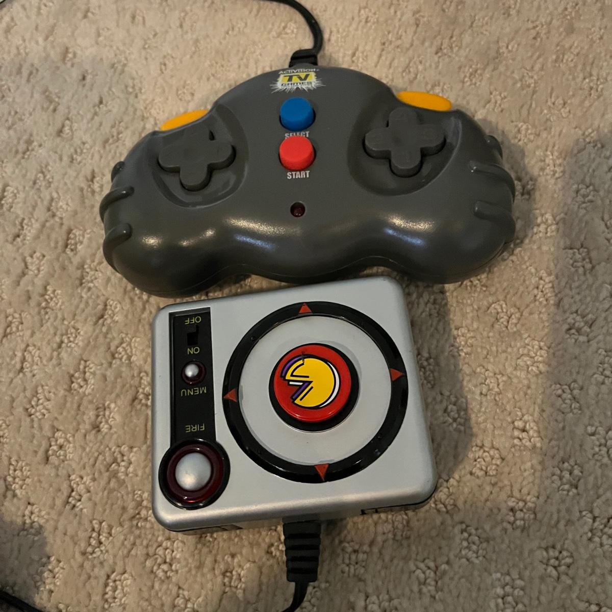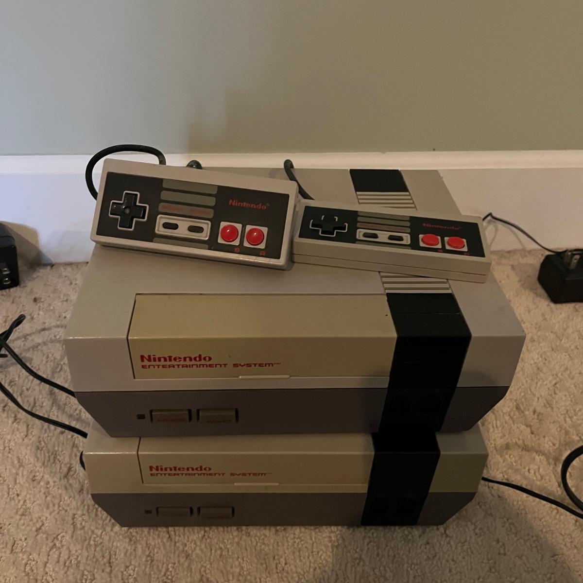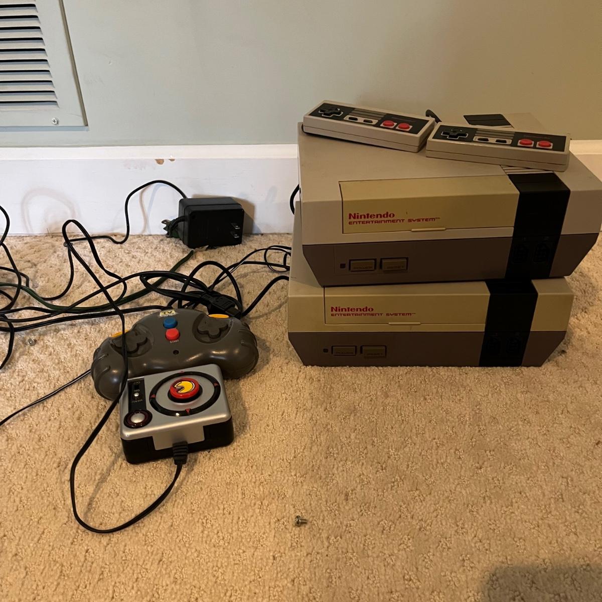 Lot includes two Nintendo Entertainment Systems model # NES001 with two controllers. Also includes Activision and PAC Man game controllers. Both Nintendos powered on when tested and the PAC Man and Activision controller could not be tested as they need to connect to TV.