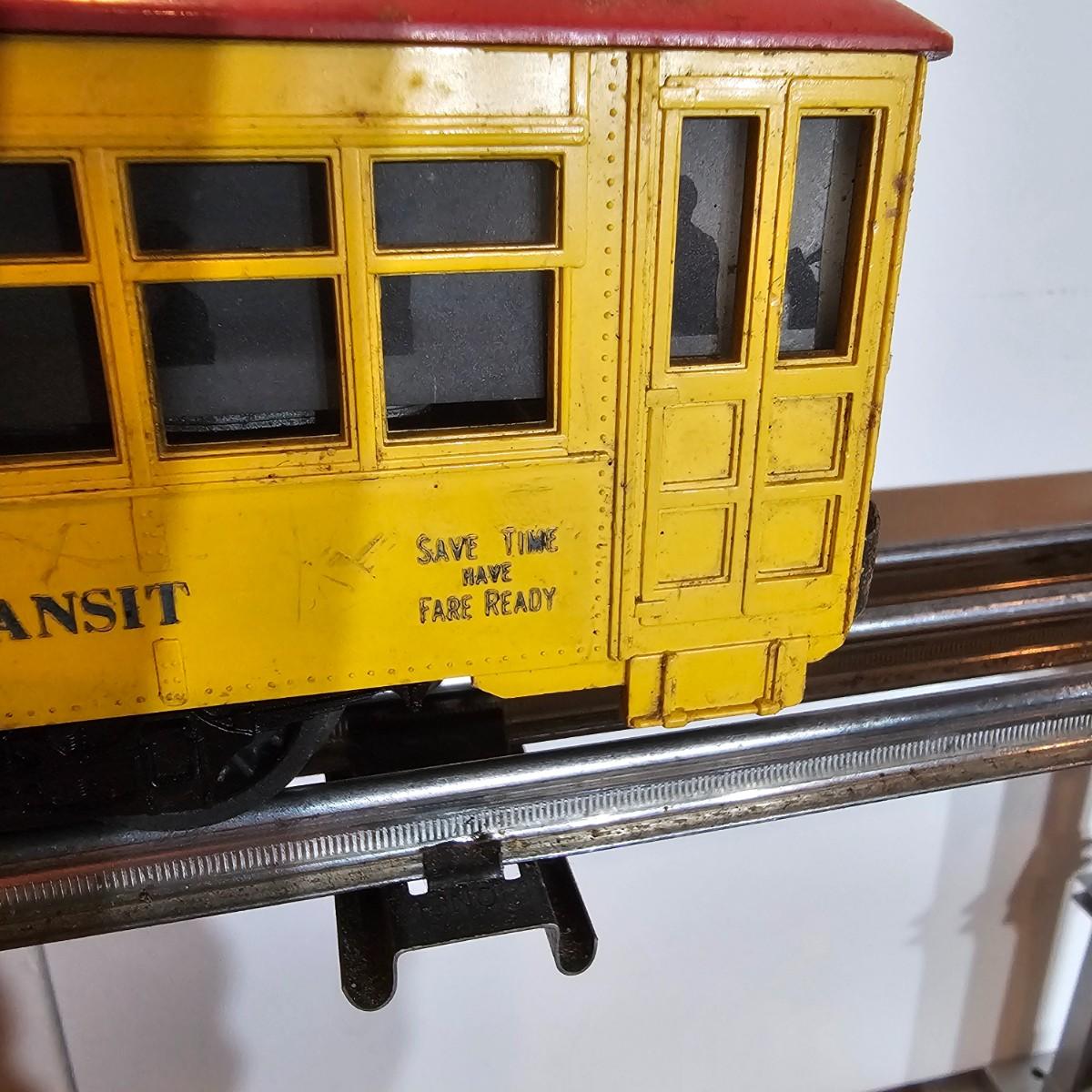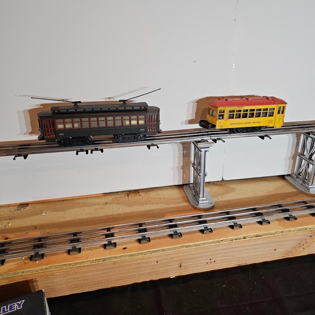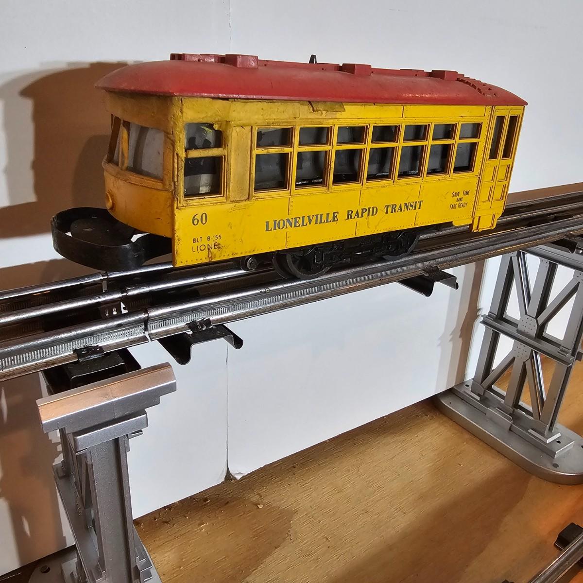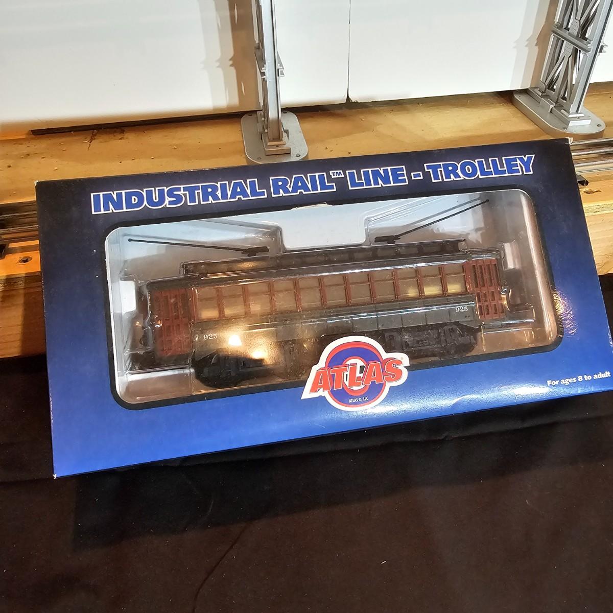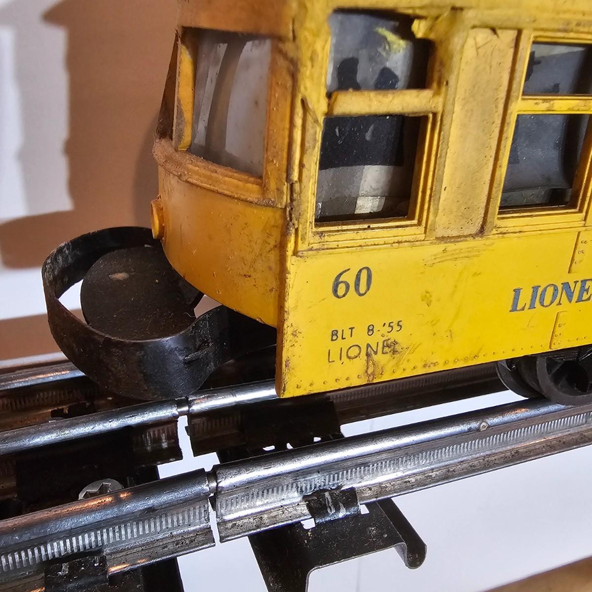 One old one, one newer one. The yellow and red Lionelville Rapid Transit #60 unit is from the late 1950's in original, has plastic body and roof, tin bumpers and four wheels. It measures 7.5" x 2" x 3"H, may be missing some pieces. Unit started and ran on layout but growls a bit, has interior lighting as well as silhouettes of passengers in windows. No boxes. Other item is an Atlas industrial rail two truck trolley with catenary poles. 9.5" x 2" x 4"H, with original box. Unit started and ran on layout, has interior lights. See photos for details. Shipping available. Please note that any price tag seen on an item was not put there by Sterling Transitions and does not reflect the current value of the item. Any train tracks shown in photos are not included but are available in another lot in this sale.
