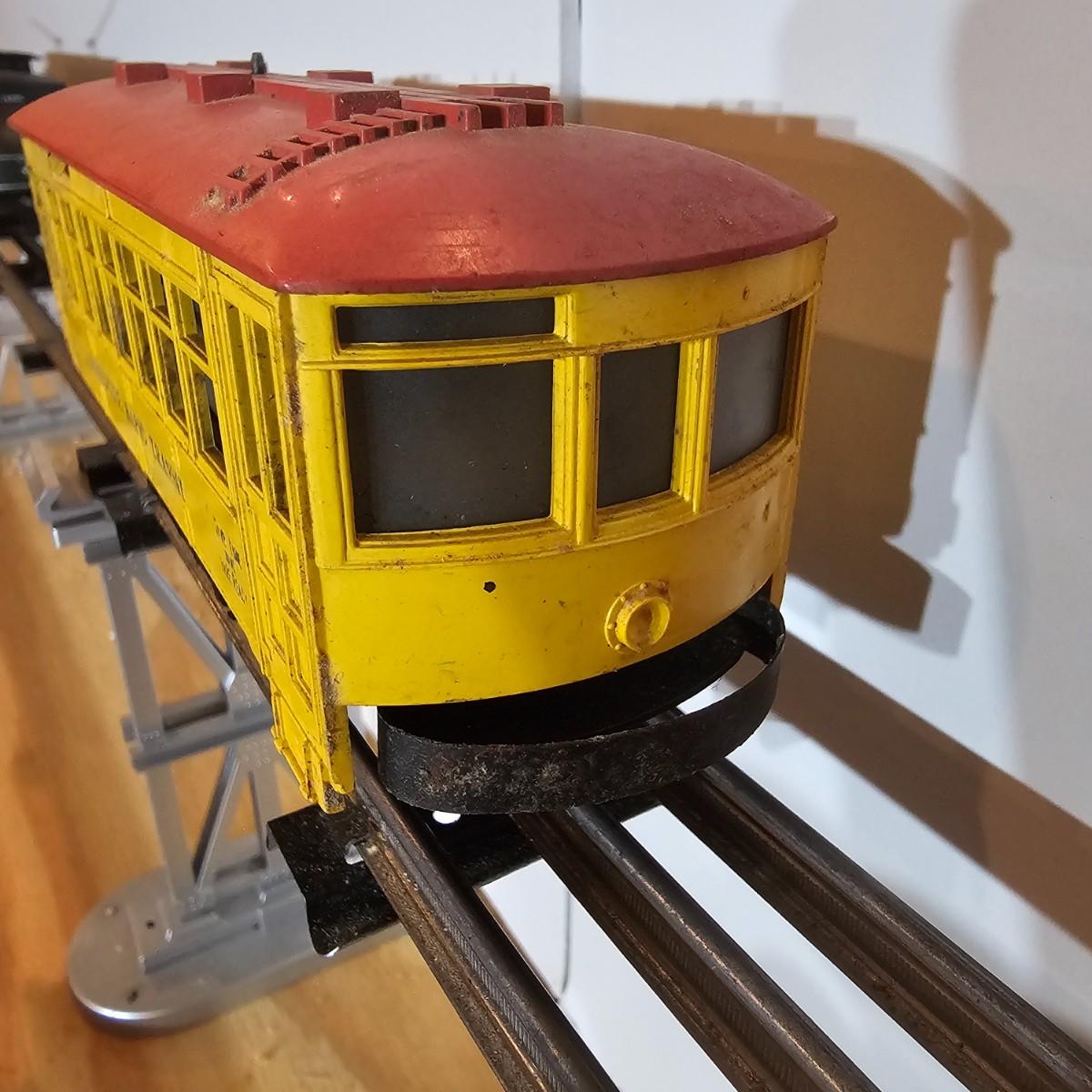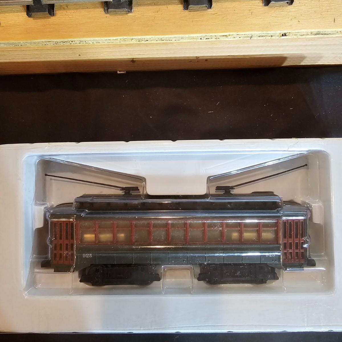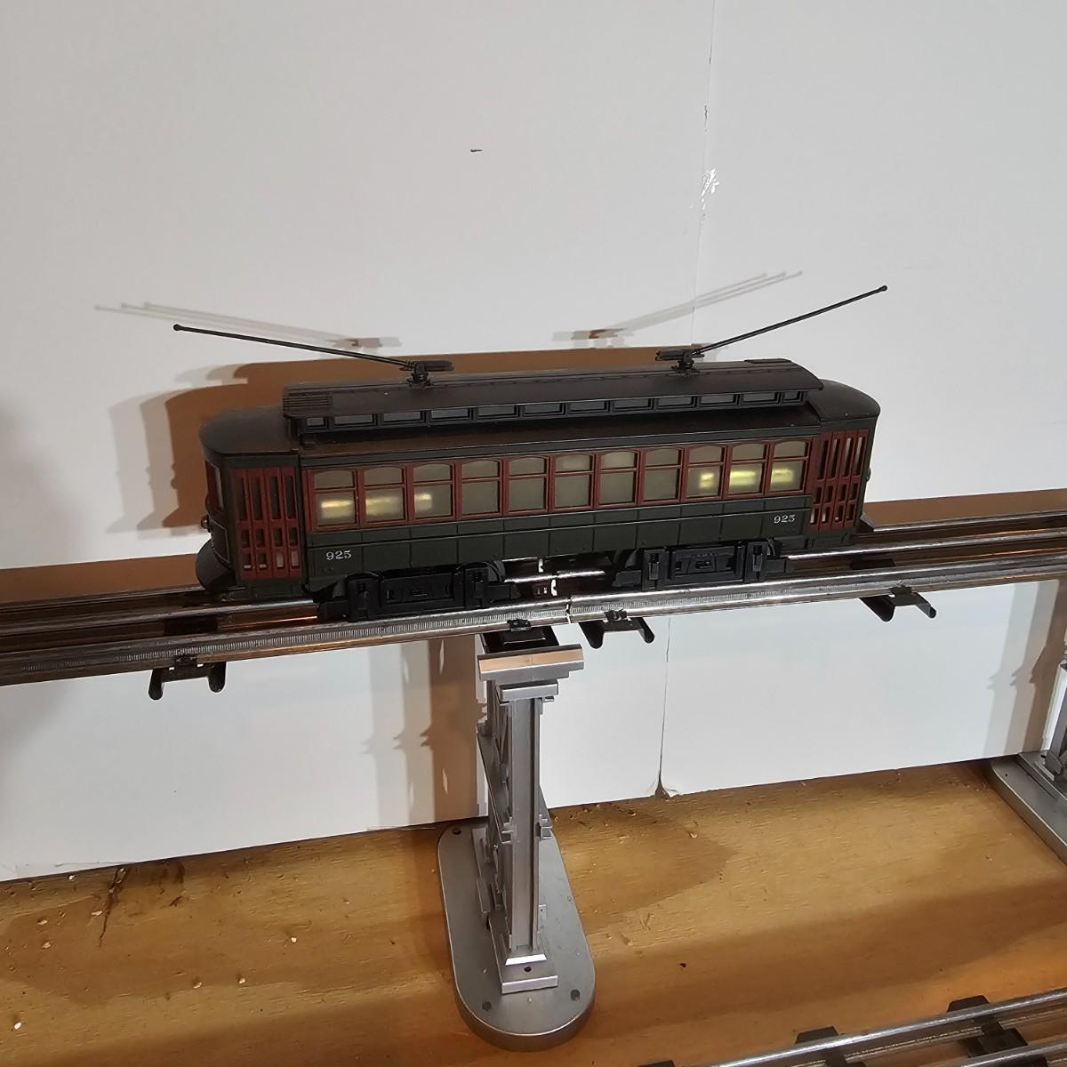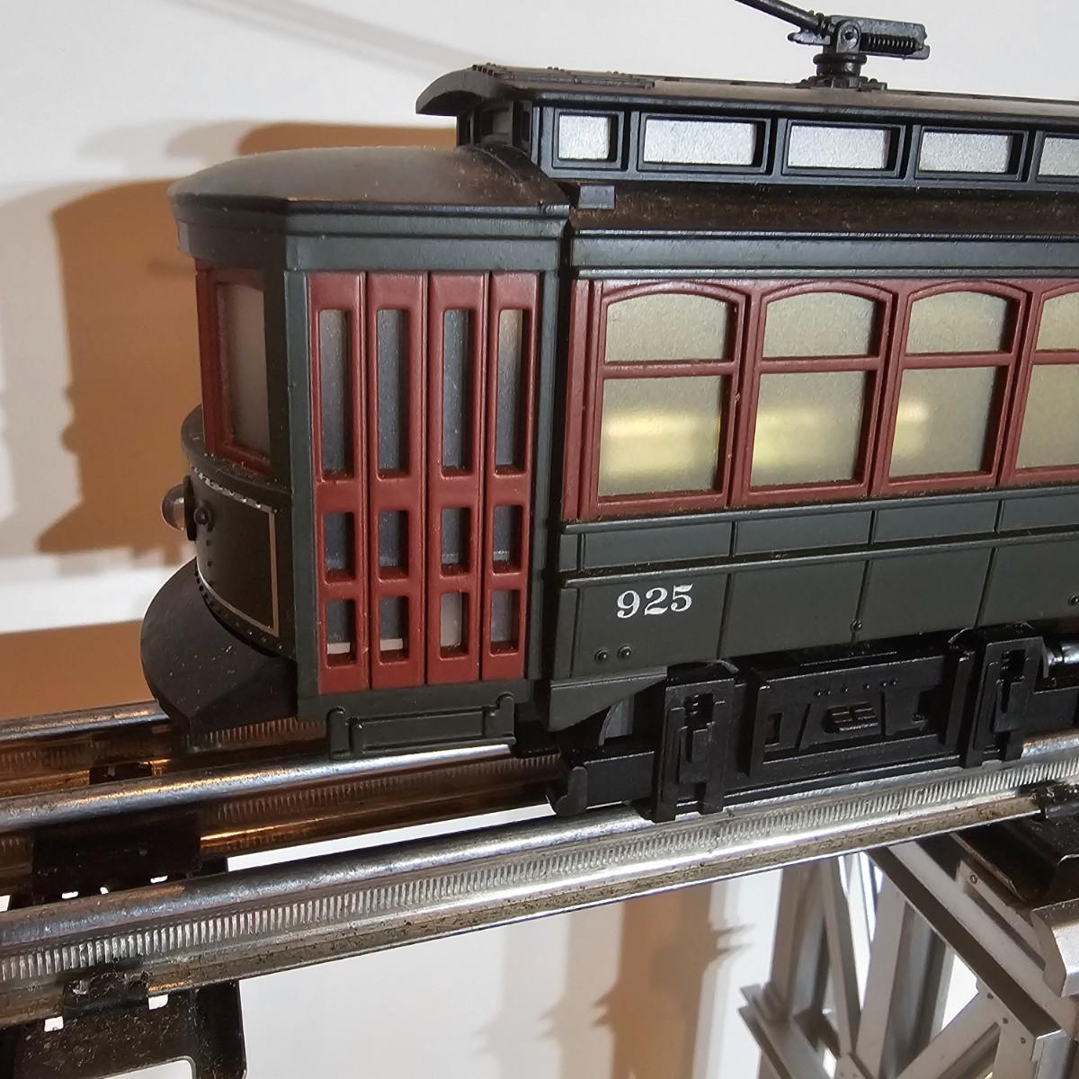 One old one, one newer one. The yellow and red Lionelville Rapid Transit #60 unit is from the late 1950's in original, has plastic body and roof, tin bumpers and four wheels. It measures 7.5" x 2" x 3"H, may be missing some pieces. Unit started and ran on layout but growls a bit, has interior lighting as well as silhouettes of passengers in windows. No boxes. Other item is an Atlas industrial rail two truck trolley with catenary poles. 9.5" x 2" x 4"H, with original box. Unit started and ran on layout, has interior lights. See photos for details. Shipping available. Please note that any price tag seen on an item was not put there by Sterling Transitions and does not reflect the current value of the item. Any train tracks shown in photos are not included but are available in another lot in this sale.