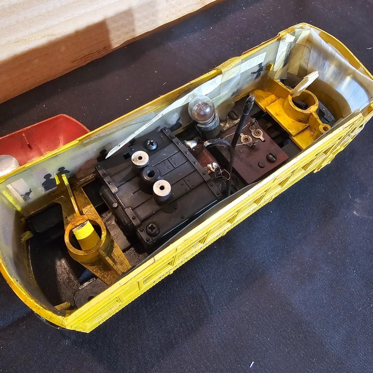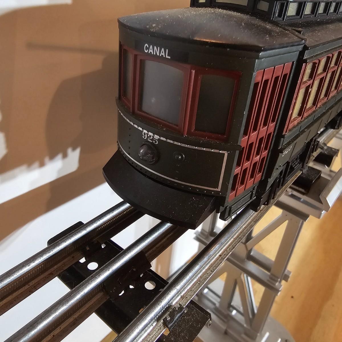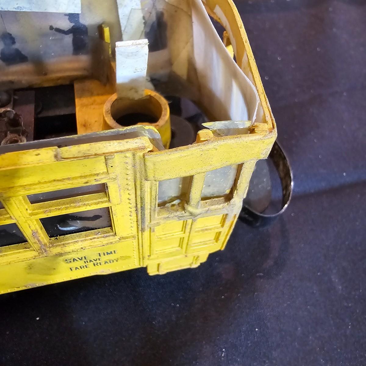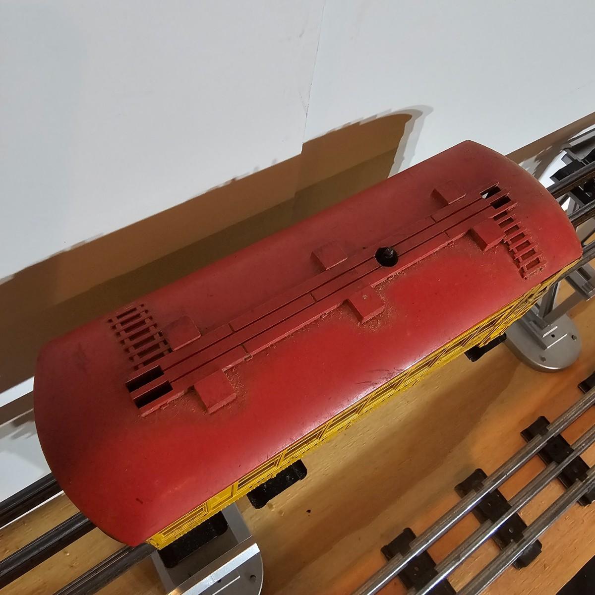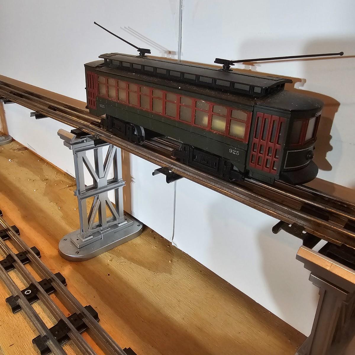 One old one, one newer one. The yellow and red Lionelville Rapid Transit #60 unit is from the late 1950's in original, has plastic body and roof, tin bumpers and four wheels. It measures 7.5" x 2" x 3"H, may be missing some pieces. Unit started and ran on layout but growls a bit, has interior lighting as well as silhouettes of passengers in windows. No boxes. Other item is an Atlas industrial rail two truck trolley with catenary poles. 9.5" x 2" x 4"H, with original box. Unit started and ran on layout, has interior lights. See photos for details. Shipping available. Please note that any price tag seen on an item was not put there by Sterling Transitions and does not reflect the current value of the item. Any train tracks shown in photos are not included but are available in another lot in this sale.