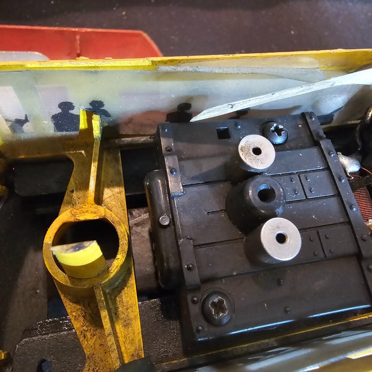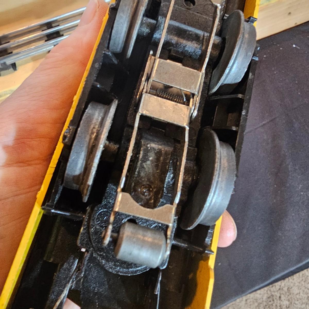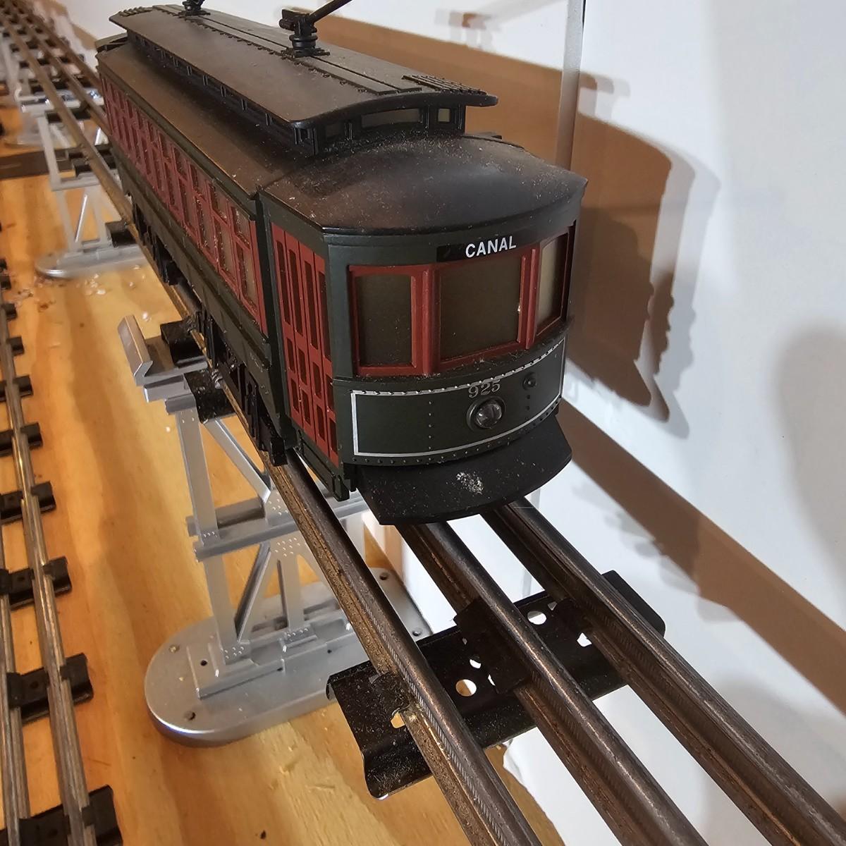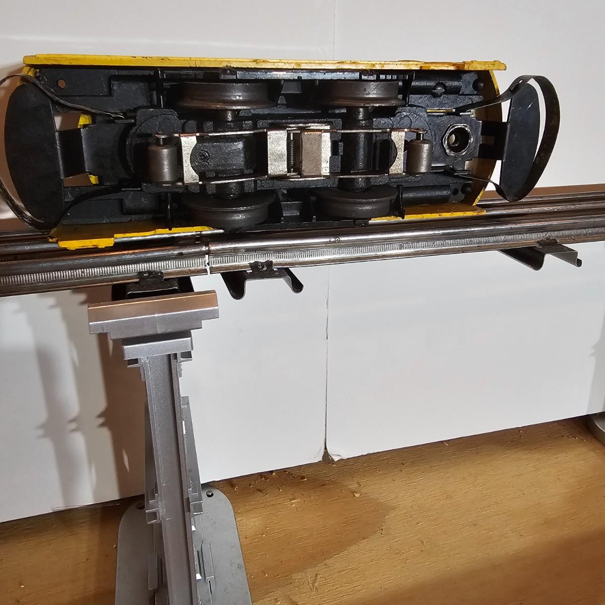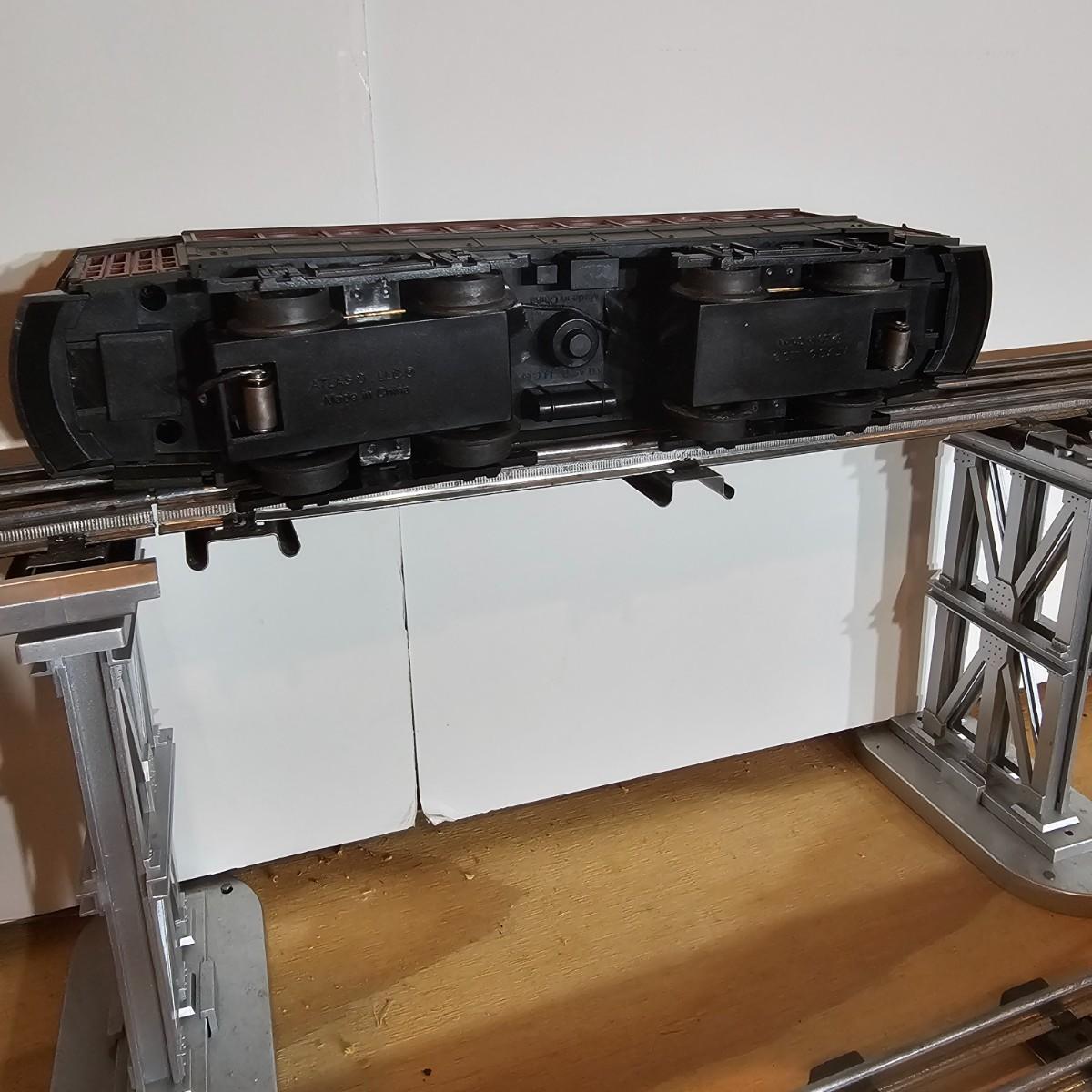 One old one, one newer one. The yellow and red Lionelville Rapid Transit #60 unit is from the late 1950's in original, has plastic body and roof, tin bumpers and four wheels. It measures 7.5" x 2" x 3"H, may be missing some pieces. Unit started and ran on layout but growls a bit, has interior lighting as well as silhouettes of passengers in windows. No boxes. Other item is an Atlas industrial rail two truck trolley with catenary poles. 9.5" x 2" x 4"H, with original box. Unit started and ran on layout, has interior lights. See photos for details. Shipping available. Please note that any price tag seen on an item was not put there by Sterling Transitions and does not reflect the current value of the item. Any train tracks shown in photos are not included but are available in another lot in this sale.