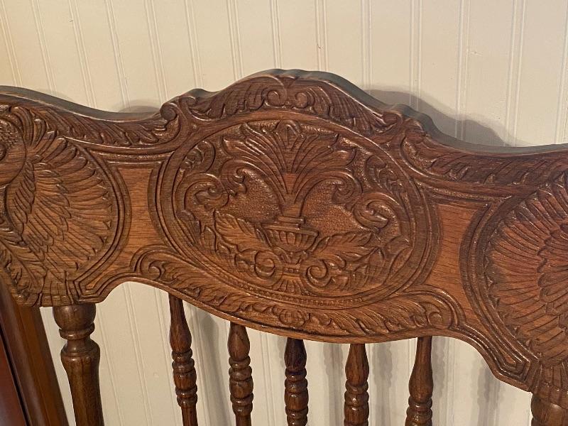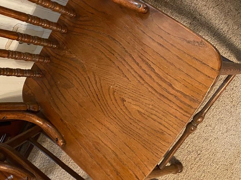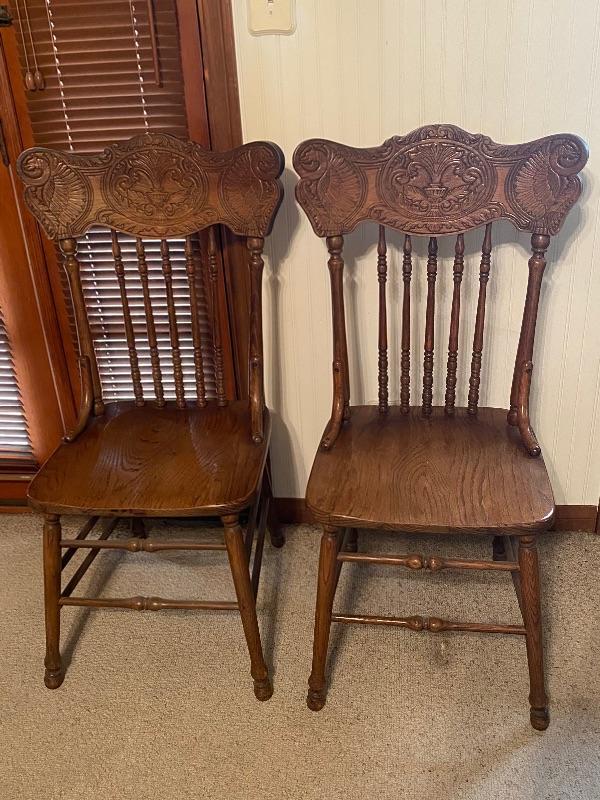 Matching chairs. Medium oak finish. Spindle back. 39” at the top of back, 17” high at the seat. Good condition, signs of normal use wear.