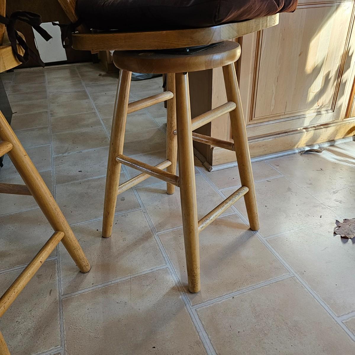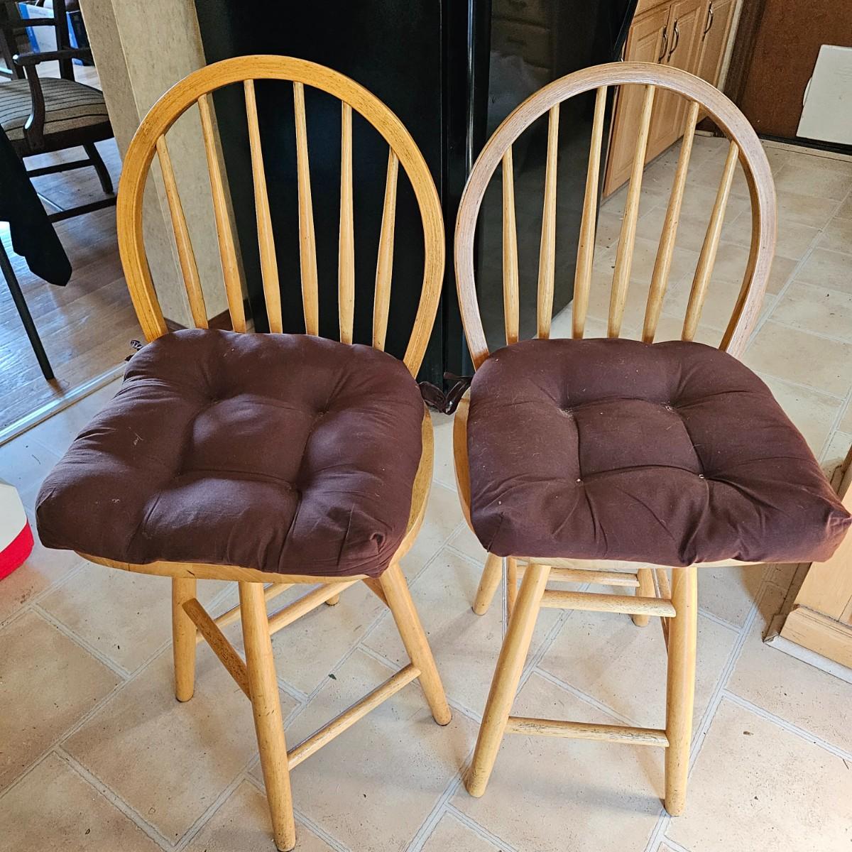 Two round back oak kitchen stools with spindles and swivel seats in a light color finish. These chairs measure 17.5" x 18" x 40"H with 24" seat height. Minor wear on foot rungs, see photos for details. Local pickup only.